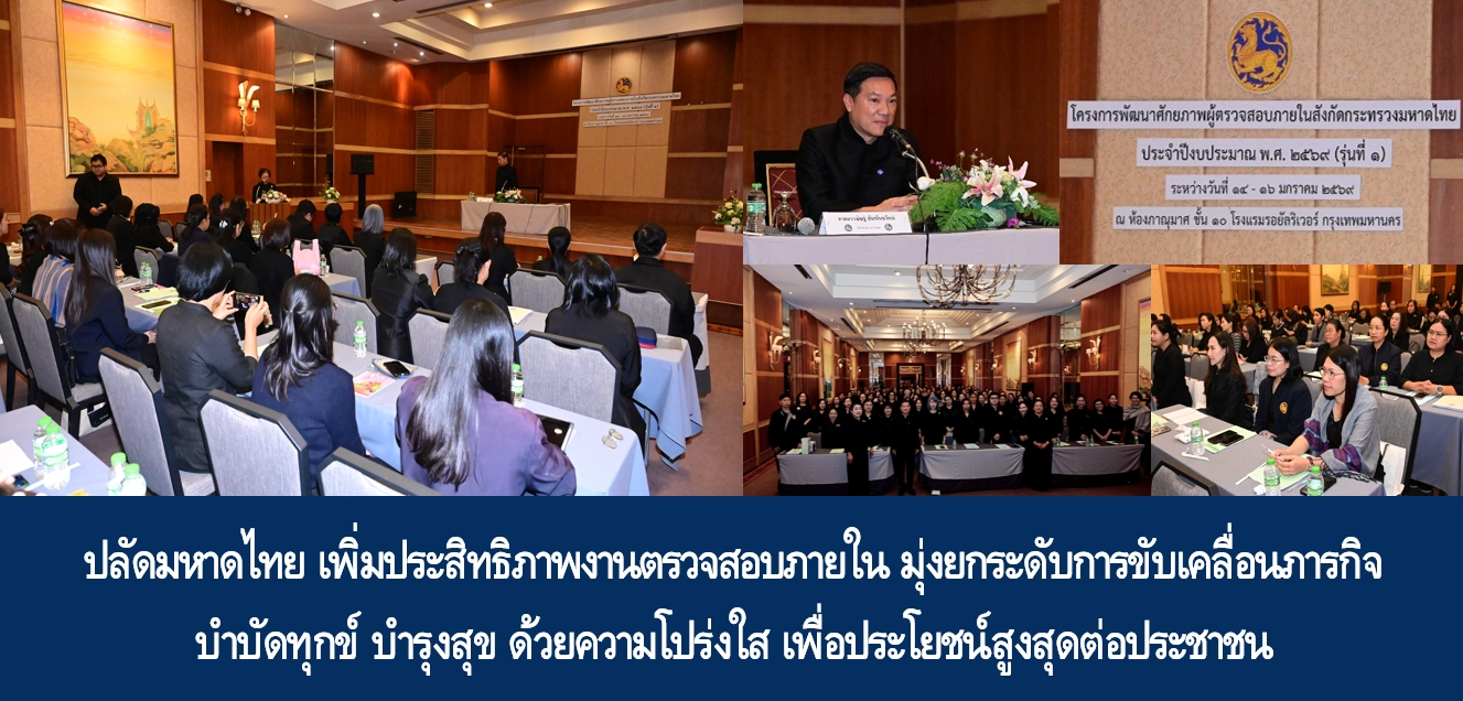 ปลัดกระทรวงมหาดไทย กล่าวว่า กระทรวงมหาดไทยมีภารกิจในการ “บำบัดทุกข์ บำรุงสุข” ซึ่งการดำเนินภารกิจในทุกขั้นตอนต้องมีความโปร่งใส ตรวจสอบได้ ซึ่ง “งานตรวจสอบภายในเป็นเครื่องมือสำคัญของฝ่ายบริหาร” ในการตรวจสอบ ติดตาม และประเมินผลการดำเนินงานของส่วนราชการให้เป็นไปตามเป้าหมายที่กำหนด ดังนั้น ผู้ตรวจสอบภายในจำเป็นต้องมีการพัฒนาศักยภาพของตนเองอย่างสม่ำเสมอและต่อเนื่อง เพื่อให้มีทักษะการปฏิบัติงานเป็นที่ยอมรับและน่าเชื่อถือ และต้องมีความรู้อย่างเพียงพอที่จะสามารถประเมินความเสี่ยงของการเกิดทุจริต และให้แนวทางในการบริหารจัดการการทุจริตของส่วนราชการให้เกิดประสิทธิผลของการกำกับดูแล การบริหารความเสี่ยง และการควบคุม เพื่อลดโอกาสหรือความเป็นไปได้ที่จะก่อให้เกิดการทุจริตในการบริหารราชการต่อไป