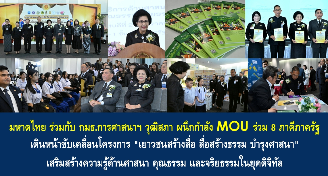 การลงนามบันทึกข้อตกลงในครั้งนี้ นับเป็นก้าวสำคัญของความร่วมมือในการพัฒนาเยาวชนไทยให้มีทักษะด้านสื่อดิจิทัลควบคู่กับคุณธรรม จริยธรรม และการบำรุงรักษาศาสนา อันจะนำไปสู่การสร้างสังคมไทยที่เข้มแข็งและยั่งยืนในระยะยาว โดยมี นางเอมอร ศรีกงพาน ประธานคณะกรรมาธิการการศาสนา คุณธรรม จริยธรรม ศิลปะและวัฒนธรรม วุฒิสภา เป็นประธาน พร้อมด้วยผู้แทน 8 หน่วยงานภาคีเครือข่าย ประกอบด้วย กระทรวงการท่องเที่ยวและกีฬา กระทรวงอุดมศึกษา วิทยาศาสตร์ วิจัย และนวัตกรรม กระทรวงดิจิทัลเพื่อเศรษฐกิจและสังคม กระทรวงมหาดไทย กระทรวงวัฒนธรรม กระทรวงศึกษาธิการ กรมประชาสัมพันธ์ และกรุงเทพมหานคร ร่วมลงนาม