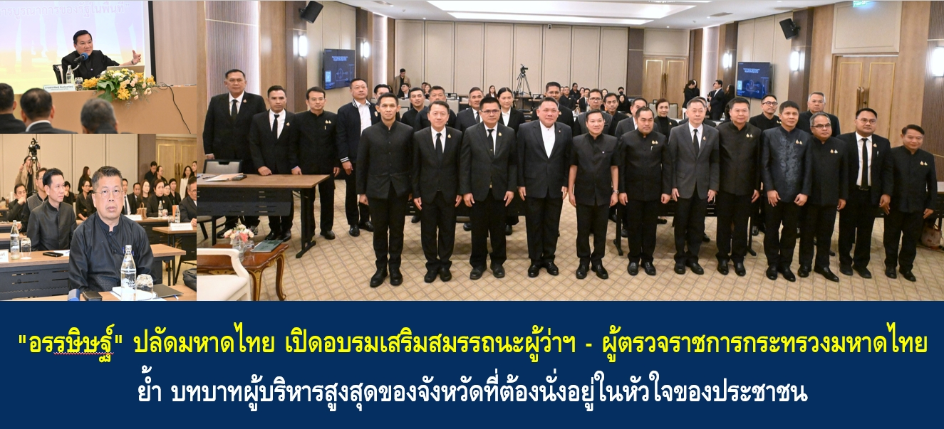 วันนี้ (11 ก.พ. 69) เวลา 10.10 น. นายอรรษิษฐ์ สัมพันธรัตน์ ปลัดกระทรวงมหาดไทย เป็นประธานเปิดโครงการศึกษาอบรมเพื่อเสริมสมรรถนะผู้บริหารระดับสูงของกระทรวงมหาดไทย เพื่อมุ่งสู่ความเป็นเลิศ ประจำปีงบประมาณ พ.ศ. 2569 พร้อมบรรยายพิเศษในหัวข้อ “ผู้ว่าราชการจังหวัดในความคาดหวังของผู้บริหาร” โดยมี นายพรพจน์ เพ็ญพาส อธิบดีกรมที่ดิน พร้อมด้วย รองอธิบดี และผู้บริหารกระทรวงมหาดไทย ร่วมเป็นเกียรติในพิธีเปิดโครงการฯ และผู้ว่าราชการจังหวัดและผู้ตรวจราชการกระทรวงมหาดไทยที่ได้รับการแต่งตั้ง จำนวน 22 ท่าน เข้าร่วมการอบรม ณ โรงแรมรอยัลปริ้นเซส หลานหลวง กรุงเทพฯ