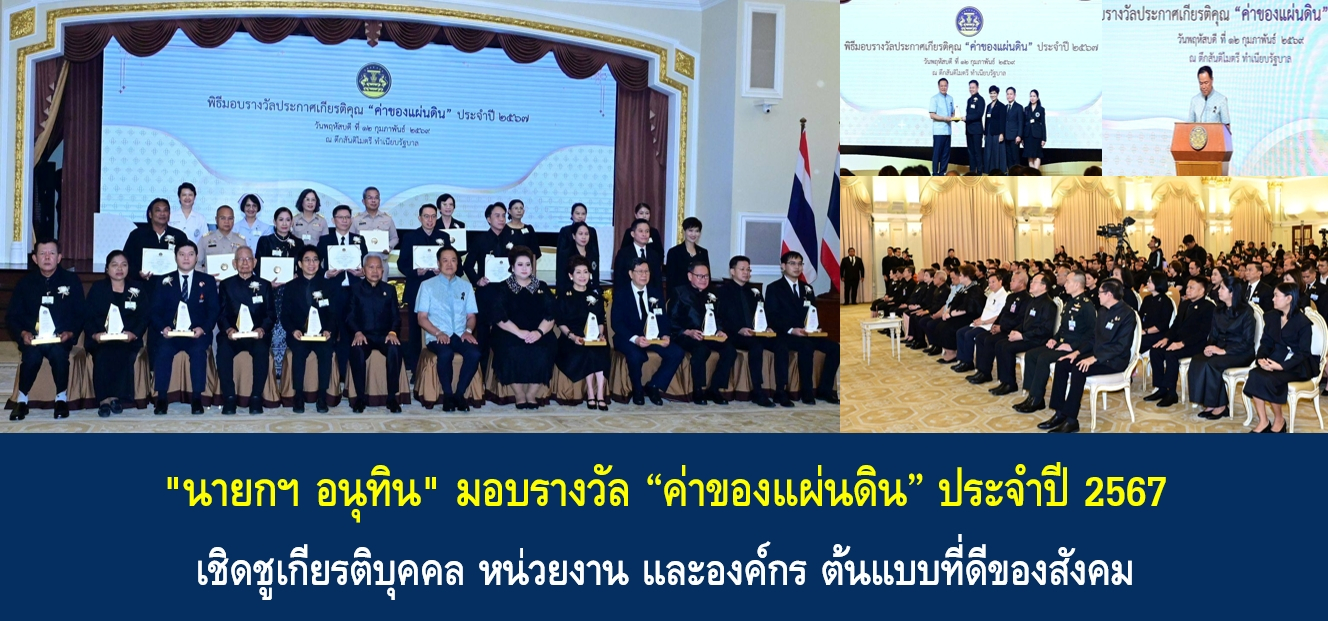 วันนี้ (12 ก.พ. 69) เวลา 09.30 น. ที่ตึกสันติไมตรี ทำเนียบรัฐบาล นายอนุทิน ชาญวีรกูล นายกรัฐมนตรีและรัฐมนตรีว่าการกระทรวงมหาดไทย เป็นประธานในพิธีมอบรางวัลประกาศเกียรติคุณ “ค่าของแผ่นดิน” ประจำปี 2567 โดยมี นายโสภณ ซารัมย์ รองนายกรัฐมนตรี นางสาวศุภมาส อิศรภักดี รัฐมนตรีประจำสำนักนายกรัฐมนตรี นายอรรษิษฐ์ สัมพันธรัตน์ ปลัดกระทรวงมหาดไทย นางยุพา ทวีวัฒนะกิจบวร ปลัดประจำสำนักนายกรัฐมนตรี พร้อมด้วยหัวหน้าส่วนราชการที่เกี่ยวข้อง และผู้เข้ารับรางวัล 18 คน เข้าร่วมพิธี