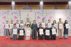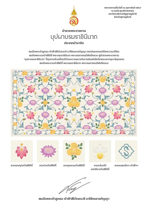 “ผ้าลายบุปผาบรมราชินีนาถ” เป็นลายพระราชทาน ประจำปี 2569 ที่สมเด็จพระเจ้าลูกเธอ เจ้าฟ้าสิริวัณณวรี นารีรัตนราชกัญญา ทรงต่อยอดดอกไม้พระนามาภิไธย สมเด็จพระนางเจ้าสิริกิติ์ พระบรมราชินีนาถ พระบรมราชชนนีพันปีหลวง สู่ผ้าลายพระราชทาน “บุปผาบรมราชินีนาถ” ที่ทุกลายล้วนเปี่ยมไปด้วยความหมายในการน้อมสำนึกถึงพระมหากรุณาธิคุณของสมเด็จพระนางเจ้าสิริกิติ์ พระบรมราชินีนาถ พระบรมราชชนนีพันปีหลวง ประกอบด้วย ลายดอนญ่าควีนสิริกิติ์ ลายบัวควีนสิริกิติ์ ลายกุหลาบควีนสิริกิติ์ ลายกล้วยไม้แคทลียาควีนสิริกิติ์ และลายขอสมเด็จฯ-เจ้าฟ้าฯ พระราชทานเมื่อวันที่ 20 กุมภาพันธ์ 2569 ณ มหาวิทยาลัยราชภัฏสุราษฎร์ธานี