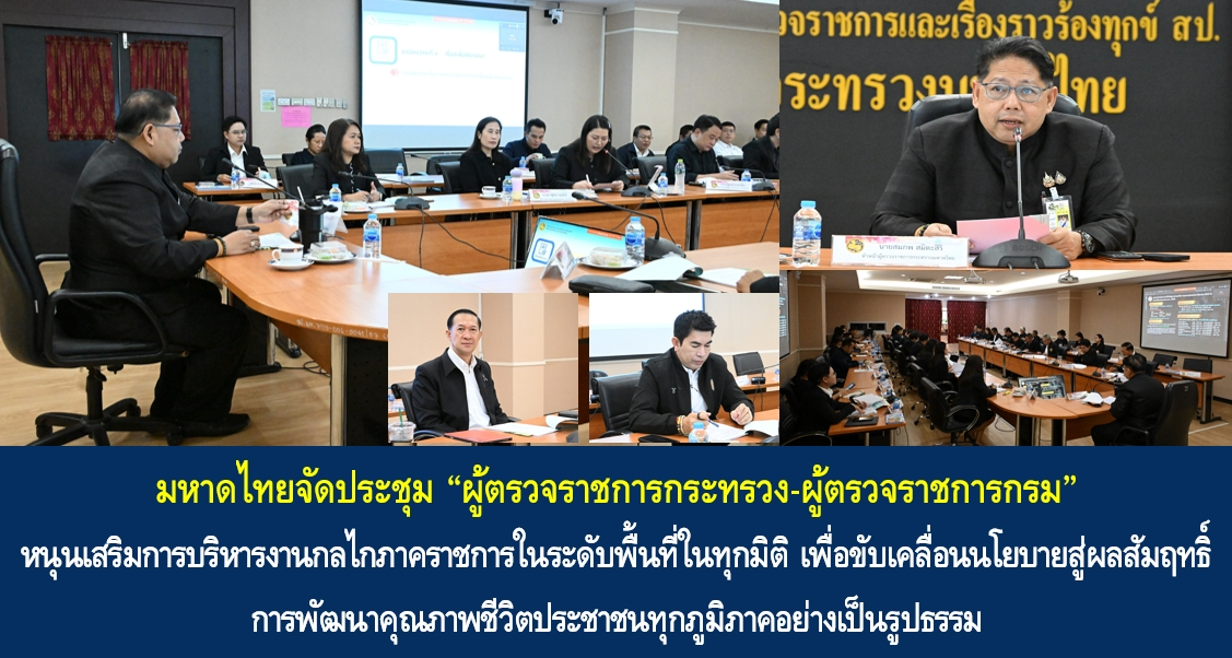 การประชุมผู้ตรวจราชการกระทรวงมหาดไทยในครั้งนี้ ได้มีการพิจารณาแผนการตรวจและประเด็นเน้นย้ำการปฏิบัติราชการของส่วนราชการและหน่วยงานในสังกัดกระทรวงมหาดไทยทั้งในส่วนกลาง และส่วนภูมิภาค ตามนโยบายรัฐบาลและกระทรวงมหาดไทย ได้แก่ 1. ภารกิจด้านกิจการความมั่นคงภายใน อาทิ การป้องกันและแก้ไขปัญหายาเสพติด โครงการสนับสนุนการปฏิบัติงานศูนย์ปฏิบัติการอำเภอในการแก้ไขปัญหาจังหวัดชายแดนภาคใต้ 2. ภารกิจด้านพัฒนาชุมชนและส่งเสริมการปกครองท้องถิ่น อาทิ การขึ้นทะเบียนศูนย์เรียนรู้การพัฒนาคุณภาพชีวิตตามหลักทฤษฎีใหม่ ประยุกต์สู่ “โคก หนอง นา” การส่งเสริม OTOP ก้าวสู่ออนไลน์และ Modern Trade และแผนปฏิบัติการจัดการขยะมูลฝอยชุมชน “จังหวัดสะอาด” ประจำปี พ.ศ. 2569 3. ภารกิจด้านสาธารณภัยและพัฒนาเมือง อาทิ แนวทางการป้องกันและแก้ไขปัญหาไฟป่า หมอกควัน และฝุ่นละอองขนาดเล็ก (PM2.5) และการเตรียมการป้องกันและแก้ไขปัญหาภัยแล้ง ปี 2569 และ 4. ภารกิจด้านบริหาร อาทิ การบริหารสินทรัพย์ของจังหวัดและกลุ่มจังหวัด