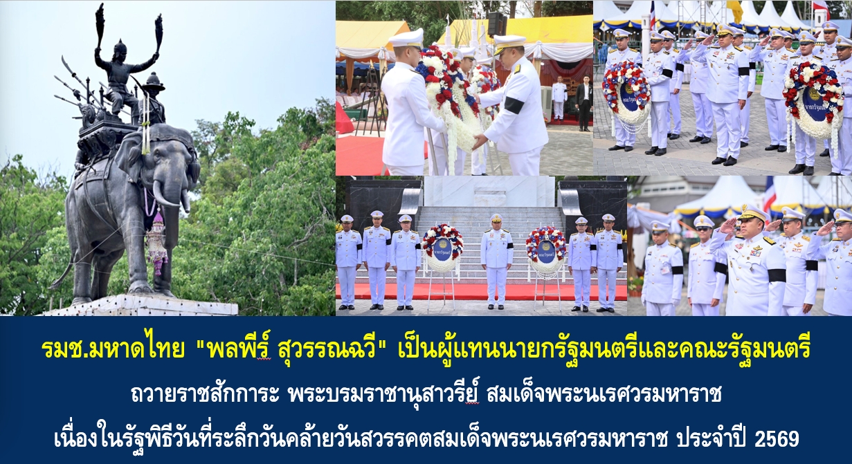 วันนี้ (25 เม.ย. 69) เวลา 09.15 น. นายพลพีร์ สุวรรณฉวี รัฐมนตรีช่วยว่าการกระทรวงมหาดไทย เป็นผู้แทนนายกรัฐมนตรีและคณะรัฐมนตรี วางพวงมาลาถวายราชสักการะพระบรมราชานุสาวรีย์สมเด็จพระนเรศวรมหาราช เนื่องในรัฐพิธีวันที่ระลึกวันคล้ายวันสวรรคตสมเด็จพระนเรศวรมหาราช ประจำปี 2569 ณ พระบรมราชานุสรณ์ดอนเจดีย์ อ.ดอนเจดีย์ จ.สุพรรณบุรี โดยมี นายณัฐพงษ์ สงวนจิตร ผู้ว่าราชการจังหวัดสุพรรณบุรี นายอธิสรรค์ อินทร์ตรา ผู้ตรวจราชการกระทรวงมหาดไทย นายวรัตม์ มาประณีต รองผู้ว่าราชการจังหวัดสุพรรณบุรี นายกลวัชร ทรัพย์ส่งสุข รองผู้ว่าราชการจังหวัดสุพรรณบุรี นายกัมปนาท กลิ่นเสาวคนธ์ ปลัดจังหวัดสุพรรณบุรี นายเดชะ สิทธิสุทธิ์ หัวหน้าสำนักงานจังหวัดสุพรรณบุรี พร้อมด้วยนายอำเภอ ข้าราชการ ทหาร ตำรวจ แม่บ้านมหาดไทย ร่วมพิธี