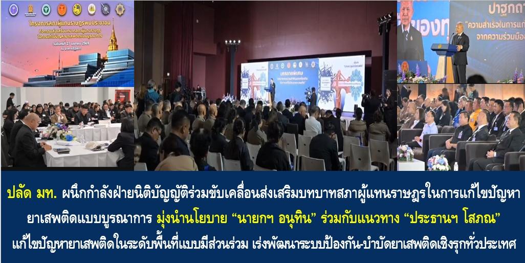 ปลัดกระทรวงมหาดไทย เปิดเผยว่า รัฐบาล ภายใต้การนำของนายอนุทิน ชาญวีรกูล นายกรัฐมนตรีและรัฐมนตรีว่าการกระทรวงมหาดไทย ได้เน้นย้ำให้กระทรวงมหาดไทย ขับเคลื่อนภารกิจด้านการป้องกันและปราบปรามยาเสพติดอย่างเข้มข้นต่อเนื่องด้วยกลไกในระดับพื้นที่ทั้ง 878 อำเภอ ใน 76 จังหวัด ทั้งนี้ “ภัยยาเสพติด” ถือเป็นวาระแห่งชาติที่รัฐบาลเดินหน้าปฏิบัติการปราบปรามอย่างเด็ดขาด ดังผลการปฏิบัติที่ผ่านมาซึ่งฝ่ายปกครองได้ร่วมกับสำนักงานตำรวจแห่งชาติ ตลอดจนสำนักงาน ป.ป.ส. และกระทรวงสาธารณสุข บูรณาการทุกภาคีเครือข่าย จับกุมผู้กระทำผิด ควบคู่การบำบัดรักษาผู้เสพยาเสพติด และเดินหน้าค้นหาผู้กระทำผิดมาดำเนินคดีตามกฎหมายอย่างต่อเนื่อง ซึ่งการร่วมเป็นภาคีเครือข่ายในการจัดกิจกรรมส่งเสริมบทบาทสภาผู้แทนราษฎรในการแก้ไขปัญหายาเสพติดแบบบูรณาการ ปี 2569 ของท่านประธานสภาผู้แทนราษฎรและประธานรัฐสภาในครั้งนี้ ถือเป็นก้าวสำคัญของการทำงานร่วมกันระหว่างฝ่ายนิติบัญญัติซึ่งมีหน้าที่ในการตรากฎหมาย กับฝ่ายบริหาร ซึ่งมีหน้าที่ในการบริหารราชการแผ่นดิน โดยกระทรวงมหาดไทยยืนยันในการเป็นภาคีเครือข่ายเพื่อมุ่งเสริมสร้างความผาสุกให้กับสังคมไทยด้วยการขจัดยาเสพติดให้หมดไปจากทุกอณูผืนแผ่นดินไทยตามนโยบายของนายอนุทิน ชาญวีรกูล นายกรัฐมนตรีและรัฐมนตรีว่าการกระทรวงมหาดไทย