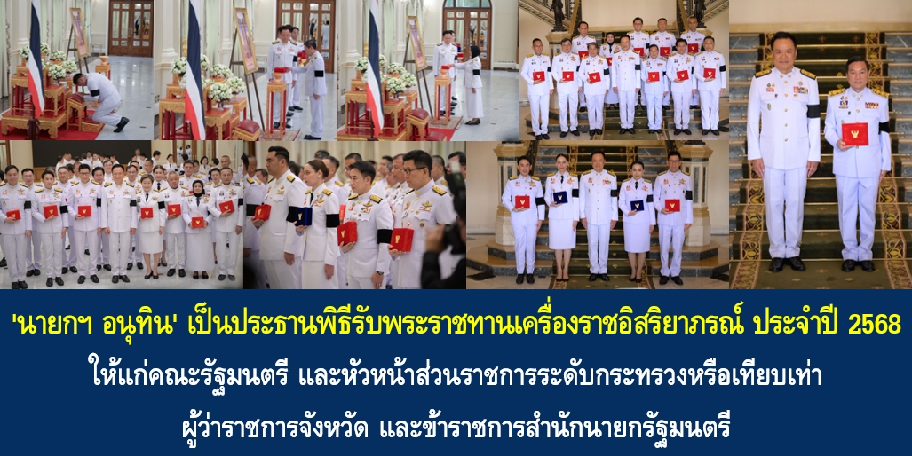 วันนี้ (28 เม.ย. 69) เวลา 08.30 น. นายอนุทิน ชาญวีรกูล นายกรัฐมนตรีและรัฐมนตรีว่าการกระทรวงมหาดไทย เป็นประธานพิธีรับพระราชทานเครื่องราชอิสริยาภรณ์ ประจำปี 2568 ของคณะรัฐมนตรี อดีตรัฐมนตรี หัวหน้าส่วนราชการระดับกระทรวงหรือเทียบเท่า ผู้บริหารระดับสูงของกระทรวงมหาดไทย ผู้ว่าราชการจังหวัด และข้าราชการสำนักเลขาธิการนายกรัฐมนตรี ณ ตึกภักดีบดินทร์ ทำเนียบรัฐบาล