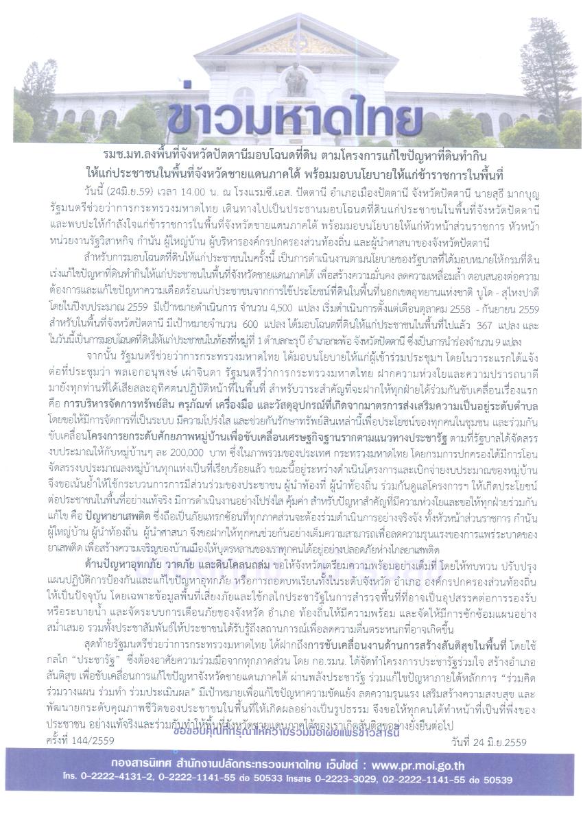 ข่าวมหาดไทย รมช.มท.ลงพื้นที่จังหวัดปัตตานีมอบโฉนดที่ดิน ตามโครงการแก้ไขปัญหาที่ดินทำกิน ให้แก่ประชาชนในพื้นที่จังหวัดชายแดนภาคใต้ พร้อมมอบนโยบายให้แก่ข้าราชการในพื้นที่ โดย กองสารนิเทศ สำนักงานปลัดกระทรวงมหาดไทย 24 มิถุนายน 2016 24 มิถุนายน 2016 5 ยอดวิว ก่อนหน้า ชุดคำพูด 63-65 ประจำวันที่ 23 มิ.ย. 59 ถัดไป กระทรวงมหาดไทย สั่งผู้ว่าฯ ทั่วประเทศ หนุนแคมเปญท่องเที่ยววิถีไทย เร่งส่งเสริมการท่องเที่ยวในพื้นที่จังหวัดอย่างสมดุลทุกมิติ เพื่อกระจายรายได้สู่ท้องถิ่น – ชุมชน บทความที่เกี่ยวข้อง “มหาดไทย” ยกระดับเพิ่มประสิทธิภาพการตร... 15 ธันวาคม 2025 “รมช.มท.ก้อย-ศศิธร” แถลงข่าวมหกรรมของข... 15 ธันวาคม 2025 “อรรษิษฐ์ สัมพันธรัตน์” ปลัด มท. ประกา... 15 ธันวาคม 2025 สมเด็จพระกนิษฐาธิราชเจ้า กรมสมเด็จพระเทพรัตนราชสุด... 15 ธันวาคม 2025 มท.4 “ศศิธร” ลงพื้นที่ จ.เชียงใหม่ เปิ... 14 ธันวาคม 2025 “รมช.มท.ศักดิ์ดา” แถลง “ปิดกองบัญชาการ ปภ.ชาติ ส่ว... 14 ธันวาคม 2025 ผู้บัญชาการกองอาสารักษาดินแดน ขอบคุณและชื่นชมความเ... 13 ธันวาคม 2025 “รมช.มหาดไทย ศศิธร” เป็นประธานประชุมรัฐมนตรีอาเซีย... 13 ธันวาคม 2025 คกก.นโยบายลดอุบัติเหตุทางถนนแห่งชาติ เห็นชอบขับเคล... 12 ธันวาคม 2025