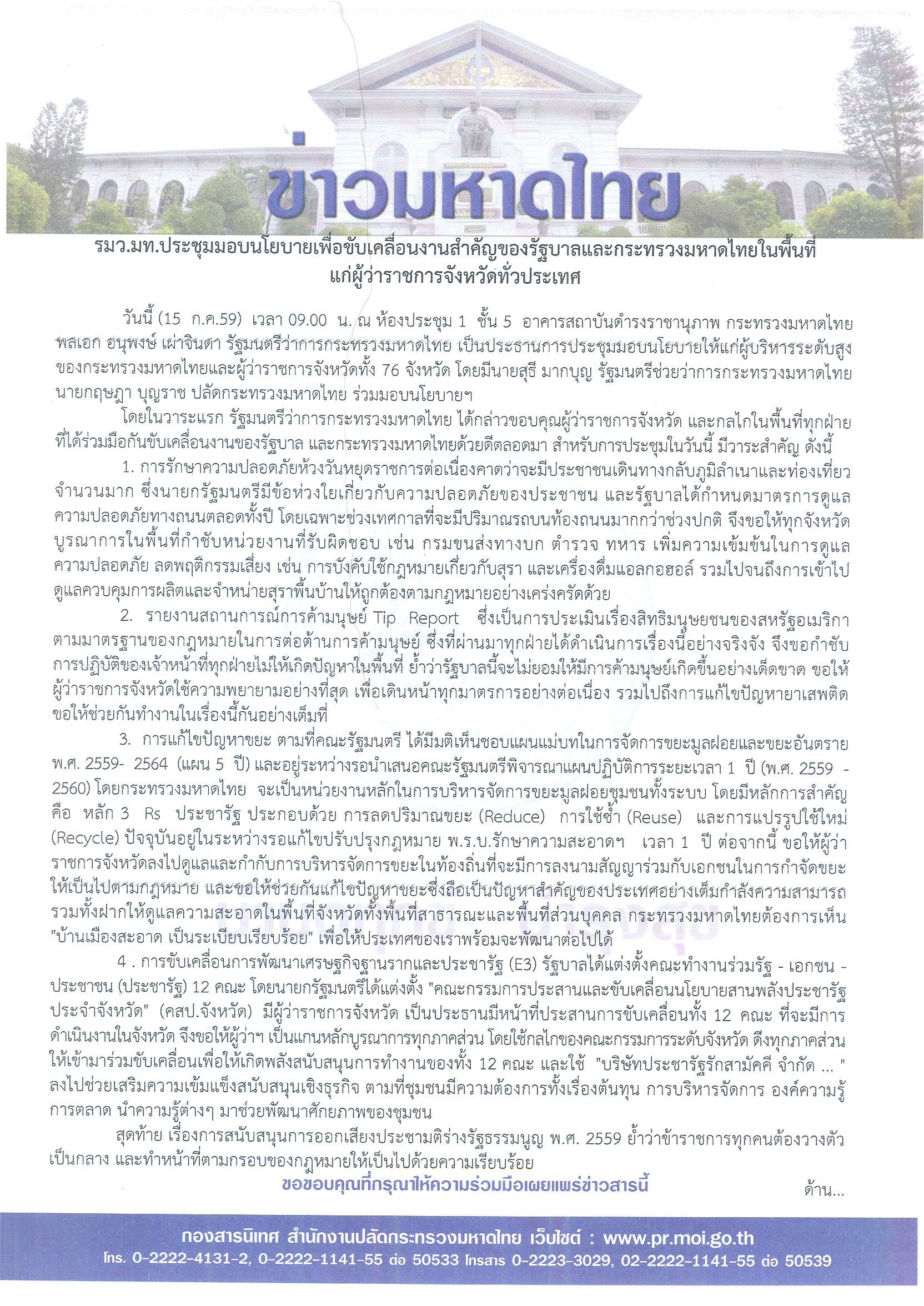 ข่าวมหาดไทย รมว.มท.ประชุมมอบนโยบายเพื่อขับเคลื่อนงานสำคัญของรัฐบาลและกระทรวงมหาดไทยในพื้นที่แก่ผู้ว่าราชการจังหวัดทั่วประเทศ โดย กองสารนิเทศ สำนักงานปลัดกระทรวงมหาดไทย 15 กรกฎาคม 2016 15 กรกฎาคม 2016 9 ยอดวิว ก่อนหน้า มท.1 ตรวจเยี่ยมการให้บริการประชาชนของกรมการปกครอง (วังไชยา) ถัดไป รัฐมนตรีช่วยว่าการกระทรวงมหาดไทยเป็นประธานในพิธีเปิดงานมหกรรมเจ้าพระยา – ป่าสัก EXPO 2016 ผนึกกำลังภาครัฐ – เอกชนเร่งส่งเสริมการท่องเที่ยวกระตุ้นเศรษฐกิจในพื้นที่ภาคกลางตอนบน 2 บทความที่เกี่ยวข้อง “ปลัดมหาดไทย” เผย กรมบัญชีกลางอนุมัติข... 8 ธันวาคม 2025 “นายกฯ อนุทิน” ประชุมติดตามสถานการณ์ชา... 8 ธันวาคม 2025 รมช.มหาดไทย “ศักดิ์ดา” ประชุมติดตามสถา... 8 ธันวาคม 2025 “ศักดิ์ดา” รมช.มหาดไทย ติดตามสถานการณ์... 8 ธันวาคม 2025 ไทยเดินหน้าความพร้อมเป็นเจ้าภาพประชุมรัฐมนตรีอาเซี... 8 ธันวาคม 2025 ประเทศไทยพร้อมเป็นเจ้าภาพการประชุมรัฐมนตรีอาเซียนด... 8 ธันวาคม 2025 📌มท.ศักดิ์ดา นั่งหัวโต๊ะกองบัญชาการป้องกัน... 7 ธันวาคม 2025 “นายกฯ อนุทิน” นำคณะ มอบถุงยังชีพและให... 6 ธันวาคม 2025 “นายกฯ อนุทิน” นำคณะลงพื้นที่ติดตามบรร... 6 ธันวาคม 2025