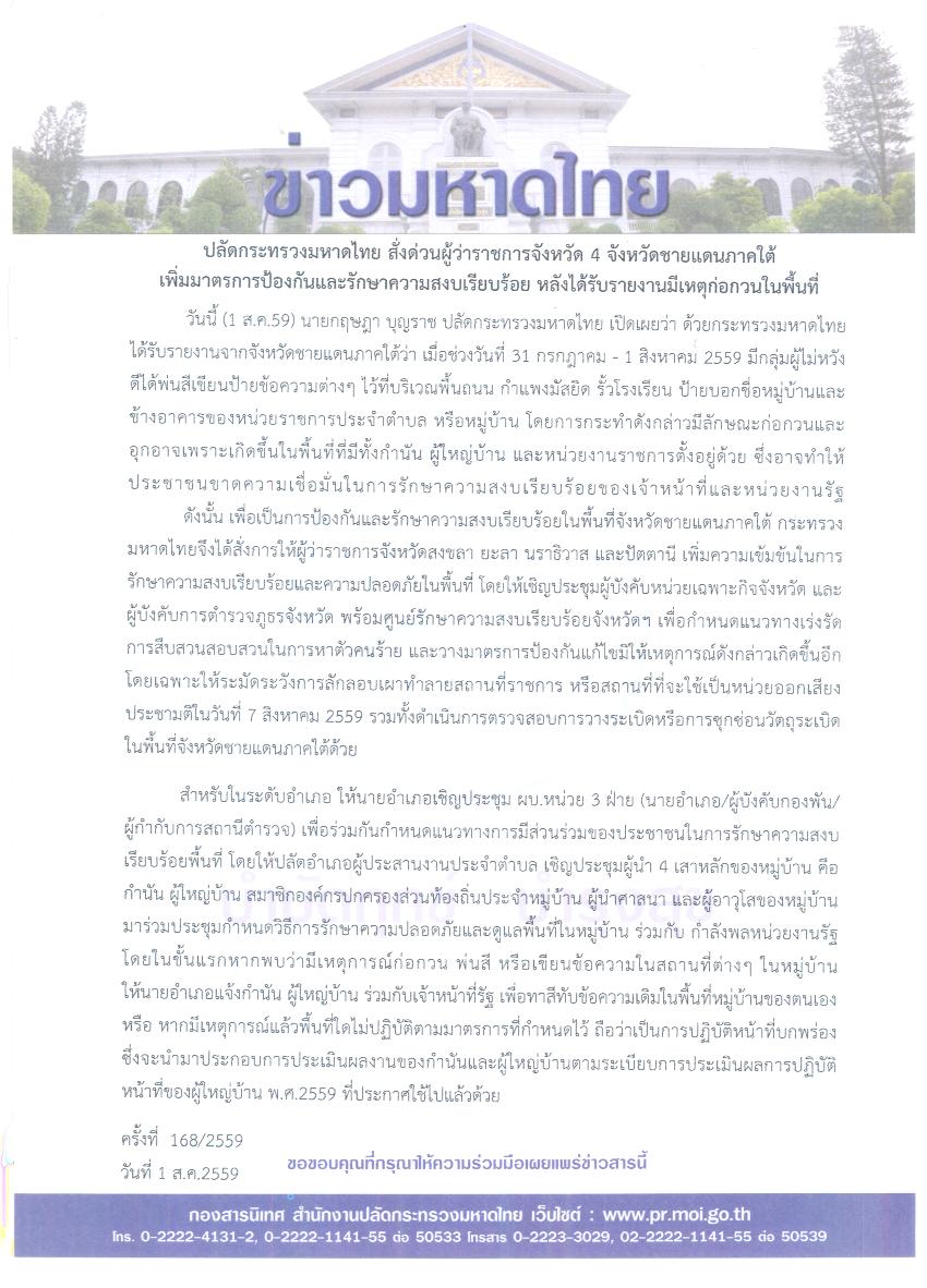 ข่าวมหาดไทย ปลัดกระทรวงมหาดไทย สั่งด่วนผู้ว่าราชการจังหวัด 4 จังหวัดชายแดนภาคใต้ เพิ่มมาตรการป้องกันและรักษาความสงบเรียบร้อย หลังได้รับรายงานมีเหตุก่อกวนในพื้นที่ โดย กองสารนิเทศ สำนักงานปลัดกระทรวงมหาดไทย 4 สิงหาคม 2016 4 สิงหาคม 2016 28 ยอดวิว ก่อนหน้า ปลัดกระทรวงมหาดไทยลงพื้นที่จังหวัดสระแก้วเป็นประธานเปิดการประชุมเชิงปฏิบัติการสร้างค่านิยมคนไทยและการดำเนินชีวิตตามหลักปรัชญาของเศรษฐกิจพอเพียง ถัดไป รมว.มท. เผยโครงการหมู่บ้านละ 2 แสน สำเร็จตามเป้าหมาย 99 % กระจายเม็ดเงินกระตุ้นเศรษฐกิจในระดับฐานรากกว่า 1.4 หมื่นล้านบาท บทความที่เกี่ยวข้อง “มหาดไทย” ยกระดับเพิ่มประสิทธิภาพการตร... 15 ธันวาคม 2025 “รมช.มท.ก้อย-ศศิธร” แถลงข่าวมหกรรมของข... 15 ธันวาคม 2025 “อรรษิษฐ์ สัมพันธรัตน์” ปลัด มท. ประกา... 15 ธันวาคม 2025 สมเด็จพระกนิษฐาธิราชเจ้า กรมสมเด็จพระเทพรัตนราชสุด... 15 ธันวาคม 2025 มท.4 “ศศิธร” ลงพื้นที่ จ.เชียงใหม่ เปิ... 14 ธันวาคม 2025 “รมช.มท.ศักดิ์ดา” แถลง “ปิดกองบัญชาการ ปภ.ชาติ ส่ว... 14 ธันวาคม 2025 ผู้บัญชาการกองอาสารักษาดินแดน ขอบคุณและชื่นชมความเ... 13 ธันวาคม 2025 “รมช.มหาดไทย ศศิธร” เป็นประธานประชุมรัฐมนตรีอาเซีย... 13 ธันวาคม 2025 คกก.นโยบายลดอุบัติเหตุทางถนนแห่งชาติ เห็นชอบขับเคล... 12 ธันวาคม 2025