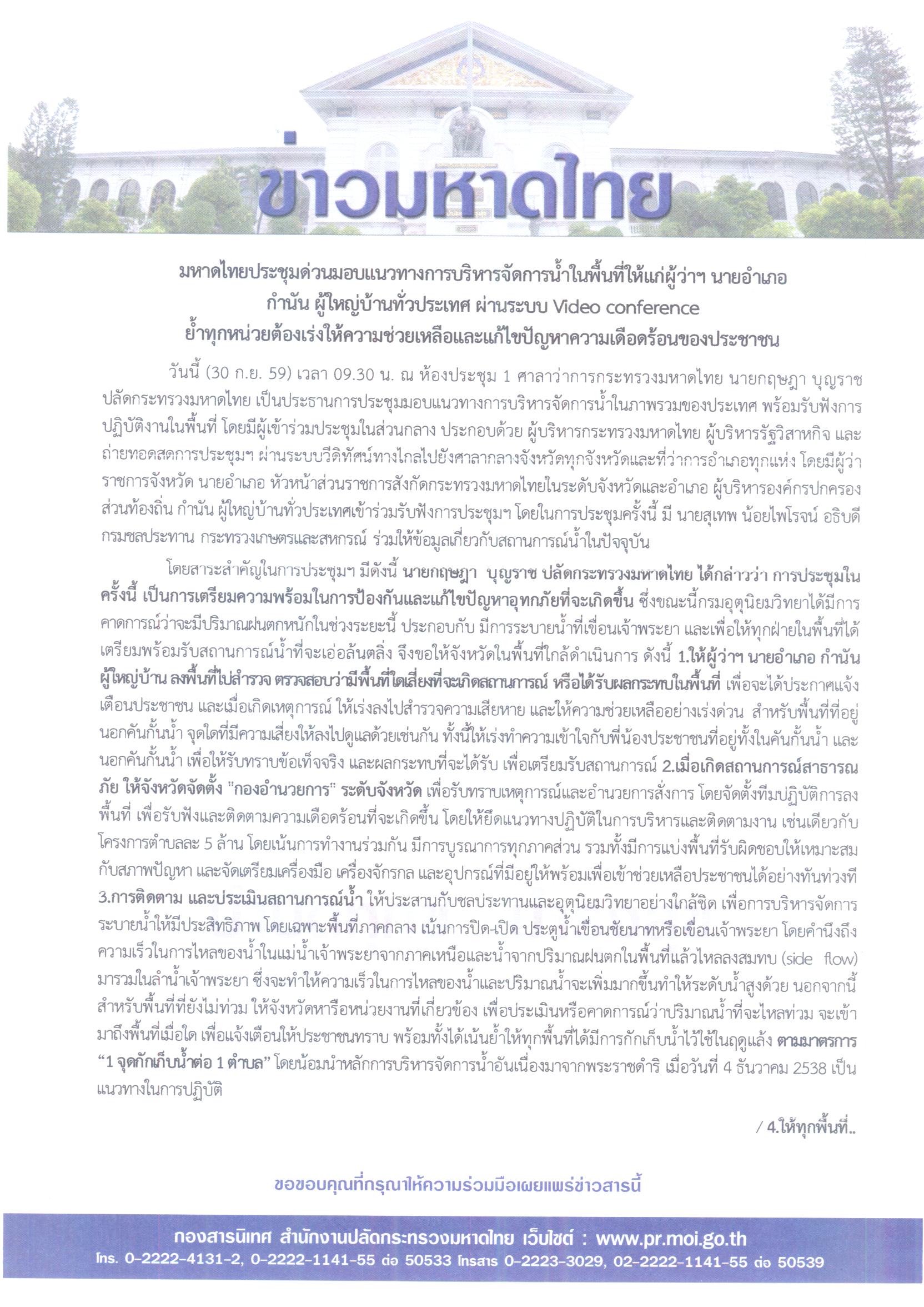ข่าวมหาดไทย มหาดไทยประชุมด่วนมอบแนวทางการบริหารจัดการน้ำในพื้นที่ให้แก่ผู้ว่าฯ นายอำเภอ กำนัน ผู้ใหญ่บ้านทั่วประเทศ ผ่านระบบ Video conference ย้ำทุกหน่วยต้องเร่งให้ความช่วยเหลือและแก้ไขปัญหาความเดือดร้อนของประชาชน โดย กองสารนิเทศ สำนักงานปลัดกระทรวงมหาดไทย 2 ตุลาคม 2016 2 ตุลาคม 2016 3 ยอดวิว ก่อนหน้า กระทรวงมหาดไทย สั่งด่วนถึงผู้ว่าราชการจังหวัด ชี้แจงแนวทางการบริหารจัดการน้ำที่ท่วมอยู่ในหลายจังหวัด แนะการผลักดันน้ำ – หาพื้นที่รับน้ำ ต้องคำนึงถึงผลกระทบที่จะเกิดต่อประชาชนเป็นสำคัญ ถัดไป กระทรวงมหาดไทย ประชุมด่วนผู้ว่าราชการจังหวัดทั่วประเทศ ผ่านระบบ Video Conference สั่งการทุกพื้นที่เตรียมรับมือสถานการณ์น้ำ พร้อมจัดทำแผนเผชิญเหตุรองรับหากเกิดสถานการณ์ขั้นวิกฤติ เพื่อลดผลกระทบต่อประชาชน บทความที่เกี่ยวข้อง องคมนตรี เป็นประธานในพิธีบำเพ็ญกุศลอุทิศถวายแด่ พร... 11 ธันวาคม 2025 มท.2 “ทรงศักดิ์ ทองศรี” ลงพื้นที่จังหว... 11 ธันวาคม 2025 “ศักดิ์ดา วิเชียรศิลป์” รมช.มหาดไทย ลงพื้นที... 11 ธันวาคม 2025 มหาดไทย เปิดเวทีแลกเปลี่ยนองค์ความรู้ขับเคลื่อนพัฒ... 11 ธันวาคม 2025 ที่ปรึกษา รมว.มหาดไทย ลงพื้นที่ปราจีนบุรี ตรวจเยี่... 11 ธันวาคม 2025 รมช.มหาดไทย “ศศิธร” ลงพื้นที่ตรัง มอบนโยบายขับเคลื... 11 ธันวาคม 2025 รมช.มหาดไทย “ทรงศักดิ์ ทองศรี” ลงพื้นท... 10 ธันวาคม 2025 รมช.มหาดไทย “ศักดิ์ดา วิเชียรศิลป์” ปร... 10 ธันวาคม 2025 รองปลัด มท. “ภาสกร บุญญลักษม์” ประชุมต... 10 ธันวาคม 2025
