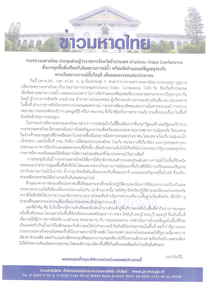 ข่าวมหาดไทย กระทรวงมหาดไทย ประชุมด่วนผู้ว่าราชการจังหวัดทั่วประเทศ ผ่านระบบ Video Conference สั่งการทุกพื้นที่เตรียมรับมือสถานการณ์น้ำ พร้อมจัดทำแผนเผชิญเหตุรองรับหากเกิดสถานการณ์ขั้นวิกฤติ เพื่อลดผลกระทบต่อประชาชน โดย กองสารนิเทศ สำนักงานปลัดกระทรวงมหาดไทย 10 ตุลาคม 2016 10 ตุลาคม 2016 10 ยอดวิว ก่อนหน้า มหาดไทยประชุมด่วนมอบแนวทางการบริหารจัดการน้ำในพื้นที่ให้แก่ผู้ว่าฯ นายอำเภอ กำนัน ผู้ใหญ่บ้านทั่วประเทศ ผ่านระบบ Video conference ย้ำทุกหน่วยต้องเร่งให้ความช่วยเหลือและแก้ไขปัญหาความเดือดร้อนของประชาชน ถัดไป กระทรวงมหาดไทยแจ้งทุกจังหวัด จัดพิธีสวดพระอภิธรรม หรือพิธีกรรมทางศาสนาของแต่ละศาสนา เพื่อให้พี่น้องประชาชนในต่างจังหวัดได้มีส่วนร่วมในพิธีบำเพ็ญพระราชกุศลพร้อมกับในส่วนกลาง บทความที่เกี่ยวข้อง องคมนตรี เป็นประธานในพิธีบำเพ็ญกุศลอุทิศถวายแด่ พร... 11 ธันวาคม 2025 มท.2 “ทรงศักดิ์ ทองศรี” ลงพื้นที่จังหว... 11 ธันวาคม 2025 “ศักดิ์ดา วิเชียรศิลป์” รมช.มหาดไทย ลงพื้นที... 11 ธันวาคม 2025 มหาดไทย เปิดเวทีแลกเปลี่ยนองค์ความรู้ขับเคลื่อนพัฒ... 11 ธันวาคม 2025 ที่ปรึกษา รมว.มหาดไทย ลงพื้นที่ปราจีนบุรี ตรวจเยี่... 11 ธันวาคม 2025 รมช.มหาดไทย “ศศิธร” ลงพื้นที่ตรัง มอบนโยบายขับเคลื... 11 ธันวาคม 2025 รมช.มหาดไทย “ทรงศักดิ์ ทองศรี” ลงพื้นท... 10 ธันวาคม 2025 รมช.มหาดไทย “ศักดิ์ดา วิเชียรศิลป์” ปร... 10 ธันวาคม 2025 รองปลัด มท. “ภาสกร บุญญลักษม์” ประชุมต... 10 ธันวาคม 2025