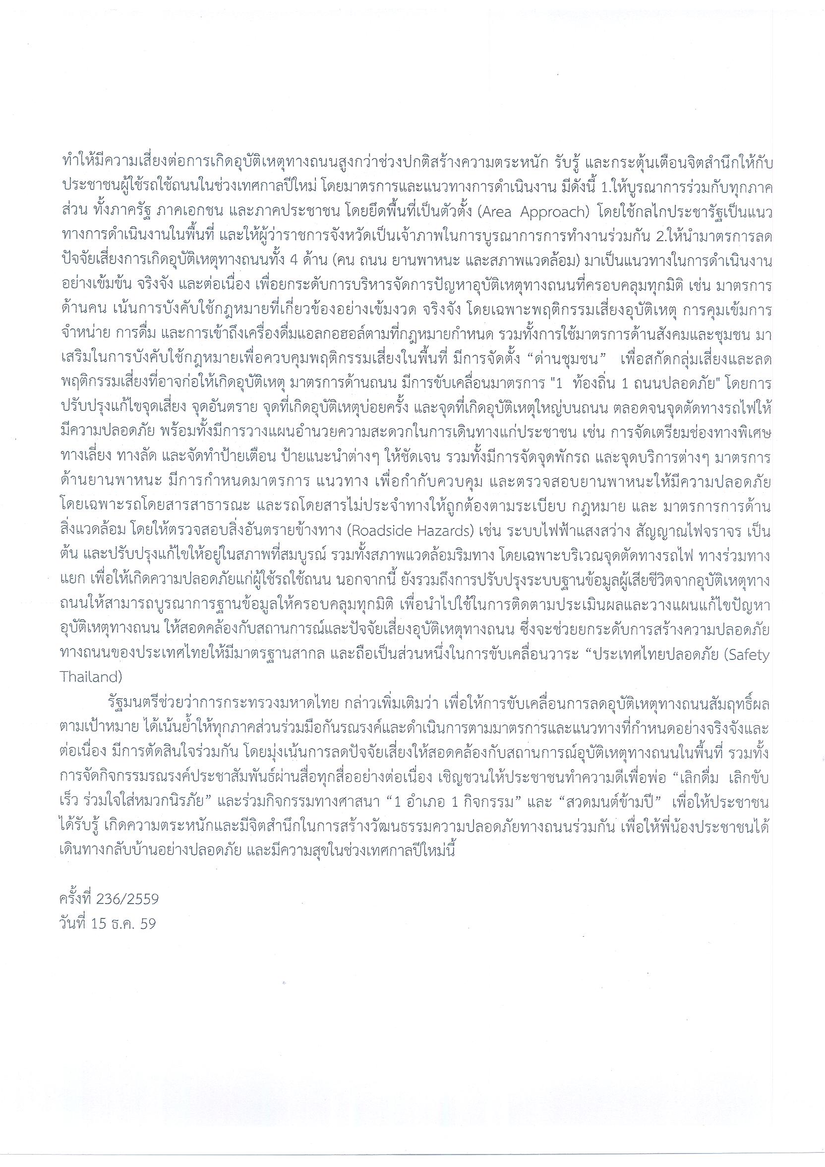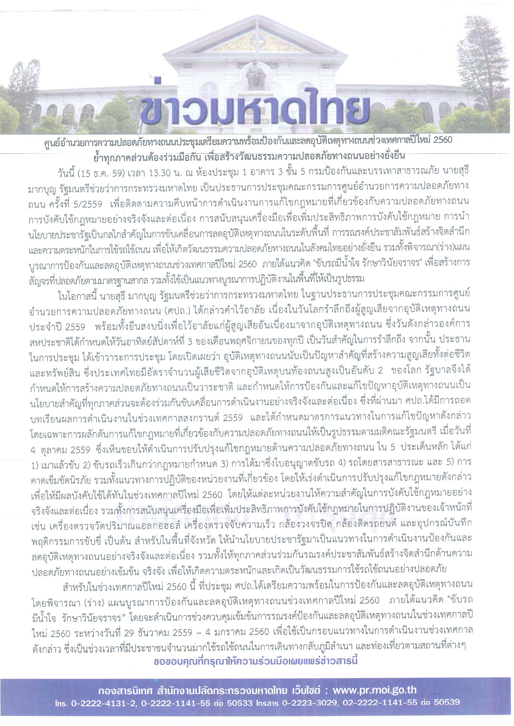 ข่าวมหาดไทย ศูนย์อำนวยการความปลอดภัยทางถนน ประชุมเตรียมความพร้อมป้องกันและลดอุบัติเหตุทางถนน ช่วงเทศกาลปีใหม่ 2560 ย้ำทุกภาคส่วนต้องร่วมมือกัน เพื่อสร้างวัฒนธรรมความปลอดภัยทางถนนอย่างยั่งยืน โดย กองสารนิเทศ สำนักงานปลัดกระทรวงมหาดไทย 13 มกราคม 2017 13 มกราคม 2017 26 ยอดวิว ก่อนหน้า กระทรวงมหาดไทย เดินหน้าแผนประชารัฐร่วมใจสร้างหมู่บ้าน/ชุมชนมั่นคง ปลอดภัยยาเสพติดตั้งเป้าให้ครบทั้ง 81,905 หมู่บ้าน/ชุมชนในปี 2560 ถัดไป รมช.มท. เป็นประธานแถลงข่าวการจัดงาน OTOP CITY 2016 จัดใหญ่ส่งท้ายปี ขนสินค้าโอทอปของขวัญจากภูมิปัญญามาจำหน่ายกว่า 1 หมื่นรายการ บทความที่เกี่ยวข้อง “มหาดไทย” ยกระดับเพิ่มประสิทธิภาพการตร... 15 ธันวาคม 2025 “รมช.มท.ก้อย-ศศิธร” แถลงข่าวมหกรรมของข... 15 ธันวาคม 2025 “อรรษิษฐ์ สัมพันธรัตน์” ปลัด มท. ประกา... 15 ธันวาคม 2025 สมเด็จพระกนิษฐาธิราชเจ้า กรมสมเด็จพระเทพรัตนราชสุด... 15 ธันวาคม 2025 มท.4 “ศศิธร” ลงพื้นที่ จ.เชียงใหม่ เปิ... 14 ธันวาคม 2025 “รมช.มท.ศักดิ์ดา” แถลง “ปิดกองบัญชาการ ปภ.ชาติ ส่ว... 14 ธันวาคม 2025 ผู้บัญชาการกองอาสารักษาดินแดน ขอบคุณและชื่นชมความเ... 13 ธันวาคม 2025 “รมช.มหาดไทย ศศิธร” เป็นประธานประชุมรัฐมนตรีอาเซีย... 13 ธันวาคม 2025 คกก.นโยบายลดอุบัติเหตุทางถนนแห่งชาติ เห็นชอบขับเคล... 12 ธันวาคม 2025