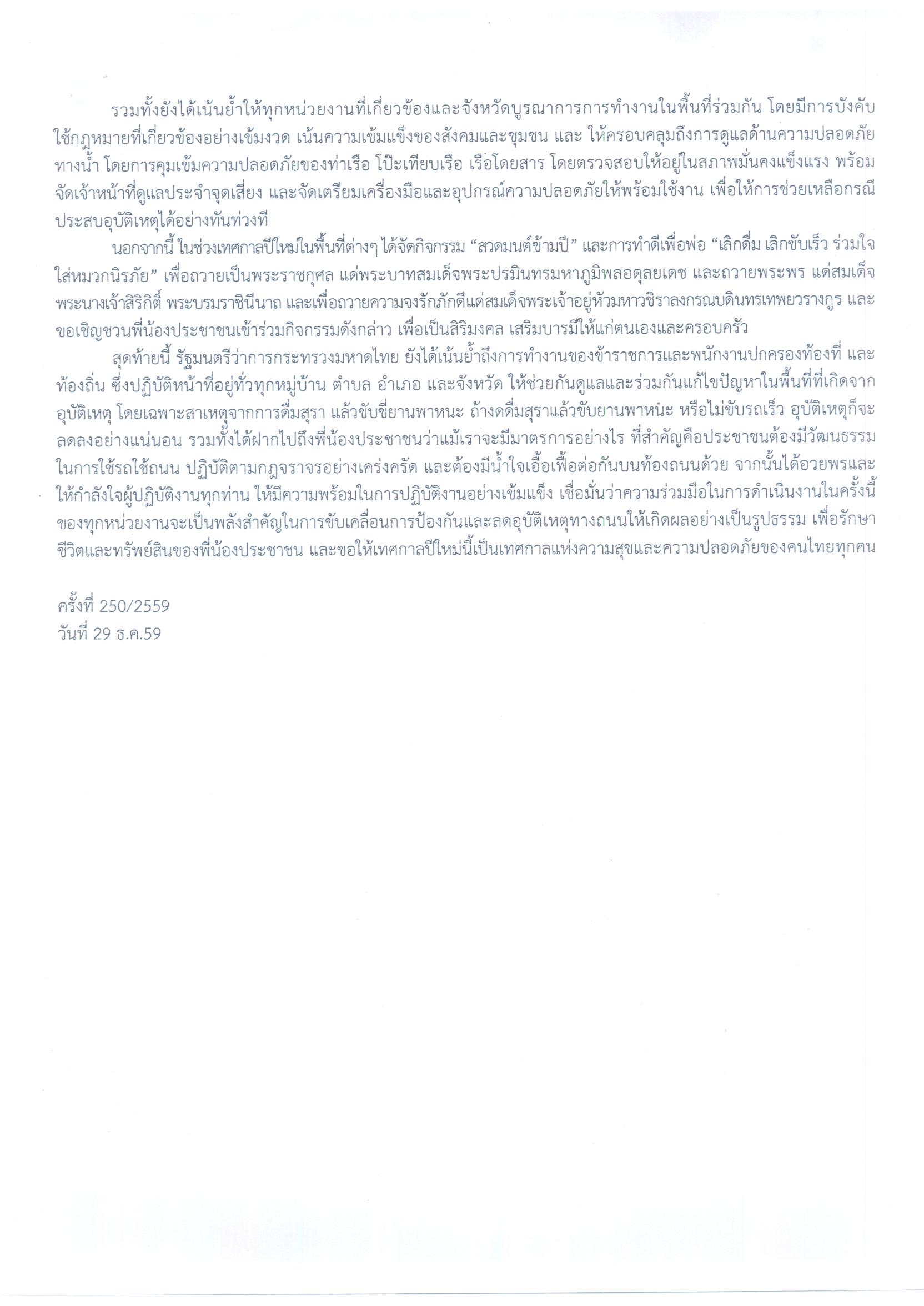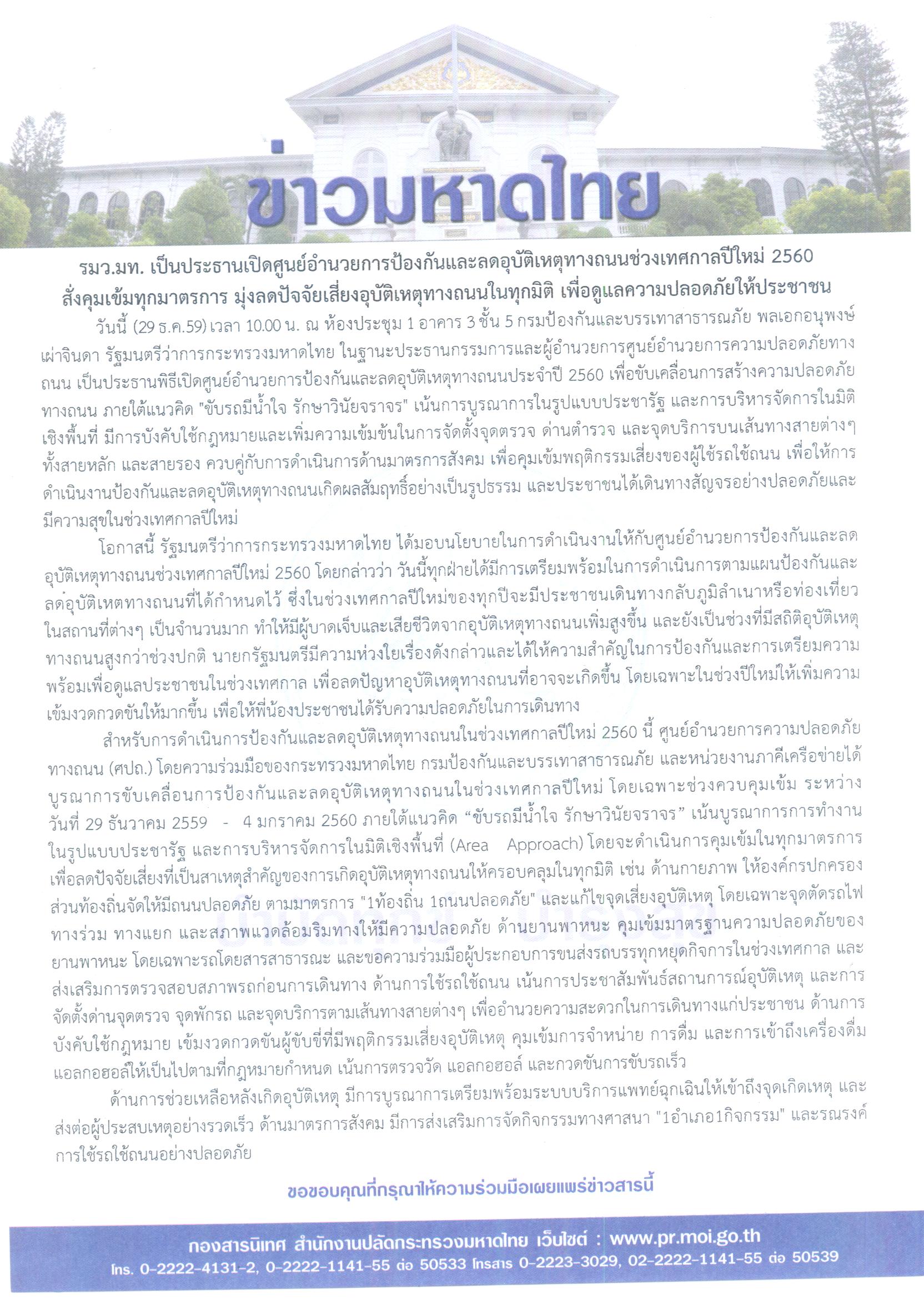 ข่าวมหาดไทย รมว.มท. เป็นประธานเปิดศูนย์อำนวยการป้องกันและลดอุบัติเหตุทางถนนช่วงเทศกาลปีใหม่ 2560 สั่งคุมเข้มทุกมาตรการ มุ่งลดปัจจัยเสี่ยงอุบัติเหตุทางถนนในทุกมิติ เพื่อดูแลความปลอดภัยให้ประชาชน โดย กองสารนิเทศ สำนักงานปลัดกระทรวงมหาดไทย 13 มกราคม 2017 13 มกราคม 2017 3 ยอดวิว ก่อนหน้า รมว.มท. เผยมหาดไทยจัดโครงการของขวัญปีใหม่ 2560 คัดสรร 14 โครงการที่เป็นประโยชน์ต่อประชาชน นำมามอบความสุข ส่งความห่วงใยถึงพี่น้องคนไทยทั่วประเทศ ถัดไป ศูนย์ดำรงธรรมให้บริการช่วงปีใหม่ไม่มีวนหยุด ผุดไอเดียเข้าถึงประชาชน บริการเชิงรุกตั้งศูนย์ดำรงธรรมเคลื่อนที่ ณ จุดอำนวยความปลอดภัยทางถนน 24 ชม. บทความที่เกี่ยวข้อง กระทรวงมหาดไทย โค้ชชิ่ง “ต้นกล้าข้าราชการ” รุ่นที่... 17 ธันวาคม 2025 “มหาดไทย” ร่วมขับเคลื่อนเศรษฐกิจระหว่า... 16 ธันวาคม 2025 กระทรวงมหาดไทย เดินหน้าขยายผล “One Plan̶... 16 ธันวาคม 2025 “มหาดไทย” ยกระดับเพิ่มประสิทธิภาพการตร... 15 ธันวาคม 2025 “รมช.มท.ก้อย-ศศิธร” แถลงข่าวมหกรรมของข... 15 ธันวาคม 2025 “อรรษิษฐ์ สัมพันธรัตน์” ปลัด มท. ประกา... 15 ธันวาคม 2025 สมเด็จพระกนิษฐาธิราชเจ้า กรมสมเด็จพระเทพรัตนราชสุด... 15 ธันวาคม 2025 มท.4 “ศศิธร” ลงพื้นที่ จ.เชียงใหม่ เปิ... 14 ธันวาคม 2025 “รมช.มท.ศักดิ์ดา” แถลง “ปิดกองบัญชาการ ปภ.ชาติ ส่ว... 14 ธันวาคม 2025