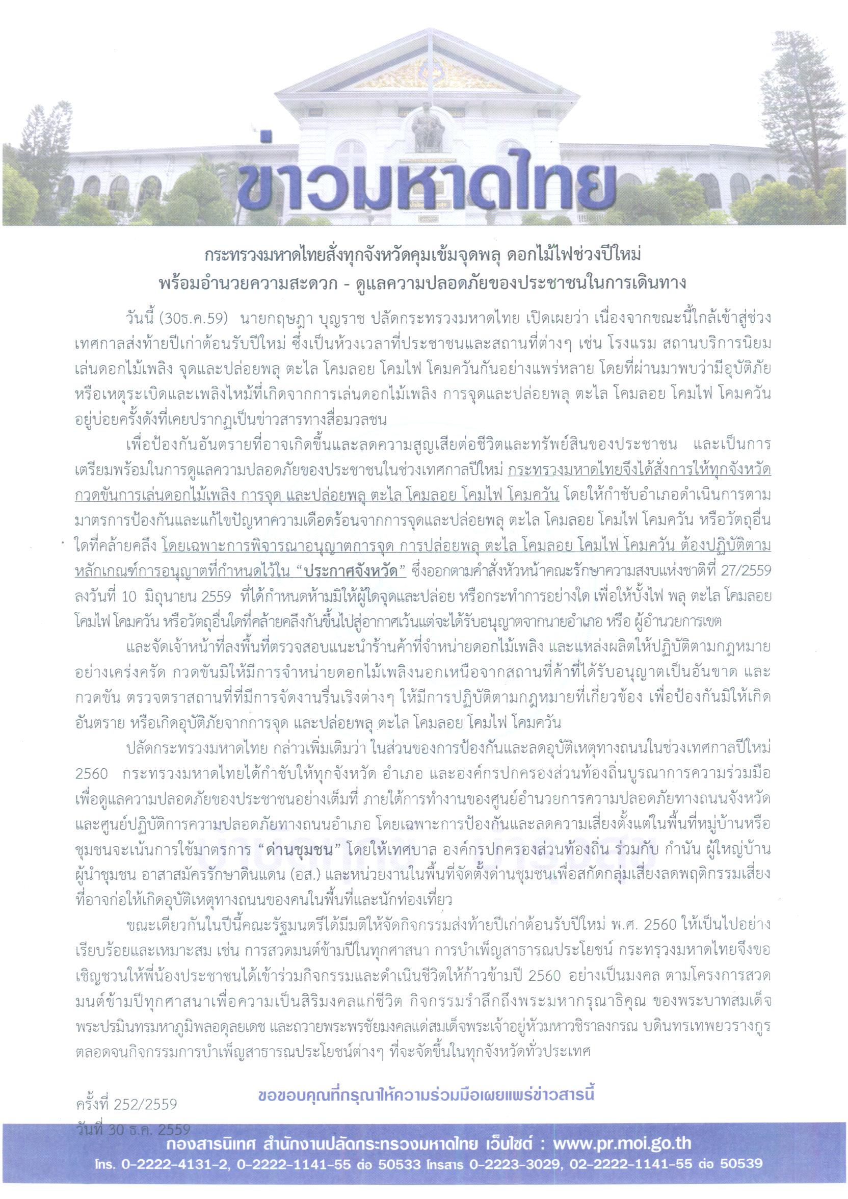 ข่าวมหาดไทย กระทรวงมหาดไทยสั่งทุกจังหวัดคุมเข้มจุดพลุ ดอกไม้ไฟช่วงปีใหม่ พร้อมอำนวยความสะดวก – ดูแลความปลอดภัยของประชาชนในการเดินทาง โดย กองสารนิเทศ สำนักงานปลัดกระทรวงมหาดไทย 13 มกราคม 2017 13 มกราคม 2017 4 ยอดวิว ก่อนหน้า ศูนย์ดำรงธรรมให้บริการช่วงปีใหม่ไม่มีวนหยุด ผุดไอเดียเข้าถึงประชาชน บริการเชิงรุกตั้งศูนย์ดำรงธรรมเคลื่อนที่ ณ จุดอำนวยความปลอดภัยทางถนน 24 ชม. ถัดไป กระทรวงมหาดไทย เชิญชวนพี่น้องประชาชนทั่วประเทศ เข้าร่วมกิจกรรม “สวดมนต์ข้ามปี ส่งท้ายปีเก่าวิถีไทย ต้อนรับปีใหม่วิถีพุทธ พุทธศักราช 2560” เพื่อเป็นสิริมงคล เสริมบารมีให้แก่ตนเองและครอบครัว บทความที่เกี่ยวข้อง กระทรวงมหาดไทย โค้ชชิ่ง “ต้นกล้าข้าราชการ” รุ่นที่... 17 ธันวาคม 2025 “มหาดไทย” ร่วมขับเคลื่อนเศรษฐกิจระหว่า... 16 ธันวาคม 2025 กระทรวงมหาดไทย เดินหน้าขยายผล “One Plan̶... 16 ธันวาคม 2025 “มหาดไทย” ยกระดับเพิ่มประสิทธิภาพการตร... 15 ธันวาคม 2025 “รมช.มท.ก้อย-ศศิธร” แถลงข่าวมหกรรมของข... 15 ธันวาคม 2025 “อรรษิษฐ์ สัมพันธรัตน์” ปลัด มท. ประกา... 15 ธันวาคม 2025 สมเด็จพระกนิษฐาธิราชเจ้า กรมสมเด็จพระเทพรัตนราชสุด... 15 ธันวาคม 2025 มท.4 “ศศิธร” ลงพื้นที่ จ.เชียงใหม่ เปิ... 14 ธันวาคม 2025 “รมช.มท.ศักดิ์ดา” แถลง “ปิดกองบัญชาการ ปภ.ชาติ ส่ว... 14 ธันวาคม 2025