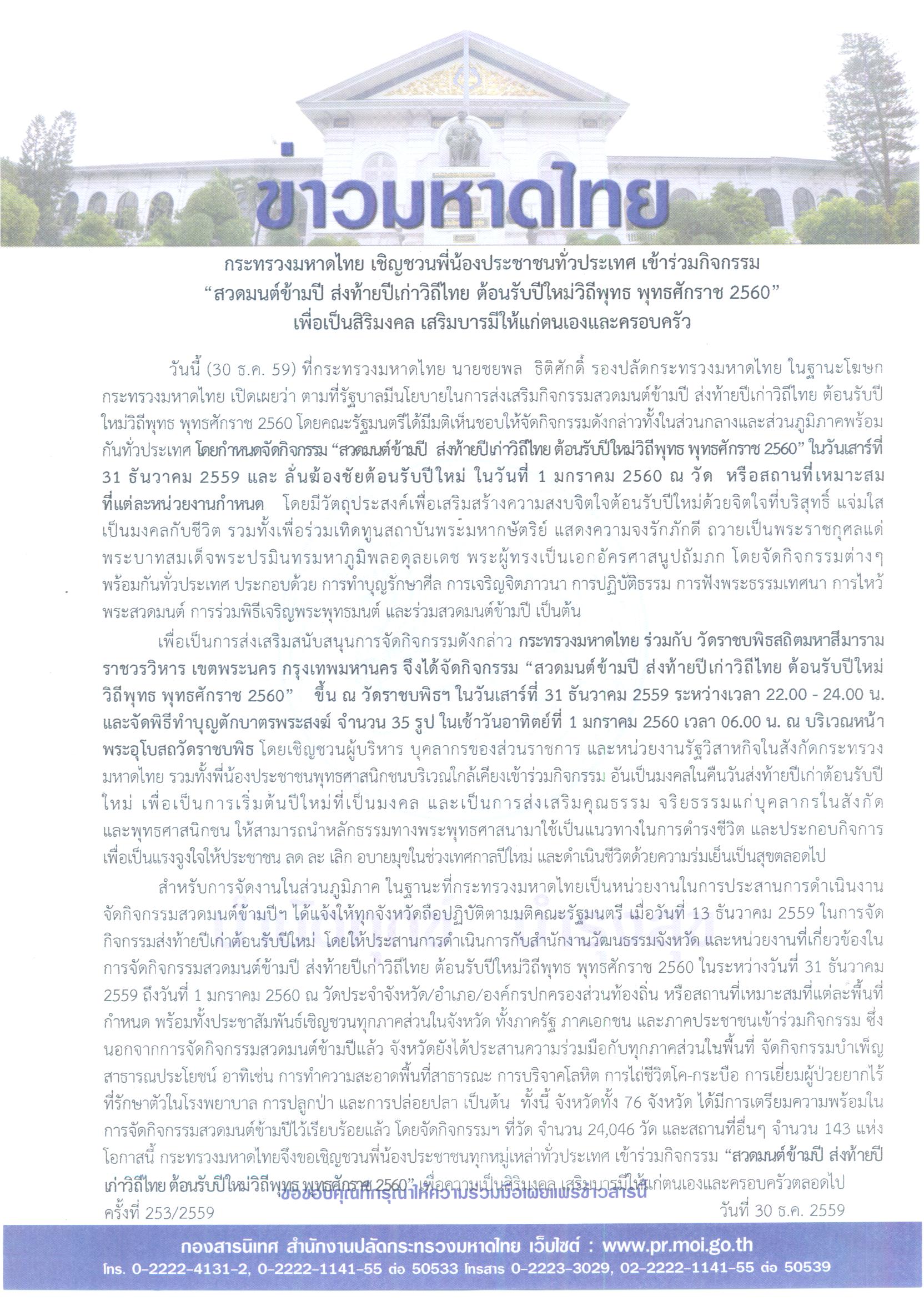 ข่าวมหาดไทย กระทรวงมหาดไทย เชิญชวนพี่น้องประชาชนทั่วประเทศ เข้าร่วมกิจกรรม “สวดมนต์ข้ามปี ส่งท้ายปีเก่าวิถีไทย ต้อนรับปีใหม่วิถีพุทธ พุทธศักราช 2560” เพื่อเป็นสิริมงคล เสริมบารมีให้แก่ตนเองและครอบครัว โดย กองสารนิเทศ สำนักงานปลัดกระทรวงมหาดไทย 13 มกราคม 2017 13 มกราคม 2017 5 ยอดวิว ก่อนหน้า กระทรวงมหาดไทยสั่งทุกจังหวัดคุมเข้มจุดพลุ ดอกไม้ไฟช่วงปีใหม่ พร้อมอำนวยความสะดวก – ดูแลความปลอดภัยของประชาชนในการเดินทาง ถัดไป กระทรวงมหาดไทยห่วงใยประชาชนที่สัญจรทางน้ำในช่วงเทศกาลปีใหม่ สั่งเพิ่มมาตรการดูแลความปลอดภัยตรวจสอบโป๊ะ ท่าเรือ ท่าเทียบเรือให้มีความแข็งแรงปลอดภัย พร้อมจัดเจ้าหน้าที่ดูแลให้ความช่วยเหลือประชาชนอย่างทันท่วงที บทความที่เกี่ยวข้อง “มหาดไทย” ร่วมขับเคลื่อนเศรษฐกิจระหว่า... 16 ธันวาคม 2025 กระทรวงมหาดไทย เดินหน้าขยายผล “One Plan̶... 16 ธันวาคม 2025 “มหาดไทย” ยกระดับเพิ่มประสิทธิภาพการตร... 15 ธันวาคม 2025 “รมช.มท.ก้อย-ศศิธร” แถลงข่าวมหกรรมของข... 15 ธันวาคม 2025 “อรรษิษฐ์ สัมพันธรัตน์” ปลัด มท. ประกา... 15 ธันวาคม 2025 สมเด็จพระกนิษฐาธิราชเจ้า กรมสมเด็จพระเทพรัตนราชสุด... 15 ธันวาคม 2025 มท.4 “ศศิธร” ลงพื้นที่ จ.เชียงใหม่ เปิ... 14 ธันวาคม 2025 “รมช.มท.ศักดิ์ดา” แถลง “ปิดกองบัญชาการ ปภ.ชาติ ส่ว... 14 ธันวาคม 2025 ผู้บัญชาการกองอาสารักษาดินแดน ขอบคุณและชื่นชมความเ... 13 ธันวาคม 2025