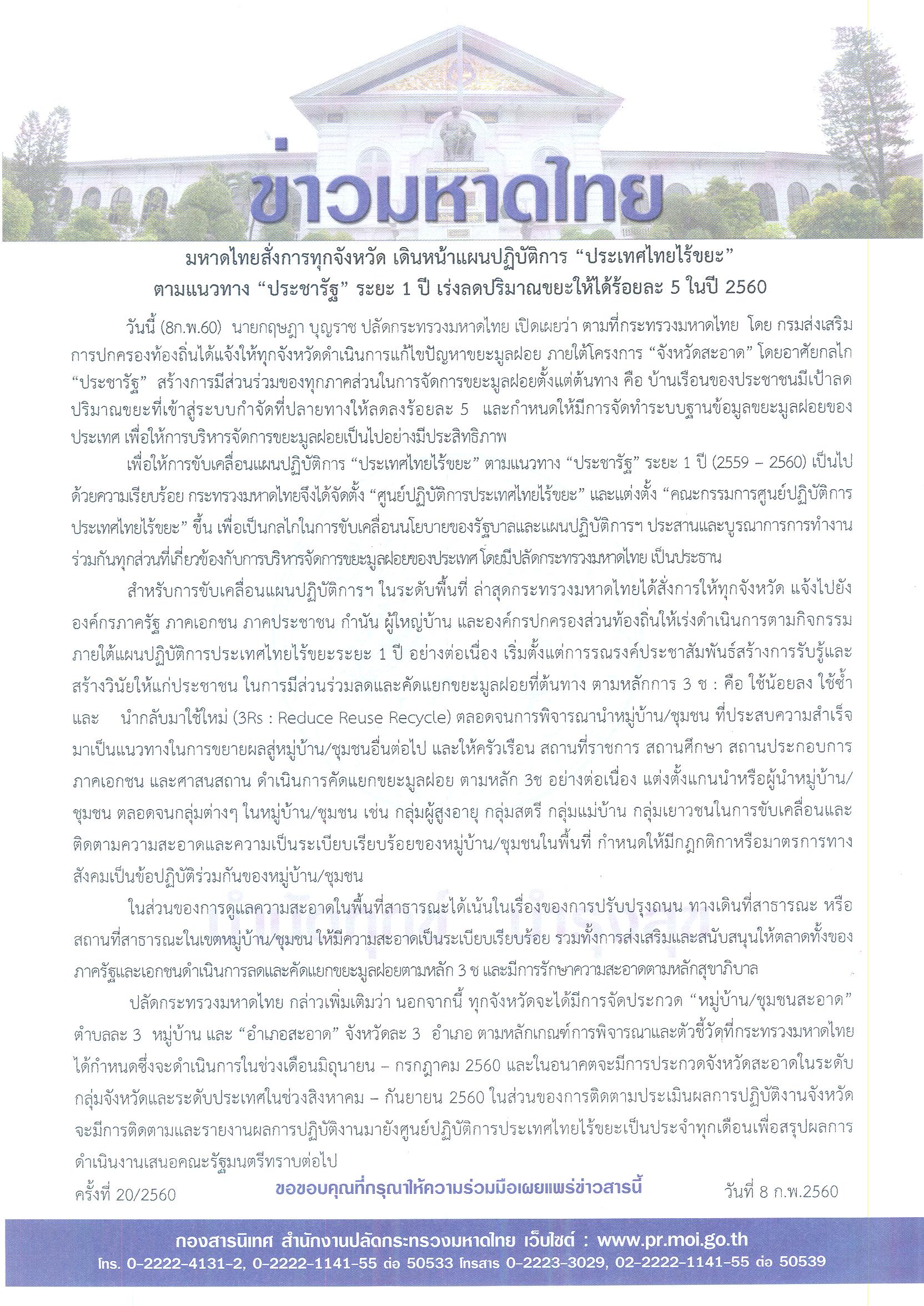 ข่าวมหาดไทย มหาดไทยสั่งการทุกจังหวัด เดินหน้าแผนปฏิบัติการ “ประเทศไทยไร้ขยะ” ตามแนวทาง “ประชารัฐ” ระยะ 1 ปี เร่งลดปริมาณขยะให้ได้ร้อยละ 5 ในปี 2560 โดย กองสารนิเทศ สำนักงานปลัดกระทรวงมหาดไทย 8 กุมภาพันธ์ 2017 8 กุมภาพันธ์ 2017 7 ยอดวิว ก่อนหน้า กระทรวงมหาดไทยสั่งการทุกจังหวัดคุมเข้มสถานบริการและสถานที่ประกอบธุรกิจโรงแรมในช่วงเทศกาลวันวาเลนไทน์ ถัดไป กระทรวงมหาดไทย ร่วมกับ วัดราชบพิธฯ จัดงานวันมาฆบูชา เชิญชวนพุทธศาสนิกชนร่วมบำเพ็ญกุศล ฟังเทศน์ฟังธรรม และสืบสานประเพณีโบราณการเทศน์ยังรุ่ง เปิดให้เดินเทียนตั้งแต่ค่ำ 11 ก.พ.ยังรุ่งเช้า พร้อมจัดสถานที่รองรับคณะสงฆ์ร่วมแสดงมุทิตาจิตแด่สมเด็จพระสังฆราช องค์ที่ 20 บทความที่เกี่ยวข้อง “มหาดไทย” ยกระดับเพิ่มประสิทธิภาพการตร... 15 ธันวาคม 2025 “รมช.มท.ก้อย-ศศิธร” แถลงข่าวมหกรรมของข... 15 ธันวาคม 2025 “อรรษิษฐ์ สัมพันธรัตน์” ปลัด มท. ประกา... 15 ธันวาคม 2025 สมเด็จพระกนิษฐาธิราชเจ้า กรมสมเด็จพระเทพรัตนราชสุด... 15 ธันวาคม 2025 มท.4 “ศศิธร” ลงพื้นที่ จ.เชียงใหม่ เปิ... 14 ธันวาคม 2025 “รมช.มท.ศักดิ์ดา” แถลง “ปิดกองบัญชาการ ปภ.ชาติ ส่ว... 14 ธันวาคม 2025 ผู้บัญชาการกองอาสารักษาดินแดน ขอบคุณและชื่นชมความเ... 13 ธันวาคม 2025 “รมช.มหาดไทย ศศิธร” เป็นประธานประชุมรัฐมนตรีอาเซีย... 13 ธันวาคม 2025 คกก.นโยบายลดอุบัติเหตุทางถนนแห่งชาติ เห็นชอบขับเคล... 12 ธันวาคม 2025