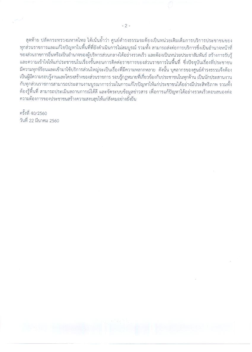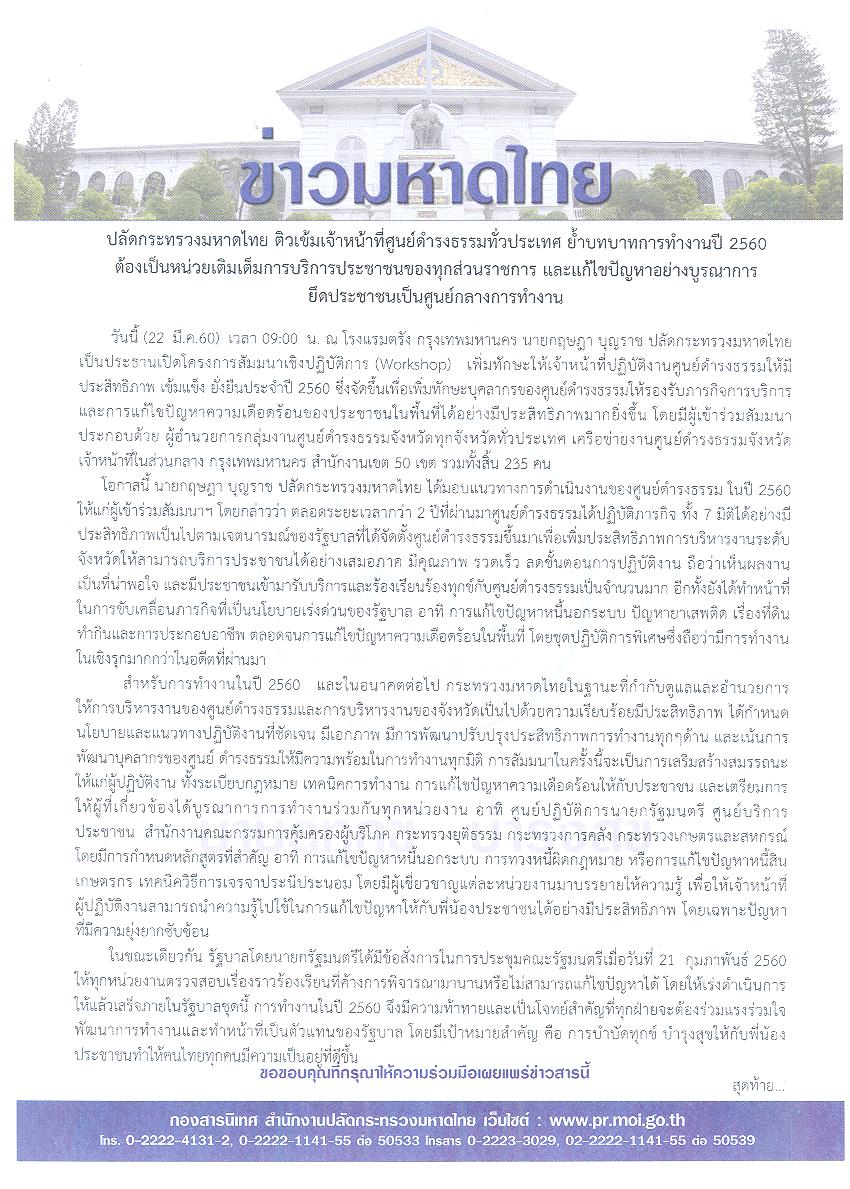 ข่าวมหาดไทย ปลัดกระทรวงมหาดไทย ติวเข้มเจ้าหน้าที่ศูนย์ดำรงธรรมทั่วประเทศ ย้ำบทบาทการทำงานปี 2560 ต้องเป็นหน่วยเติมเต็มการบริการประชาชนของทุกส่วนราชการ และแก้ไขปัญหาอย่างบูรณาการ ยึดประชาชนเป็นศูนย์กลางการทำงาน โดย กองสารนิเทศ สำนักงานปลัดกระทรวงมหาดไทย 22 มีนาคม 2017 22 มีนาคม 2017 29 ยอดวิว ก่อนหน้า ปมท. เป็นประธานการประชุมคณะกรรมการศูนย์อำนวยการความปลอดภัยทางถนน เตรียมความพร้อมลดอุบัติเหตทางถนนช่วงเทศกาลสงกรานต์ 2560 กำชับทุกภาคส่วนเร่งแก้ไขกฎหมาย ร่วมสร้างวัฒนธรรมความปลอดภัยทางถนนอย่างยั่งยืน ถัดไป รมว.มท. เป็นประธานการประชุมแก้ไขปัญหาผักตบชวา ย้ำเดินหน้าใช้ “เซลล์เล็กๆในพื้นที่” เป็นพลังประชารัฐ พลังชุมชน กำจัด เฝ้าระวัง อย่างต่อเนื่องเพื่อแก้ไขปัญหาอย่างยั่งยืน บทความที่เกี่ยวข้อง “มหาดไทย” ยกระดับเพิ่มประสิทธิภาพการตร... 15 ธันวาคม 2025 “รมช.มท.ก้อย-ศศิธร” แถลงข่าวมหกรรมของข... 15 ธันวาคม 2025 “อรรษิษฐ์ สัมพันธรัตน์” ปลัด มท. ประกา... 15 ธันวาคม 2025 สมเด็จพระกนิษฐาธิราชเจ้า กรมสมเด็จพระเทพรัตนราชสุด... 15 ธันวาคม 2025 มท.4 “ศศิธร” ลงพื้นที่ จ.เชียงใหม่ เปิ... 14 ธันวาคม 2025 “รมช.มท.ศักดิ์ดา” แถลง “ปิดกองบัญชาการ ปภ.ชาติ ส่ว... 14 ธันวาคม 2025 ผู้บัญชาการกองอาสารักษาดินแดน ขอบคุณและชื่นชมความเ... 13 ธันวาคม 2025 “รมช.มหาดไทย ศศิธร” เป็นประธานประชุมรัฐมนตรีอาเซีย... 13 ธันวาคม 2025 คกก.นโยบายลดอุบัติเหตุทางถนนแห่งชาติ เห็นชอบขับเคล... 12 ธันวาคม 2025