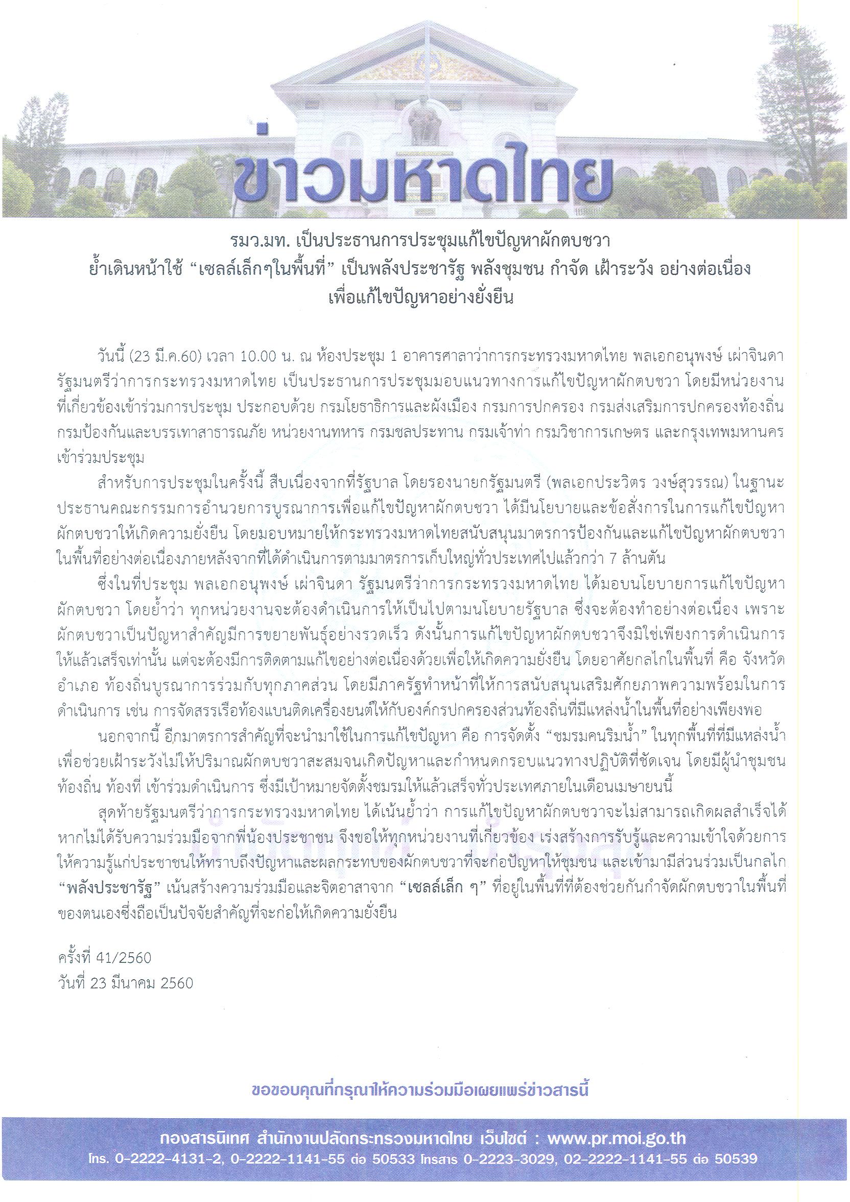 ข่าวมหาดไทย รมว.มท. เป็นประธานการประชุมแก้ไขปัญหาผักตบชวา ย้ำเดินหน้าใช้ “เซลล์เล็กๆในพื้นที่” เป็นพลังประชารัฐ พลังชุมชน กำจัด เฝ้าระวัง อย่างต่อเนื่องเพื่อแก้ไขปัญหาอย่างยั่งยืน โดย กองสารนิเทศ สำนักงานปลัดกระทรวงมหาดไทย 23 มีนาคม 2017 23 มีนาคม 2017 8 ยอดวิว ก่อนหน้า ปลัดกระทรวงมหาดไทย ติวเข้มเจ้าหน้าที่ศูนย์ดำรงธรรมทั่วประเทศ ย้ำบทบาทการทำงานปี 2560 ต้องเป็นหน่วยเติมเต็มการบริการประชาชนของทุกส่วนราชการ และแก้ไขปัญหาอย่างบูรณาการ ยึดประชาชนเป็นศูนย์กลางการทำงาน ถัดไป สำนักงานปลัดกระทรวงมหาดไทย มอบประกาศเกียรติบัตรให้แก่ข้าราชการที่เป็นแบบอย่างที่ดี ในการปฏิบัติตามประมวลจริยธรรมข้าราชการพลเรือน ประจำปี 2560 บทความที่เกี่ยวข้อง กระทรวงมหาดไทย โค้ชชิ่ง “ต้นกล้าข้าราชการ” รุ่นที่... 17 ธันวาคม 2025 “มหาดไทย” ร่วมขับเคลื่อนเศรษฐกิจระหว่า... 16 ธันวาคม 2025 กระทรวงมหาดไทย เดินหน้าขยายผล “One Plan̶... 16 ธันวาคม 2025 “มหาดไทย” ยกระดับเพิ่มประสิทธิภาพการตร... 15 ธันวาคม 2025 “รมช.มท.ก้อย-ศศิธร” แถลงข่าวมหกรรมของข... 15 ธันวาคม 2025 “อรรษิษฐ์ สัมพันธรัตน์” ปลัด มท. ประกา... 15 ธันวาคม 2025 สมเด็จพระกนิษฐาธิราชเจ้า กรมสมเด็จพระเทพรัตนราชสุด... 15 ธันวาคม 2025 มท.4 “ศศิธร” ลงพื้นที่ จ.เชียงใหม่ เปิ... 14 ธันวาคม 2025 “รมช.มท.ศักดิ์ดา” แถลง “ปิดกองบัญชาการ ปภ.ชาติ ส่ว... 14 ธันวาคม 2025