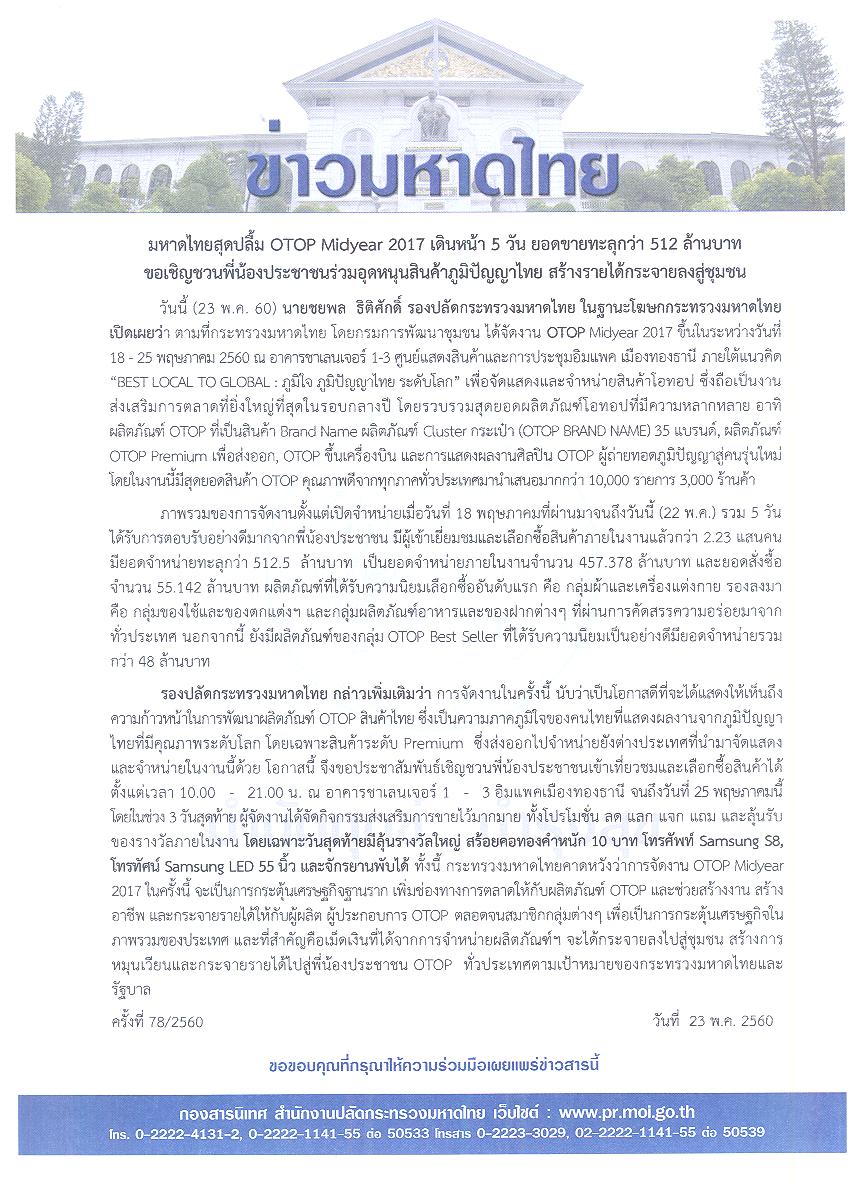 ข่าวมหาดไทย มหาดไทยสุดปลื้ม OTOP Midyear 2017 เดินหน้า 5 วัน ยอดขายทะลุกว่า 512 ล้านบาท ขอเชิญชวนพี่น้องประชาชนร่วมอุดหนุนสินค้าภูมิปัญญาไทย สร้างรายได้กระจายลงสู่ชุมชน โดย กองสารนิเทศ สำนักงานปลัดกระทรวงมหาดไทย 23 พฤษภาคม 2017 23 พฤษภาคม 2017 7 ยอดวิว ก่อนหน้า รมว.มท. เปิดงาน OTOP Midyear 2017 “BEST LOCAL TO GLOBAL” ขอเชิญชวนพี่น้องประชาชนร่วมอุดหนุนสินค้าภูมิปัญญาไทย ยอดขายวันแรกพุ่งกระฉูด 82 ล้านบาท ถัดไป โฆษกมหาดไทยเผยความคืบหน้าการแก้ไขปัญหายาเสพติดตามแผนปี 60 ย้ำเดินหน้าเข้มข้นทุกมาตรการตามนโยบายรัฐบาล เป้าหมายลดผู้เข้าสู่การกระทำผิดและนำคนออกจากวงจรยาเสพติด บทความที่เกี่ยวข้อง รมช.มหาดไทย “ทรงศักดิ์ ทองศรี” ลงพื้นท... 10 ธันวาคม 2025 รมช.มหาดไทย “ศักดิ์ดา วิเชียรศิลป์” ปร... 10 ธันวาคม 2025 รองปลัด มท. “ภาสกร บุญญลักษม์” ประชุมต... 10 ธันวาคม 2025 รองปลัด มท. เปิดประชุมเจ้าหน้าที่อาวุโสอาเซียนด้าน... 10 ธันวาคม 2025 ปลัด มท. “อรรษิษฐ์ สัมพันธรัตน์” ตรวจเ... 10 ธันวาคม 2025 “อรรษิษฐ์ สัมพันธรัตน์” ปลัดกระทรวงมหา... 10 ธันวาคม 2025 รองปลัดมหาดไทย เปิดเวทีเสวนาระดับอาเซียน มุ่งแสวงห... 9 ธันวาคม 2025 “นายกฯ อนุทิน” ประกาศเจตนารมณ์ “... 9 ธันวาคม 2025 มูลนิธิราชประชานุเคราะห์ฯ มอบผ้าห่มกันหนาวพระราชทา... 9 ธันวาคม 2025