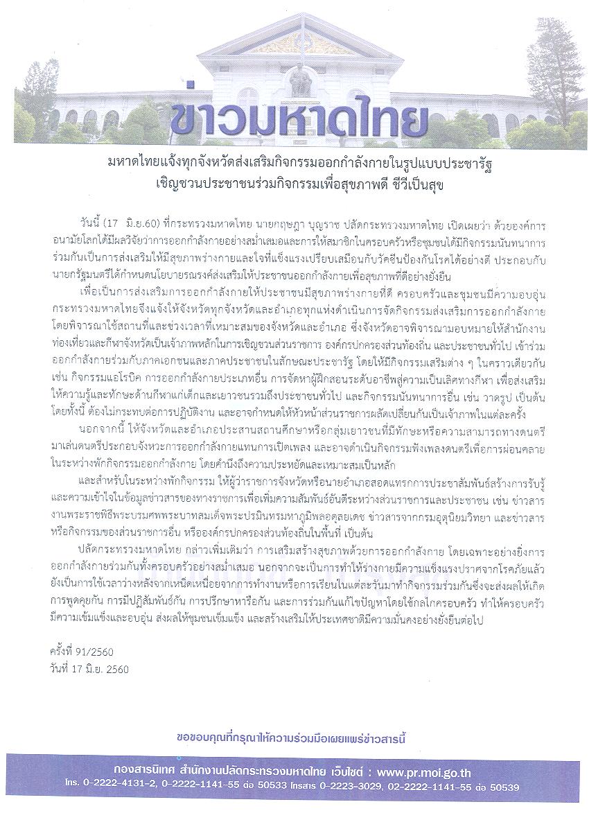 ข่าวมหาดไทย มหาดไทยแจ้งทุกจังหวัดส่งเสริมกิจกรรมออกกำลังกายในรูปแบบประชารัฐ เชิญชวนประชาชนร่วมกิจกรรมเพื่อสุขภาพดี ชีวีเป็นสุข โดย กองสารนิเทศ สำนักงานปลัดกระทรวงมหาดไทย 19 มิถุนายน 2017 19 มิถุนายน 2017 9 ยอดวิว ก่อนหน้า ประปา-ไฟฟ้าผนึกกำลังเดินหน้าพัฒนางานบริการ เพิ่มช่องทางชำระค่าน้ำ-ค่าไฟฟ้า อำนวยความสะดวกแก่ประชาชน ถัดไป มหาดไทยติวเข้มผู้ว่าฯ 7 ข้อ เพื่อเร่งบูรณาการพัฒนาและแก้ไขปัญหาพื้นที่ บทความที่เกี่ยวข้อง มท.4 “ศศิธร” ลงพื้นที่ จ.เชียงใหม่ เปิ... 14 ธันวาคม 2025 “รมช.มท.ศักดิ์ดา” แถลง “ปิดกองบัญชาการ ปภ.ชาติ ส่ว... 14 ธันวาคม 2025 ผู้บัญชาการกองอาสารักษาดินแดน ขอบคุณและชื่นชมความเ... 13 ธันวาคม 2025 “รมช.มหาดไทย ศศิธร” เป็นประธานประชุมรัฐมนตรีอาเซีย... 13 ธันวาคม 2025 คกก.นโยบายลดอุบัติเหตุทางถนนแห่งชาติ เห็นชอบขับเคล... 12 ธันวาคม 2025 กระทรวงมหาดไทย บำเพ็ญกุศลปัญญาสมวาร 50 วัน อุทิศถว... 12 ธันวาคม 2025 สมเด็จพระกนิษฐาธิราชเจ้า กรมสมเด็จพระเทพรัตนราชสุด... 12 ธันวาคม 2025 รมช.มหาดไทย “ศศิธร” ให้การต้อนรับคณะรั... 12 ธันวาคม 2025 หอการค้าไทยและสภาหอการค้าแห่งประเทศไทย ยกย่องเชิดช... 12 ธันวาคม 2025