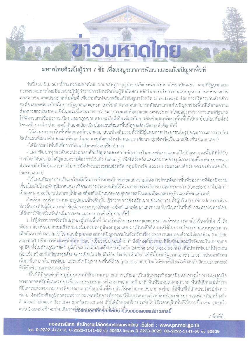 ข่าวมหาดไทย มหาดไทยติวเข้มผู้ว่าฯ 7 ข้อ เพื่อเร่งบูรณาการพัฒนาและแก้ไขปัญหาพื้นที่ โดย กองสารนิเทศ สำนักงานปลัดกระทรวงมหาดไทย 19 มิถุนายน 2017 19 มิถุนายน 2017 8 ยอดวิว ก่อนหน้า มหาดไทยแจ้งทุกจังหวัดส่งเสริมกิจกรรมออกกำลังกายในรูปแบบประชารัฐ เชิญชวนประชาชนร่วมกิจกรรมเพื่อสุขภาพดี ชีวีเป็นสุข ถัดไป มหาดไทยเอาจริงขบวนการค้ามนุษย์และการลักลอบ นำพาแรงงานต่างด้าวเข้ามาในราชอาณาจักรไทยผิดกฎหมาย สั่งทุกจังหวัดปูพรมกวาดล้างทั่วประเทศ หากพบเจ้าหน้าที่รัฐยุ่งเกี่ยวจะถูกลงโทษสถานหนัก บทความที่เกี่ยวข้อง มท.4 “ศศิธร” ลงพื้นที่ จ.เชียงใหม่ เปิ... 14 ธันวาคม 2025 “รมช.มท.ศักดิ์ดา” แถลง “ปิดกองบัญชาการ ปภ.ชาติ ส่ว... 14 ธันวาคม 2025 ผู้บัญชาการกองอาสารักษาดินแดน ขอบคุณและชื่นชมความเ... 13 ธันวาคม 2025 “รมช.มหาดไทย ศศิธร” เป็นประธานประชุมรัฐมนตรีอาเซีย... 13 ธันวาคม 2025 คกก.นโยบายลดอุบัติเหตุทางถนนแห่งชาติ เห็นชอบขับเคล... 12 ธันวาคม 2025 กระทรวงมหาดไทย บำเพ็ญกุศลปัญญาสมวาร 50 วัน อุทิศถว... 12 ธันวาคม 2025 สมเด็จพระกนิษฐาธิราชเจ้า กรมสมเด็จพระเทพรัตนราชสุด... 12 ธันวาคม 2025 รมช.มหาดไทย “ศศิธร” ให้การต้อนรับคณะรั... 12 ธันวาคม 2025 หอการค้าไทยและสภาหอการค้าแห่งประเทศไทย ยกย่องเชิดช... 12 ธันวาคม 2025