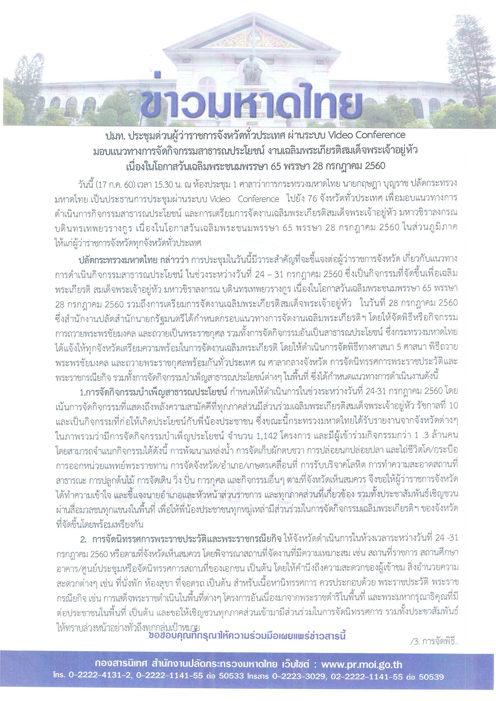 ข่าวมหาดไทย ปมท. ประชุมด่วนผู้ว่าราชการจังหวัดทั่วประเทศ ผ่านระบบ Video Conference มอบแนวทางการจัดกิจกรรมสาธารณประโยชน์ งานเฉลิมพระเกียรติสมเด็จพระเจ้าอยู่หัว เนื่องในโอกาสวันเฉลิมพระชนมพรรษา 65 พรรษา 28 กรกฎาคม 2560 โดย กองสารนิเทศ สำนักงานปลัดกระทรวงมหาดไทย 18 กรกฎาคม 2017 18 กรกฎาคม 2017 5 ยอดวิว ก่อนหน้า รมว.มท.เน้นย้ำให้นายอำเภอเป็นผู้นำในพื้นที่กำกับติดตามและพัฒนากลไกฝ่ายปกครองทั้งท้องที่และท้องถิ่นให้ทำงานอย่างมีประสิทธิภาพ ตอบสนองนโยบายสำคัญของรัฐบาล เพื่อบำบัดทุกข์ บำรุงสุขให้กับประชาชน ถัดไป โฆษกมหาดไทยเผยผลงาน 3 ปี ศูนย์ดำรงธรรม แก้ปัญหาประชาชนกว่า 3.1 ล้านเรื่อง พร้อมสั่งทุกจังหวัดจัดนิทรรศการโชว์ผลงานเด่น บทความที่เกี่ยวข้อง “มหาดไทย” ยกระดับเพิ่มประสิทธิภาพการตร... 15 ธันวาคม 2025 “รมช.มท.ก้อย-ศศิธร” แถลงข่าวมหกรรมของข... 15 ธันวาคม 2025 “อรรษิษฐ์ สัมพันธรัตน์” ปลัด มท. ประกา... 15 ธันวาคม 2025 สมเด็จพระกนิษฐาธิราชเจ้า กรมสมเด็จพระเทพรัตนราชสุด... 15 ธันวาคม 2025 มท.4 “ศศิธร” ลงพื้นที่ จ.เชียงใหม่ เปิ... 14 ธันวาคม 2025 “รมช.มท.ศักดิ์ดา” แถลง “ปิดกองบัญชาการ ปภ.ชาติ ส่ว... 14 ธันวาคม 2025 ผู้บัญชาการกองอาสารักษาดินแดน ขอบคุณและชื่นชมความเ... 13 ธันวาคม 2025 “รมช.มหาดไทย ศศิธร” เป็นประธานประชุมรัฐมนตรีอาเซีย... 13 ธันวาคม 2025 คกก.นโยบายลดอุบัติเหตุทางถนนแห่งชาติ เห็นชอบขับเคล... 12 ธันวาคม 2025