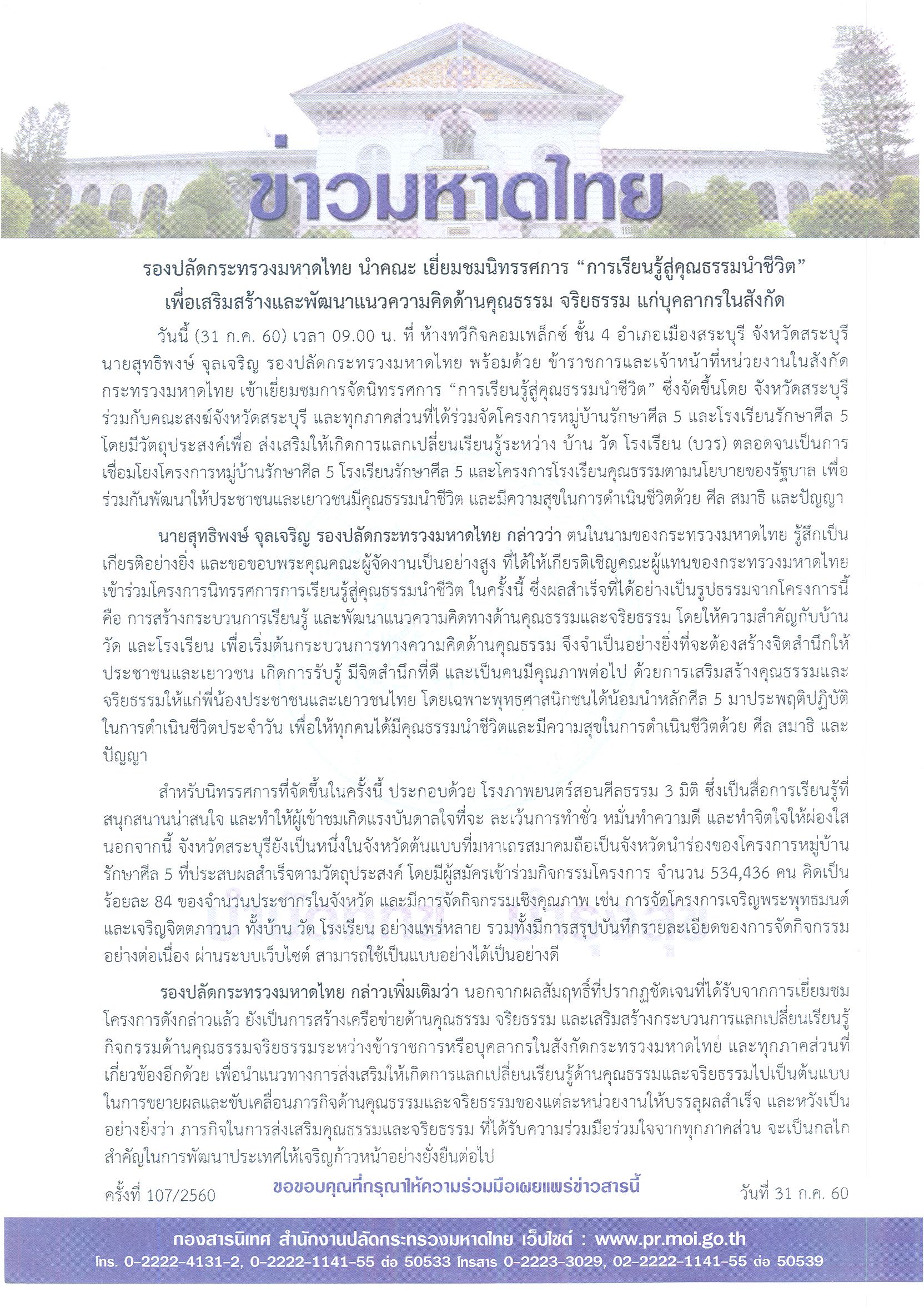 ข่าวมหาดไทย รองปลัดกระทรวงมหาดไทย นำคณะ เยี่ยมชมนิทรรศการ “การเรียนรู้สู่คุณธรรมนำชีวิต” เพื่อเสริมสร้างและพัฒนาแนวความคิดด้านคุณธรรม จริยธรรม แก่บุคลากรในสังกัด โดย กองสารนิเทศ สำนักงานปลัดกระทรวงมหาดไทย 31 กรกฎาคม 2017 31 กรกฎาคม 2017 16 ยอดวิว ก่อนหน้า มหาดไทยสั่งด่วนผู้ว่าฯทุกจังหวัดที่ประสบอุทกภัยกำชับหน่วยปฎิบัติเฝ้าระวังติดตามสถานการณ์ในพื้นที่อย่างใกล้ชิดเพื่อกำหนดแนวทางอพยพและช่วยเหลือพี่น้องประชาชนโดยเร่งด่วน ถัดไป กระทรวงมหาดไทย จับมือ MOU ภาคีเครือข่าย สร้าง “เยาวชนต้นแบบ” ภายใต้โครงการ พัฒนายุวมหาดไทย ยึดหลัก รู้ รัก สามัคคี และ ตอบแทนบุญคุณแผ่นดิน บทความที่เกี่ยวข้อง “มหาดไทย” หารือทุกหน่วยเพิ่มประสิทธิภา... 19 ธันวาคม 2025 “สุราษฎร์ธานี เมืองคนดี ชีวิตดี มีความสุข... 19 ธันวาคม 2025 มหาดไทย ประชุมคณะกรรมการอำนวยการพัฒนาคุณภาพชีวิตขอ... 19 ธันวาคม 2025 รมช.มหาดไทย “ทรงศักดิ์” นั่งหัวโต๊ะ ประชุมคณะกรรมก... 19 ธันวาคม 2025 กระทรวงมหาดไทยร่วมกับมูลนิธิร่วมจิตต์น้อมเกล้าฯ เพ... 19 ธันวาคม 2025 รองปลัด มท. “สันติธร” ประชุมคณะกรรมการ... 19 ธันวาคม 2025 สมเด็จพระเจ้าลูกเธอ เจ้าฟ้าพัชรกิติยาภา นเรนทิราเท... 18 ธันวาคม 2025 กระทรวงมหาดไทย โค้ชชิ่ง “ต้นกล้าข้าราชการ” รุ่นที่... 17 ธันวาคม 2025 “มหาดไทย” ร่วมขับเคลื่อนเศรษฐกิจระหว่า... 16 ธันวาคม 2025