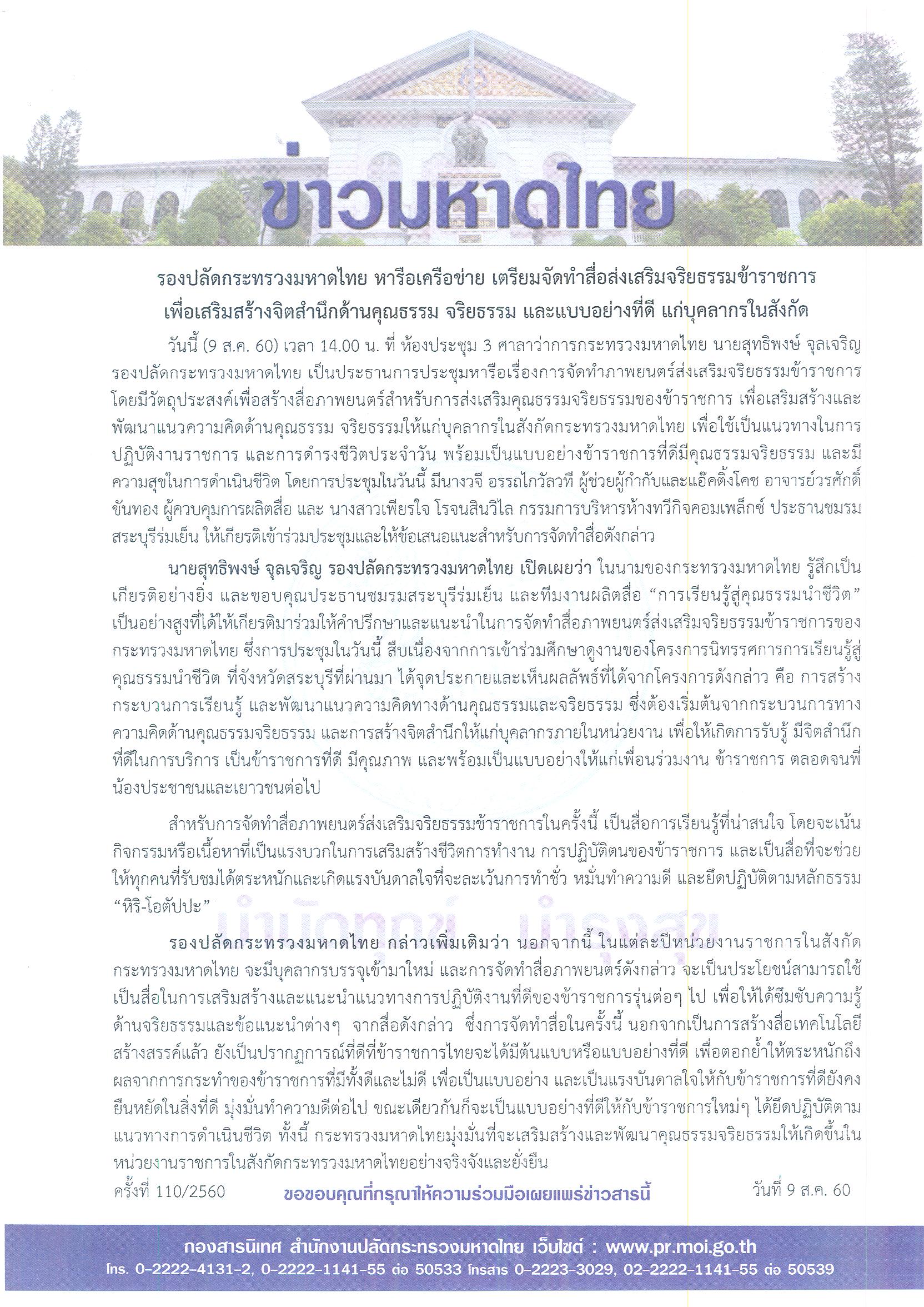 ข่าวมหาดไทย รองปลัดกระทรวงมหาดไทย หารือเครือข่าย เตรียมจัดทำสื่อส่งเสริมจริยธรรมข้าราชการ เพื่อเสริมสร้างจิตสำนึกด้านคุณธรรม จริยธรรม และแบบอย่างที่ดี แก่บุคลากรในสังกัด โดย กองสารนิเทศ สำนักงานปลัดกระทรวงมหาดไทย 10 กรกฎาคม 2019 10 กรกฎาคม 2019 8 ยอดวิว ก่อนหน้า มหาดไทยแจ้งทุกจังหวัดเตรียมการจัดงานเฉลิมพระเกียรติสมเด็จพระนางเจ้าสิริกิติ์ พระบรมราชินีนาถ ในรัชกาลที่ 9 เนื่องในวันเฉลิมพระชนมพรรษา 85 พรรษา 12 สิงหาคม 2560 ถัดไป รมว.มท.เป็นประธานในพิธีมอบรางวัลกำนัน ผู้ใหญ่บ้านยอดเยี่ยม ประจำปี 2560 พร้อมมอบโอวาทกำนัน ผู้ใหญ่บ้าน ให้เข้าถึงปัญหาและ “บำบัดทุกข์ บำรุงสุข” ให้แก่พี่น้องประชาชน เพื่อเป็นกำลังสำคัญในการพัฒนาตำบล หมู่บ้าน อย่างมั่นคงและยั่งยืน บทความที่เกี่ยวข้อง “อนุทิน” เปิดอาคาร “ที่ว่าการอำเภอบ้านลาด (หลังใหม... 21 ธันวาคม 2025 “มหาดไทย” ร่วมประชุมติดตามความพร้อมการ... 21 ธันวาคม 2025 “มหาดไทย” หารือทุกหน่วยเพิ่มประสิทธิภา... 19 ธันวาคม 2025 “สุราษฎร์ธานี เมืองคนดี ชีวิตดี มีความสุข... 19 ธันวาคม 2025 มหาดไทย ประชุมคณะกรรมการอำนวยการพัฒนาคุณภาพชีวิตขอ... 19 ธันวาคม 2025 รมช.มหาดไทย “ทรงศักดิ์” นั่งหัวโต๊ะ ประชุมคณะกรรมก... 19 ธันวาคม 2025 กระทรวงมหาดไทยร่วมกับมูลนิธิร่วมจิตต์น้อมเกล้าฯ เพ... 19 ธันวาคม 2025 รองปลัด มท. “สันติธร” ประชุมคณะกรรมการ... 19 ธันวาคม 2025 สมเด็จพระเจ้าลูกเธอ เจ้าฟ้าพัชรกิติยาภา นเรนทิราเท... 18 ธันวาคม 2025
