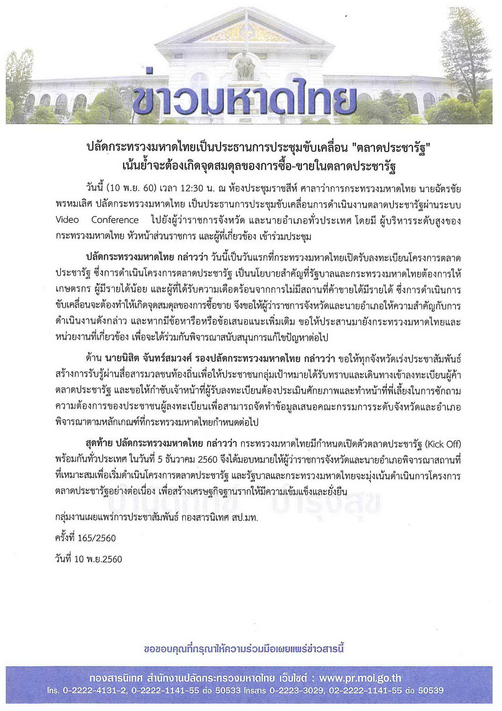 ข่าวมหาดไทย ปลัดกระทรวงมหาดไทยเป็นประธานการประชุมขับเคลื่อน “ตลาดประชารัฐ” เน้นย้ำจะต้องเกิดจุดสมดุลของการซื้อ-ขายในตลาดประชารัฐ โดย กองสารนิเทศ สำนักงานปลัดกระทรวงมหาดไทย 13 พฤศจิกายน 2017 13 พฤศจิกายน 2017 5 ยอดวิว ก่อนหน้า มท.1 ลงพื้นที่ตรวจเยี่ยมโครงการอ่างเก็บน้ำนฤบดินทรจินดา จังหวัดปราจีนบุรี ถัดไป ชี้แจงกรณีนางทองคำ ไกรวาส หญิงชราวัย 82 ปี นอนเสียชีวิตอยู่ภายในเรือที่จังหวัดพระนครศรีอยุธยา บทความที่เกี่ยวข้อง “มหาดไทย” ยกระดับเพิ่มประสิทธิภาพการตร... 15 ธันวาคม 2025 “รมช.มท.ก้อย-ศศิธร” แถลงข่าวมหกรรมของข... 15 ธันวาคม 2025 “อรรษิษฐ์ สัมพันธรัตน์” ปลัด มท. ประกา... 15 ธันวาคม 2025 สมเด็จพระกนิษฐาธิราชเจ้า กรมสมเด็จพระเทพรัตนราชสุด... 15 ธันวาคม 2025 มท.4 “ศศิธร” ลงพื้นที่ จ.เชียงใหม่ เปิ... 14 ธันวาคม 2025 “รมช.มท.ศักดิ์ดา” แถลง “ปิดกองบัญชาการ ปภ.ชาติ ส่ว... 14 ธันวาคม 2025 ผู้บัญชาการกองอาสารักษาดินแดน ขอบคุณและชื่นชมความเ... 13 ธันวาคม 2025 “รมช.มหาดไทย ศศิธร” เป็นประธานประชุมรัฐมนตรีอาเซีย... 13 ธันวาคม 2025 คกก.นโยบายลดอุบัติเหตุทางถนนแห่งชาติ เห็นชอบขับเคล... 12 ธันวาคม 2025