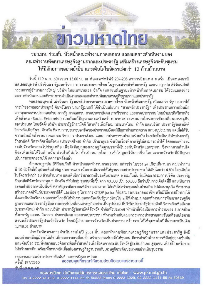 ข่าวมหาดไทย รมว.มท. ร่วมกับ หัวหน้าคณะทำงานภาคเอกชน แถลงผลการดำเนินงานของคณะทำงานพัฒนาเศรษฐกิจฐานรากและประชารัฐ เสริมสร้างเศรษฐกิจระดับชุมชนให้มีศักยภาพอย่างยั่งยืน และเติบโตในอัตราเร่งกว่า 13 ล้านล้านบาท โดย กองสารนิเทศ สำนักงานปลัดกระทรวงมหาดไทย 20 ธันวาคม 2017 20 ธันวาคม 2017 15 ยอดวิว ก่อนหน้า มหาดไทยเผยผลสำเร็จการดำเนินโครงการตลาดประชารัฐ กระตุ้นเศรษฐกิจฐานรากทั้งประเทศแล้วกว่า 114 ล้านบาท ถัดไป ศปถ. ประชุมเตรียมความพร้อมป้องกันและลดอุบัติเหตุทางถนนช่วงเทศกาลปีใหม่ 2561 เน้นบูรณาการทุกภาคส่วนเพื่อร่วมกันสร้างวัฒนธรรมความปลอดภัยทางถนน บทความที่เกี่ยวข้อง กระทรวงมหาดไทย โค้ชชิ่ง “ต้นกล้าข้าราชการ” รุ่นที่... 17 ธันวาคม 2025 “มหาดไทย” ร่วมขับเคลื่อนเศรษฐกิจระหว่า... 16 ธันวาคม 2025 กระทรวงมหาดไทย เดินหน้าขยายผล “One Plan̶... 16 ธันวาคม 2025 “มหาดไทย” ยกระดับเพิ่มประสิทธิภาพการตร... 15 ธันวาคม 2025 “รมช.มท.ก้อย-ศศิธร” แถลงข่าวมหกรรมของข... 15 ธันวาคม 2025 “อรรษิษฐ์ สัมพันธรัตน์” ปลัด มท. ประกา... 15 ธันวาคม 2025 สมเด็จพระกนิษฐาธิราชเจ้า กรมสมเด็จพระเทพรัตนราชสุด... 15 ธันวาคม 2025 มท.4 “ศศิธร” ลงพื้นที่ จ.เชียงใหม่ เปิ... 14 ธันวาคม 2025 “รมช.มท.ศักดิ์ดา” แถลง “ปิดกองบัญชาการ ปภ.ชาติ ส่ว... 14 ธันวาคม 2025