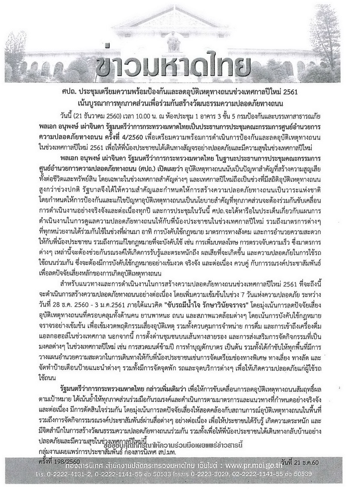 ข่าวมหาดไทย ศปถ. ประชุมเตรียมความพร้อมป้องกันและลดอุบัติเหตุทางถนนช่วงเทศกาลปีใหม่ 2561 เน้นบูรณาการทุกภาคส่วนเพื่อร่วมกันสร้างวัฒนธรรมความปลอดภัยทางถนน โดย กองสารนิเทศ สำนักงานปลัดกระทรวงมหาดไทย 21 ธันวาคม 2017 21 ธันวาคม 2017 7 ยอดวิว ก่อนหน้า รมว.มท. ร่วมกับ หัวหน้าคณะทำงานภาคเอกชน แถลงผลการดำเนินงานของคณะทำงานพัฒนาเศรษฐกิจฐานรากและประชารัฐ เสริมสร้างเศรษฐกิจระดับชุมชนให้มีศักยภาพอย่างยั่งยืน และเติบโตในอัตราเร่งกว่า 13 ล้านล้านบาท ถัดไป ปลัดมหาดไทยแจ้งข้าราชการในสังกัดส่งความสุขปีใหม่ด้วยความพอเพียง งดรับของขวัญปีใหม่ เน้นย้ำทุกพื้นที่มอบ 14 โครงการเพื่อเป็นของขวัญให้พี่น้องประชาชน บทความที่เกี่ยวข้อง “มหาดไทย” ยกระดับเพิ่มประสิทธิภาพการตร... 15 ธันวาคม 2025 “รมช.มท.ก้อย-ศศิธร” แถลงข่าวมหกรรมของข... 15 ธันวาคม 2025 “อรรษิษฐ์ สัมพันธรัตน์” ปลัด มท. ประกา... 15 ธันวาคม 2025 สมเด็จพระกนิษฐาธิราชเจ้า กรมสมเด็จพระเทพรัตนราชสุด... 15 ธันวาคม 2025 มท.4 “ศศิธร” ลงพื้นที่ จ.เชียงใหม่ เปิ... 14 ธันวาคม 2025 “รมช.มท.ศักดิ์ดา” แถลง “ปิดกองบัญชาการ ปภ.ชาติ ส่ว... 14 ธันวาคม 2025 ผู้บัญชาการกองอาสารักษาดินแดน ขอบคุณและชื่นชมความเ... 13 ธันวาคม 2025 “รมช.มหาดไทย ศศิธร” เป็นประธานประชุมรัฐมนตรีอาเซีย... 13 ธันวาคม 2025 คกก.นโยบายลดอุบัติเหตุทางถนนแห่งชาติ เห็นชอบขับเคล... 12 ธันวาคม 2025