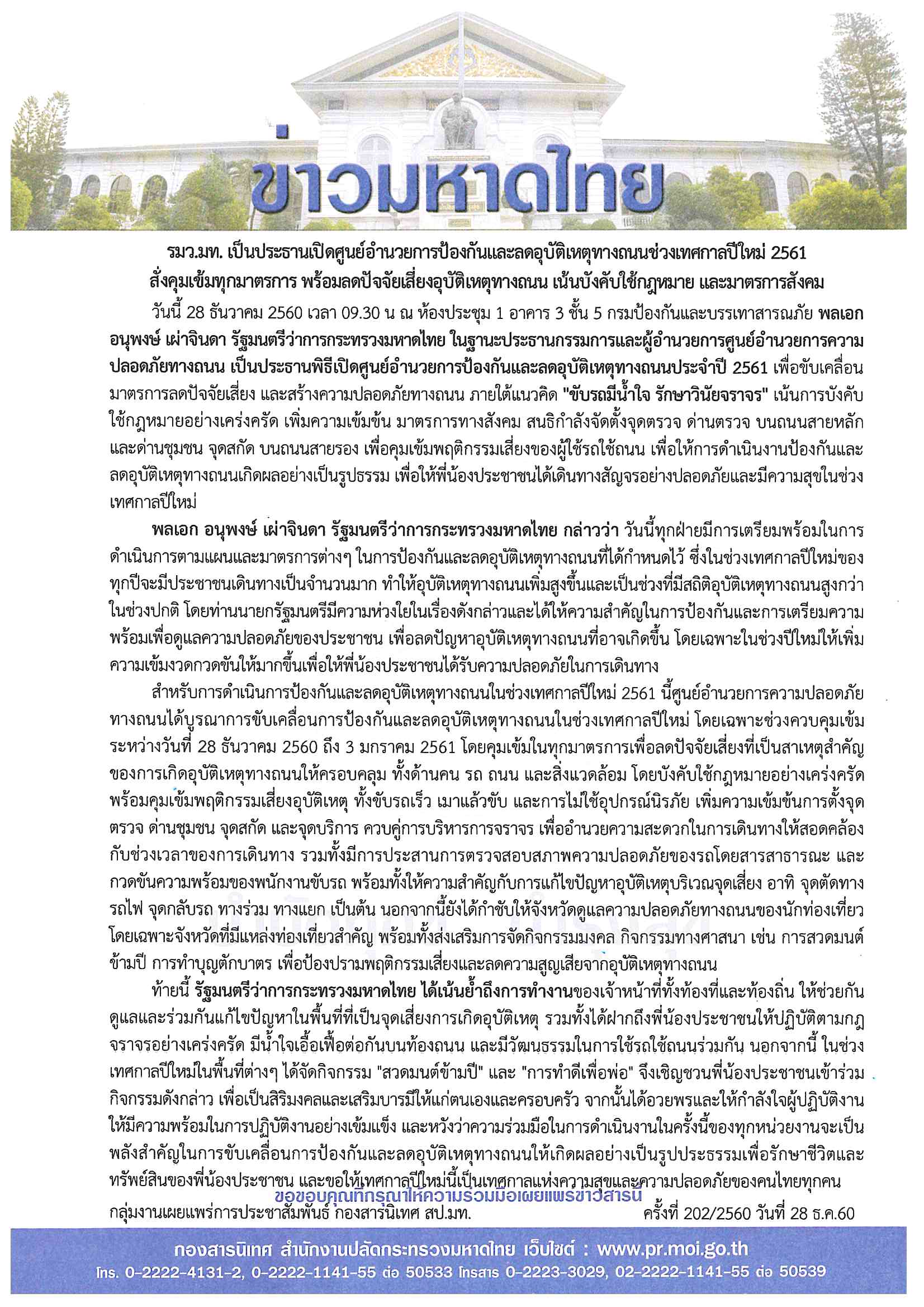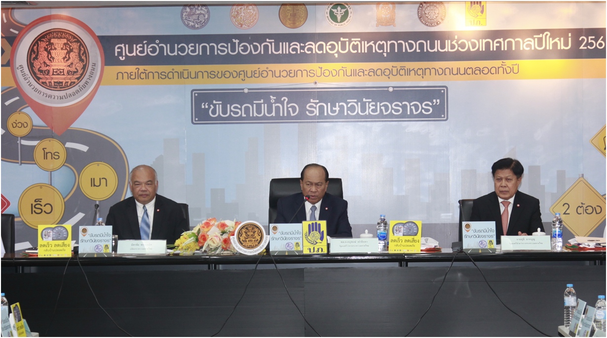 ข่าวมหาดไทย รมว.มท. เป็นประธานเปิดศูนย์อำนวยการป้องกันและลดอุบัติเหตุทางถนนช่วงเทศกาลปีใหม่ 2561 สั่งคุมเข้มทุกมาตรการ พร้อมลดปัจจัยเสี่ยงอุบัติเหตุทางถนน เน้นบังคับใช้กฎหมาย และมาตรการสังคม โดย กองสารนิเทศ สำนักงานปลัดกระทรวงมหาดไทย 28 ธันวาคม 2017 28 ธันวาคม 2017 16 ยอดวิว ก่อนหน้า ชี้แจงกรณีพื้นที่อำเภอน้ำปาด จังหวัดอุตรดิตถ์ประสบภัยหนาว แต่ไม่สามารถประกาศให้เป็นพื้นที่ประสบภัยพิบัติ เนื่องจากไม่เข้าหลักเกณฑ์การประกาศพื้นที่ประสบภัยหนาวฉบับใหม่ ถัดไป กระทรวงมหาดไทย เชิญชวนพี่น้องประชาชนทั่วประเทศ ร่วมกิจกรรม “สวดมนต์ข้ามปี ส่งท้ายปีเก่าวิถีไทย ต้อนรับปีใหม่วิถีธรรม” ถวายเป็นพระราชกุศล และเสริมสิริมงคลให้แก่ตนเองและครอบครัว บทความที่เกี่ยวข้อง “มหาดไทย” ยกระดับเพิ่มประสิทธิภาพการตร... 15 ธันวาคม 2025 “รมช.มท.ก้อย-ศศิธร” แถลงข่าวมหกรรมของข... 15 ธันวาคม 2025 “อรรษิษฐ์ สัมพันธรัตน์” ปลัด มท. ประกา... 15 ธันวาคม 2025 สมเด็จพระกนิษฐาธิราชเจ้า กรมสมเด็จพระเทพรัตนราชสุด... 15 ธันวาคม 2025 มท.4 “ศศิธร” ลงพื้นที่ จ.เชียงใหม่ เปิ... 14 ธันวาคม 2025 “รมช.มท.ศักดิ์ดา” แถลง “ปิดกองบัญชาการ ปภ.ชาติ ส่ว... 14 ธันวาคม 2025 ผู้บัญชาการกองอาสารักษาดินแดน ขอบคุณและชื่นชมความเ... 13 ธันวาคม 2025 “รมช.มหาดไทย ศศิธร” เป็นประธานประชุมรัฐมนตรีอาเซีย... 13 ธันวาคม 2025 คกก.นโยบายลดอุบัติเหตุทางถนนแห่งชาติ เห็นชอบขับเคล... 12 ธันวาคม 2025