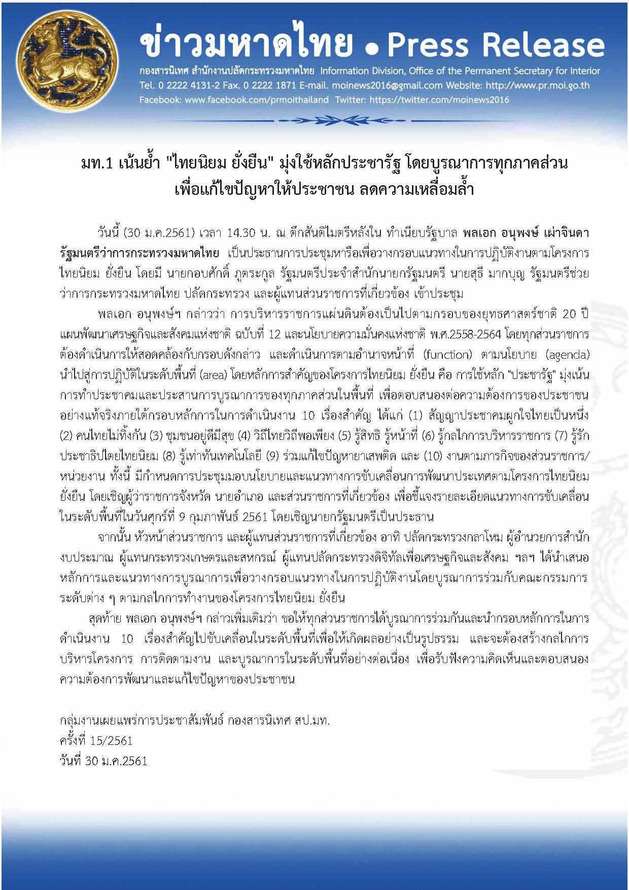 ข่าวมหาดไทย มท.1 เน้นย้ำ “ไทยนิยม ยั่งยืน” มุ่งใช้หลักประชารัฐ โดยบูรณาการทุกภาคส่วน เพื่อแก้ไขปัญหาให้ประชาชน ลดความเหลื่อมล้ำ โดย กองสารนิเทศ สำนักงานปลัดกระทรวงมหาดไทย 31 มกราคม 2018 31 มกราคม 2018 7 ยอดวิว ก่อนหน้า กระทรวงมหาดไทย บูรณาการทุกหน่วยงานในสังกัดขับเคลื่อนมหาดไทย 4.0 ตามนโยบายรัฐบาล ถัดไป กระทรวงมหาดไทย ยืนยันเดินหน้าเสริมสร้างคุณธรรม จริยธรรม บุคลากรในสังกัด ป้องกันปัญหาการทุจริตและประพฤติมิชอบในส่วนราชการ ตามแผนงาน “มหาดไทยใสสะอาด” ย้ำข้าราชการมหาดไทย ต้องรักษาคุณธรรม จริยธรรม และต่อต้านทุจริตทุกรูปแบบ บทความที่เกี่ยวข้อง “มหาดไทย” ยกระดับเพิ่มประสิทธิภาพการตร... 15 ธันวาคม 2025 “รมช.มท.ก้อย-ศศิธร” แถลงข่าวมหกรรมของข... 15 ธันวาคม 2025 “อรรษิษฐ์ สัมพันธรัตน์” ปลัด มท. ประกา... 15 ธันวาคม 2025 สมเด็จพระกนิษฐาธิราชเจ้า กรมสมเด็จพระเทพรัตนราชสุด... 15 ธันวาคม 2025 มท.4 “ศศิธร” ลงพื้นที่ จ.เชียงใหม่ เปิ... 14 ธันวาคม 2025 “รมช.มท.ศักดิ์ดา” แถลง “ปิดกองบัญชาการ ปภ.ชาติ ส่ว... 14 ธันวาคม 2025 ผู้บัญชาการกองอาสารักษาดินแดน ขอบคุณและชื่นชมความเ... 13 ธันวาคม 2025 “รมช.มหาดไทย ศศิธร” เป็นประธานประชุมรัฐมนตรีอาเซีย... 13 ธันวาคม 2025 คกก.นโยบายลดอุบัติเหตุทางถนนแห่งชาติ เห็นชอบขับเคล... 12 ธันวาคม 2025