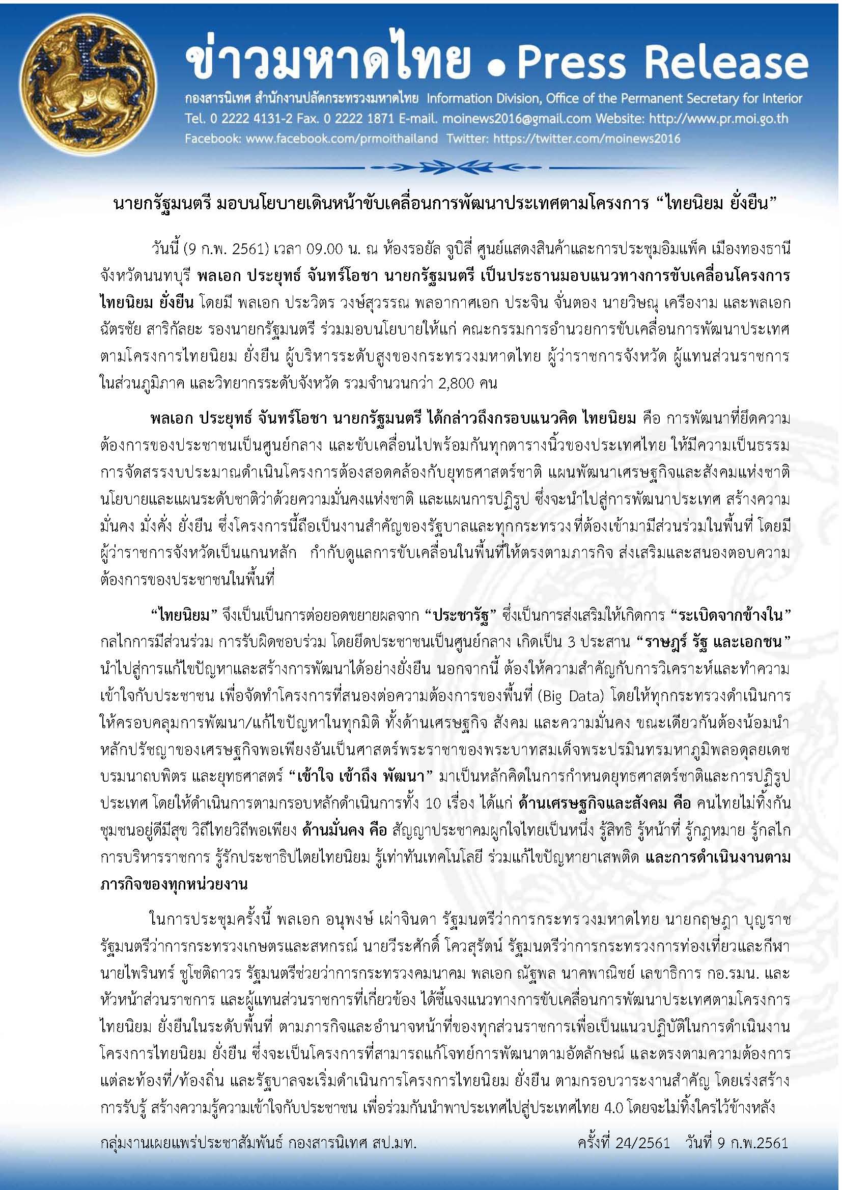 ข่าวมหาดไทย นายกรัฐมนตรี มอบนโยบายเดินหน้าขับเคลื่อนการพัฒนาประเทศตามโครงการ “ไทยนิยม ยั่งยืน” โดย กองสารนิเทศ สำนักงานปลัดกระทรวงมหาดไทย 9 กุมภาพันธ์ 2018 9 กุมภาพันธ์ 2018 9 ยอดวิว ก่อนหน้า ชี้แจงกรณี มีข้อวิจารณ์โครงการไทยนิยม ยั่งยืน ถัดไป มท.2 เป็นประธานในพิธีสดุดีกองอาสารักดินแดน เนื่องในวันคล้ายวันสถาปนากองอาสารักษาดินแดน ครบรอบ 64 ปี พร้อมมอบโอวาทให้ผู้บังคับบัญชา เจ้าหน้าที่ และสมาชิกกองอาสารักษาดินแดน น้อมนำพระบรมราโชวาท มาเป็นหลักในการปฏิบัติงาน เพื่อประโยชน์สุขของประชาชนและประเทศชาติ บทความที่เกี่ยวข้อง “มหาดไทย” ยกระดับเพิ่มประสิทธิภาพการตร... 15 ธันวาคม 2025 “รมช.มท.ก้อย-ศศิธร” แถลงข่าวมหกรรมของข... 15 ธันวาคม 2025 “อรรษิษฐ์ สัมพันธรัตน์” ปลัด มท. ประกา... 15 ธันวาคม 2025 สมเด็จพระกนิษฐาธิราชเจ้า กรมสมเด็จพระเทพรัตนราชสุด... 15 ธันวาคม 2025 มท.4 “ศศิธร” ลงพื้นที่ จ.เชียงใหม่ เปิ... 14 ธันวาคม 2025 “รมช.มท.ศักดิ์ดา” แถลง “ปิดกองบัญชาการ ปภ.ชาติ ส่ว... 14 ธันวาคม 2025 ผู้บัญชาการกองอาสารักษาดินแดน ขอบคุณและชื่นชมความเ... 13 ธันวาคม 2025 “รมช.มหาดไทย ศศิธร” เป็นประธานประชุมรัฐมนตรีอาเซีย... 13 ธันวาคม 2025 คกก.นโยบายลดอุบัติเหตุทางถนนแห่งชาติ เห็นชอบขับเคล... 12 ธันวาคม 2025