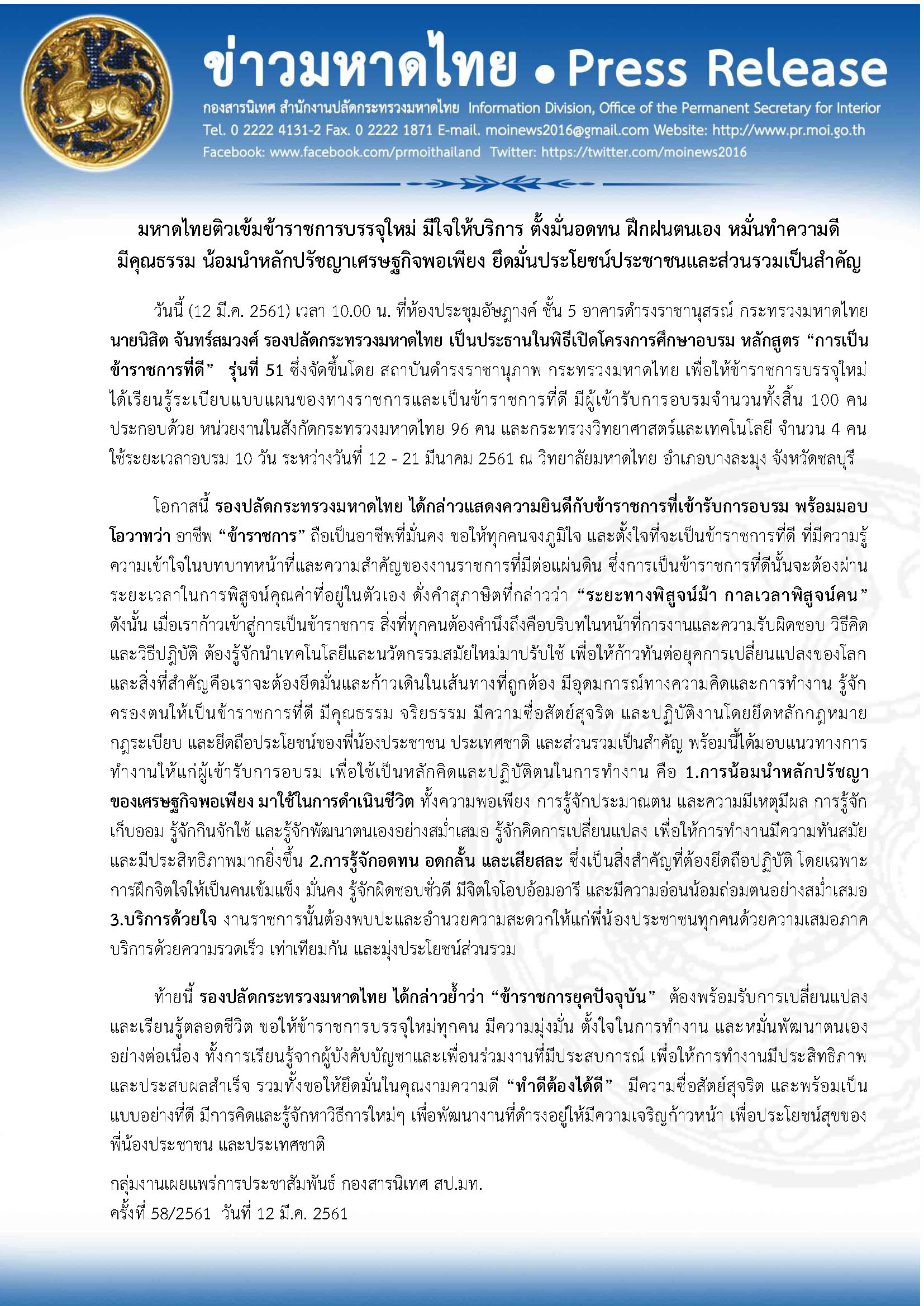 ข่าวมหาดไทย มหาดไทยติวเข้มข้าราชการบรรจุใหม่ มีใจให้บริการ ตั้งมั่นอดทน ฝึกฝนตนเอง หมั่นทำความดี มีคุณธรรม น้อมนำหลักปรัชญาเศรษฐกิจพอเพียง ยึดมั่นประโยชน์ประชาชนและส่วนรวมเป็นสำคัญ วันนี้ (12 มี.ค. 2561) เวลา 09.00 น. ที่ห้องประชุมอัษฎางค์ ชั้น 5 อาคารดำรงราชานุสรณ์ กระทรวงมหาดไทย นายนิสิต จันทร์สมวงศ์ รองปลัดกระทรวงมหาดไทย เป็นประธานในพิ โดย กองสารนิเทศ สำนักงานปลัดกระทรวงมหาดไทย 12 มีนาคม 2018 12 มีนาคม 2018 12 ยอดวิว ก่อนหน้า มหาดไทย ชี้แจงข้อวิจารณ์ “ไทยนิยม ยั่งยืน” ถัดไป มหาดไทย จับมือ ยุติธรรมและสำนักงานอัยการสูงสุด วางกรอบการสร้างการรับรู้ประชาชน เพื่อป้องกันการถูกหลอกลวง ตามโครงการไทยนิยม ยั่งยืน บทความที่เกี่ยวข้อง “มหาดไทย” ยกระดับเพิ่มประสิทธิภาพการตร... 15 ธันวาคม 2025 “รมช.มท.ก้อย-ศศิธร” แถลงข่าวมหกรรมของข... 15 ธันวาคม 2025 “อรรษิษฐ์ สัมพันธรัตน์” ปลัด มท. ประกา... 15 ธันวาคม 2025 สมเด็จพระกนิษฐาธิราชเจ้า กรมสมเด็จพระเทพรัตนราชสุด... 15 ธันวาคม 2025 มท.4 “ศศิธร” ลงพื้นที่ จ.เชียงใหม่ เปิ... 14 ธันวาคม 2025 “รมช.มท.ศักดิ์ดา” แถลง “ปิดกองบัญชาการ ปภ.ชาติ ส่ว... 14 ธันวาคม 2025 ผู้บัญชาการกองอาสารักษาดินแดน ขอบคุณและชื่นชมความเ... 13 ธันวาคม 2025 “รมช.มหาดไทย ศศิธร” เป็นประธานประชุมรัฐมนตรีอาเซีย... 13 ธันวาคม 2025 คกก.นโยบายลดอุบัติเหตุทางถนนแห่งชาติ เห็นชอบขับเคล... 12 ธันวาคม 2025