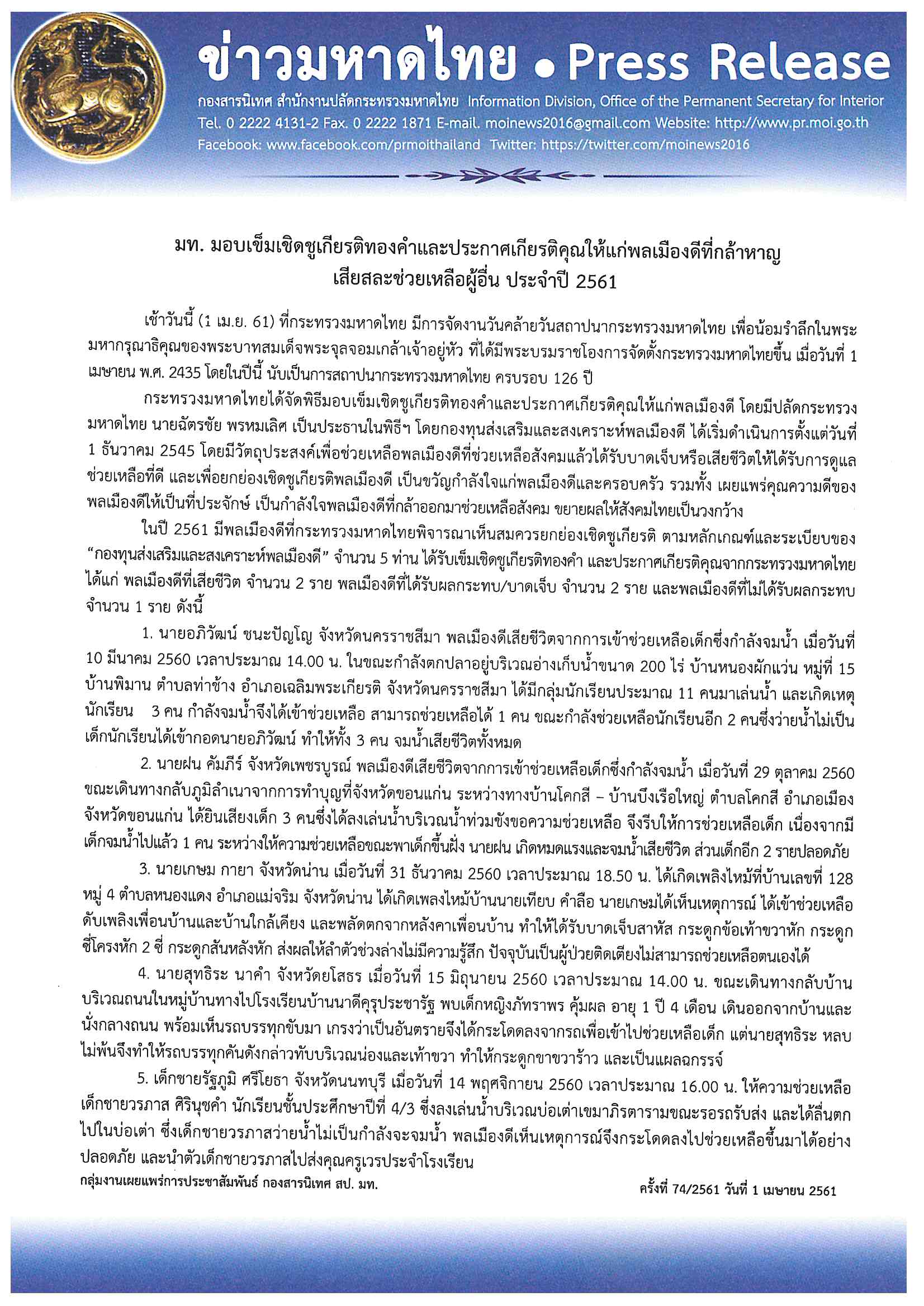 ข่าวมหาดไทย มท. มอบเข็มเชิดชูเกียรติทองคำและประกาศเกียรติคุณให้แก่พลเมืองดีที่กล้าหาญ เสียสละช่วยเหลือผู้อื่น ประจำปี 2561 โดย กองสารนิเทศ สำนักงานปลัดกระทรวงมหาดไทย 2 เมษายน 2018 2 เมษายน 2018 6 ยอดวิว ก่อนหน้า กระทรวงมหาดไทยจัดงานวันที่ระลึกคล้ายวันสถาปนากระทรวงมหาดไทย 1 เมษายน 2561 พร้อมมอบเข็มเชิดชูเกียรติทองคำและประกาศเกียรติคุณให้แก่พลเมืองดีประจำปี 2561 ถัดไป มท.1 มอบกรอบแนวทางในการทำงานให้แก่ข้าราชการกระทรวงมหาดไทย ในโอกาสครบรอบ 126 ปี กระทรวงมหาดไทย บทความที่เกี่ยวข้อง “มหาดไทย” ยกระดับเพิ่มประสิทธิภาพการตร... 15 ธันวาคม 2025 “รมช.มท.ก้อย-ศศิธร” แถลงข่าวมหกรรมของข... 15 ธันวาคม 2025 “อรรษิษฐ์ สัมพันธรัตน์” ปลัด มท. ประกา... 15 ธันวาคม 2025 สมเด็จพระกนิษฐาธิราชเจ้า กรมสมเด็จพระเทพรัตนราชสุด... 15 ธันวาคม 2025 มท.4 “ศศิธร” ลงพื้นที่ จ.เชียงใหม่ เปิ... 14 ธันวาคม 2025 “รมช.มท.ศักดิ์ดา” แถลง “ปิดกองบัญชาการ ปภ.ชาติ ส่ว... 14 ธันวาคม 2025 ผู้บัญชาการกองอาสารักษาดินแดน ขอบคุณและชื่นชมความเ... 13 ธันวาคม 2025 “รมช.มหาดไทย ศศิธร” เป็นประธานประชุมรัฐมนตรีอาเซีย... 13 ธันวาคม 2025 คกก.นโยบายลดอุบัติเหตุทางถนนแห่งชาติ เห็นชอบขับเคล... 12 ธันวาคม 2025