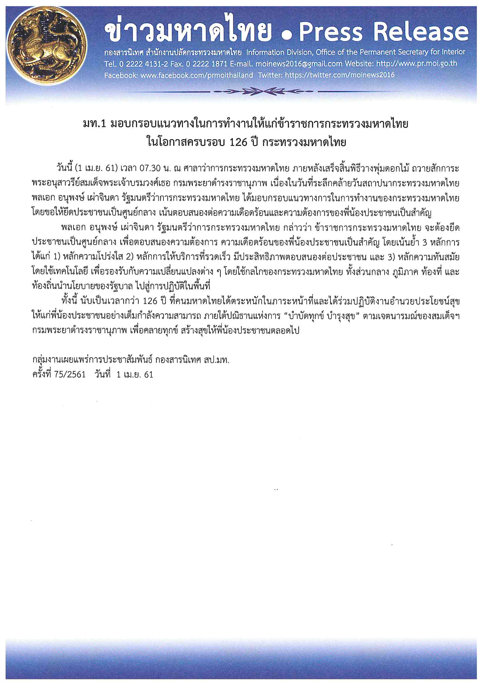ข่าวมหาดไทย มท.1 มอบกรอบแนวทางในการทำงานให้แก่ข้าราชการกระทรวงมหาดไทย ในโอกาสครบรอบ 126 ปี กระทรวงมหาดไทย โดย กองสารนิเทศ สำนักงานปลัดกระทรวงมหาดไทย 2 เมษายน 2018 2 เมษายน 2018 26 ยอดวิว ก่อนหน้า มท. มอบเข็มเชิดชูเกียรติทองคำและประกาศเกียรติคุณให้แก่พลเมืองดีที่กล้าหาญ เสียสละช่วยเหลือผู้อื่น ประจำปี 2561 ถัดไป ชี้แจงกรณีการจ่ายเงินชดเชยเยียวยาน้ำท่วมของ จ.พระนครศรีอยุธยา บทความที่เกี่ยวข้อง สมเด็จพระกนิษฐาธิราชเจ้า กรมสมเด็จพระเทพรัตนราชสุด... 15 ธันวาคม 2025 มท.4 “ศศิธร” ลงพื้นที่ จ.เชียงใหม่ เปิ... 14 ธันวาคม 2025 “รมช.มท.ศักดิ์ดา” แถลง “ปิดกองบัญชาการ ปภ.ชาติ ส่ว... 14 ธันวาคม 2025 ผู้บัญชาการกองอาสารักษาดินแดน ขอบคุณและชื่นชมความเ... 13 ธันวาคม 2025 “รมช.มหาดไทย ศศิธร” เป็นประธานประชุมรัฐมนตรีอาเซีย... 13 ธันวาคม 2025 คกก.นโยบายลดอุบัติเหตุทางถนนแห่งชาติ เห็นชอบขับเคล... 12 ธันวาคม 2025 กระทรวงมหาดไทย บำเพ็ญกุศลปัญญาสมวาร 50 วัน อุทิศถว... 12 ธันวาคม 2025 สมเด็จพระกนิษฐาธิราชเจ้า กรมสมเด็จพระเทพรัตนราชสุด... 12 ธันวาคม 2025 รมช.มหาดไทย “ศศิธร” ให้การต้อนรับคณะรั... 12 ธันวาคม 2025