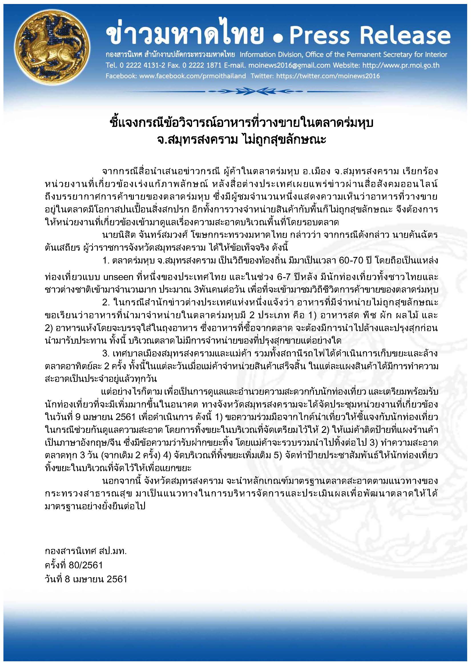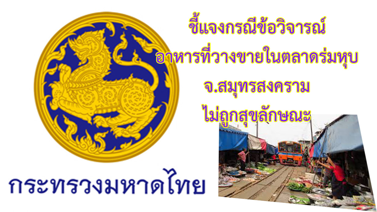 ข่าวมหาดไทย ชี้แจงกรณีข้อวิจารณ์อาหารที่วางขายในตลาดร่มหุบ จ.สมุทรสงคราม ไม่ถูกสุขลักษณะ โดย กองสารนิเทศ สำนักงานปลัดกระทรวงมหาดไทย 8 เมษายน 2018 8 เมษายน 2018 10 ยอดวิว ก่อนหน้า กระทรวงมหาดไทย จับมือ GISTDA จัดทีมประชารัฐเฝ้าระวังไฟป่าและหมอกควัน ส่งเสริมภาคประชาชนร่วมแก้ไขปัญหาด้านสาธารณภัย ถัดไป ศูนย์ดำรงธรรมกระทรวงมหาดไทย เปิดตลอด 24 ชั่วโมงทุกวัน ตลอดเทศกาลสงกรานต์ บูรณาการทุกหน่วยงาน พร้อมอำนวยความสะดวกให้พี่น้องประชาชนทุกที่ ทุกเวลา บทความที่เกี่ยวข้อง “มหาดไทย” ยกระดับเพิ่มประสิทธิภาพการตร... 15 ธันวาคม 2025 “รมช.มท.ก้อย-ศศิธร” แถลงข่าวมหกรรมของข... 15 ธันวาคม 2025 “อรรษิษฐ์ สัมพันธรัตน์” ปลัด มท. ประกา... 15 ธันวาคม 2025 สมเด็จพระกนิษฐาธิราชเจ้า กรมสมเด็จพระเทพรัตนราชสุด... 15 ธันวาคม 2025 มท.4 “ศศิธร” ลงพื้นที่ จ.เชียงใหม่ เปิ... 14 ธันวาคม 2025 “รมช.มท.ศักดิ์ดา” แถลง “ปิดกองบัญชาการ ปภ.ชาติ ส่ว... 14 ธันวาคม 2025 ผู้บัญชาการกองอาสารักษาดินแดน ขอบคุณและชื่นชมความเ... 13 ธันวาคม 2025 “รมช.มหาดไทย ศศิธร” เป็นประธานประชุมรัฐมนตรีอาเซีย... 13 ธันวาคม 2025 คกก.นโยบายลดอุบัติเหตุทางถนนแห่งชาติ เห็นชอบขับเคล... 12 ธันวาคม 2025