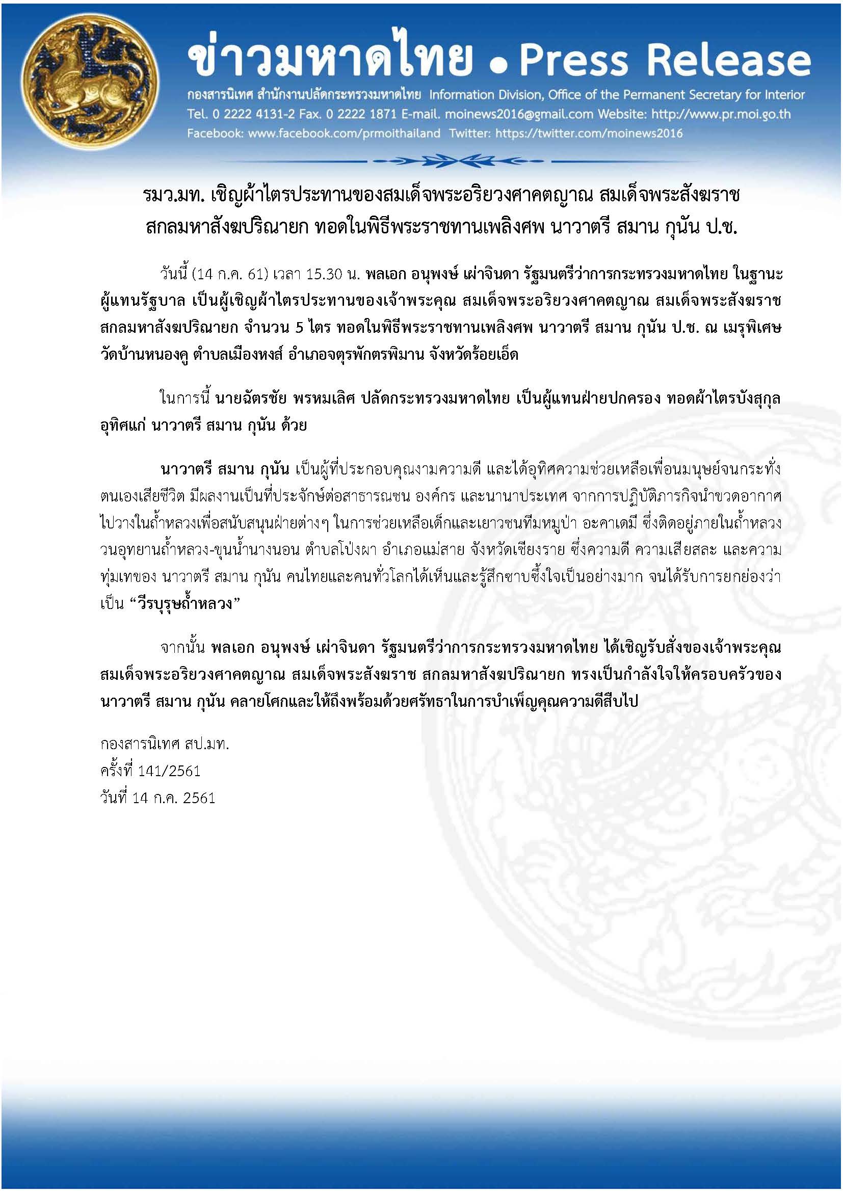 ข่าวมหาดไทย รมว.มท. เชิญผ้าไตรประทานของสมเด็จพระอริยวงศาคตญาณ สมเด็จพระสังฆราช สกลมหาสังฆปริณายก ทอดในพิธีพระราชทานเพลิงศพ นาวาตรี สมาน กุนัน ป.ช. โดย กองสารนิเทศ สำนักงานปลัดกระทรวงมหาดไทย 16 กรกฎาคม 2018 16 กรกฎาคม 2018 10 ยอดวิว ก่อนหน้า รมว.มท. เป็นประธานการประชุมหารือข้อราชการในพื้นที่จังหวัดร้อยเอ็ด และกลุ่มจังหวัดภาคเหนือตอนล่าง 2 ถัดไป กระทรวงมหาดไทยอำนวยความสะดวกแก่พี่น้องชาวมุสลิมในการเดินทาง ไปประกอบพิธีฮัจย์ ที่ประเทศซาอุดิอาระเบีย บทความที่เกี่ยวข้อง “ศักดิ์ดา” รมช.มหาดไทย ติดตามสถานการณ์... 8 ธันวาคม 2025 ไทยเดินหน้าความพร้อมเป็นเจ้าภาพประชุมรัฐมนตรีอาเซี... 8 ธันวาคม 2025 ประเทศไทยพร้อมเป็นเจ้าภาพการประชุมรัฐมนตรีอาเซียนด... 8 ธันวาคม 2025 📌มท.ศักดิ์ดา นั่งหัวโต๊ะกองบัญชาการป้องกัน... 7 ธันวาคม 2025 “นายกฯ อนุทิน” นำคณะ มอบถุงยังชีพและให... 6 ธันวาคม 2025 “นายกฯ อนุทิน” นำคณะลงพื้นที่ติดตามบรร... 6 ธันวาคม 2025 “อนุทิน” ลงพื้นที่ติดตามฟื้นฟูหาดใหญ่ มั่นใจ 14 วั... 6 ธันวาคม 2025 “นายกฯ อนุทิน” นำประชุมกองบัญชาการป้อง... 6 ธันวาคม 2025 “นายกฯ อนุทิน” เดินทางถึงท่าอากาศยานทห... 6 ธันวาคม 2025