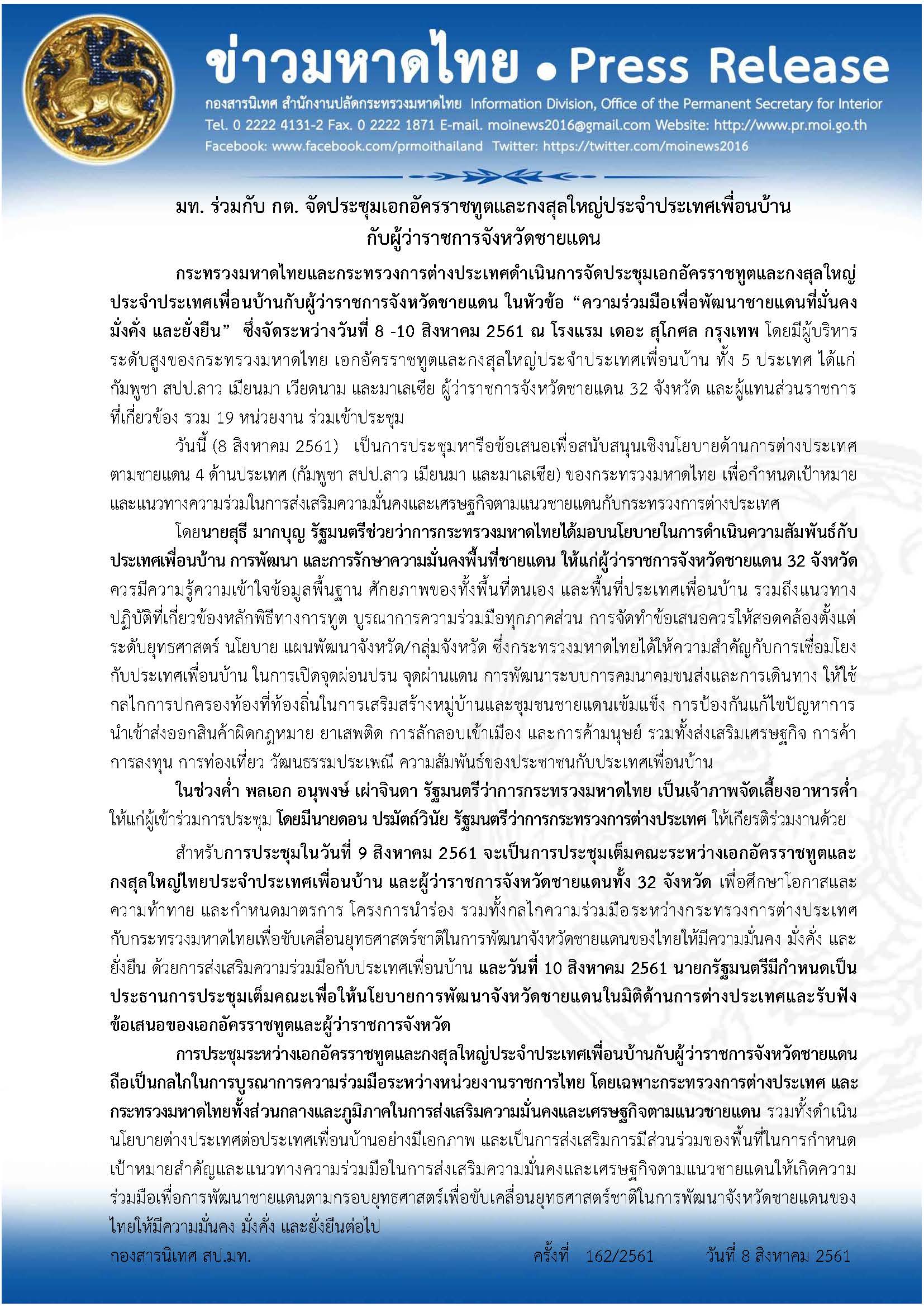 ข่าวมหาดไทย มท. ร่วมกับ กต. จัดประชุมเอกอัครราชทูตและกงสุลใหญ่ประจำประเทศเพื่อนบ้านกับผู้ว่าราชการจังหวัดชายแดน โดย กองสารนิเทศ สำนักงานปลัดกระทรวงมหาดไทย 9 สิงหาคม 2018 9 สิงหาคม 2018 12 ยอดวิว ก่อนหน้า มท. แถลงข่าวการจัดงาน ศิลปาชีพ OTOP ก้าวไกล ด้วยพระบารมี คาดเงินสะพัดกว่า 900 ล้านบาท ถัดไป มท. ผุดไอเดียรวมแอปพลิเคชั่นให้บริการของหน่วยงานไว้ในแอปพลิเคชั่นเดียว บทความที่เกี่ยวข้อง “อรรษิษฐ์ สัมพันธรัตน์” ปลัด มท. ประกา... 15 ธันวาคม 2025 สมเด็จพระกนิษฐาธิราชเจ้า กรมสมเด็จพระเทพรัตนราชสุด... 15 ธันวาคม 2025 มท.4 “ศศิธร” ลงพื้นที่ จ.เชียงใหม่ เปิ... 14 ธันวาคม 2025 “รมช.มท.ศักดิ์ดา” แถลง “ปิดกองบัญชาการ ปภ.ชาติ ส่ว... 14 ธันวาคม 2025 ผู้บัญชาการกองอาสารักษาดินแดน ขอบคุณและชื่นชมความเ... 13 ธันวาคม 2025 “รมช.มหาดไทย ศศิธร” เป็นประธานประชุมรัฐมนตรีอาเซีย... 13 ธันวาคม 2025 คกก.นโยบายลดอุบัติเหตุทางถนนแห่งชาติ เห็นชอบขับเคล... 12 ธันวาคม 2025 กระทรวงมหาดไทย บำเพ็ญกุศลปัญญาสมวาร 50 วัน อุทิศถว... 12 ธันวาคม 2025 สมเด็จพระกนิษฐาธิราชเจ้า กรมสมเด็จพระเทพรัตนราชสุด... 12 ธันวาคม 2025