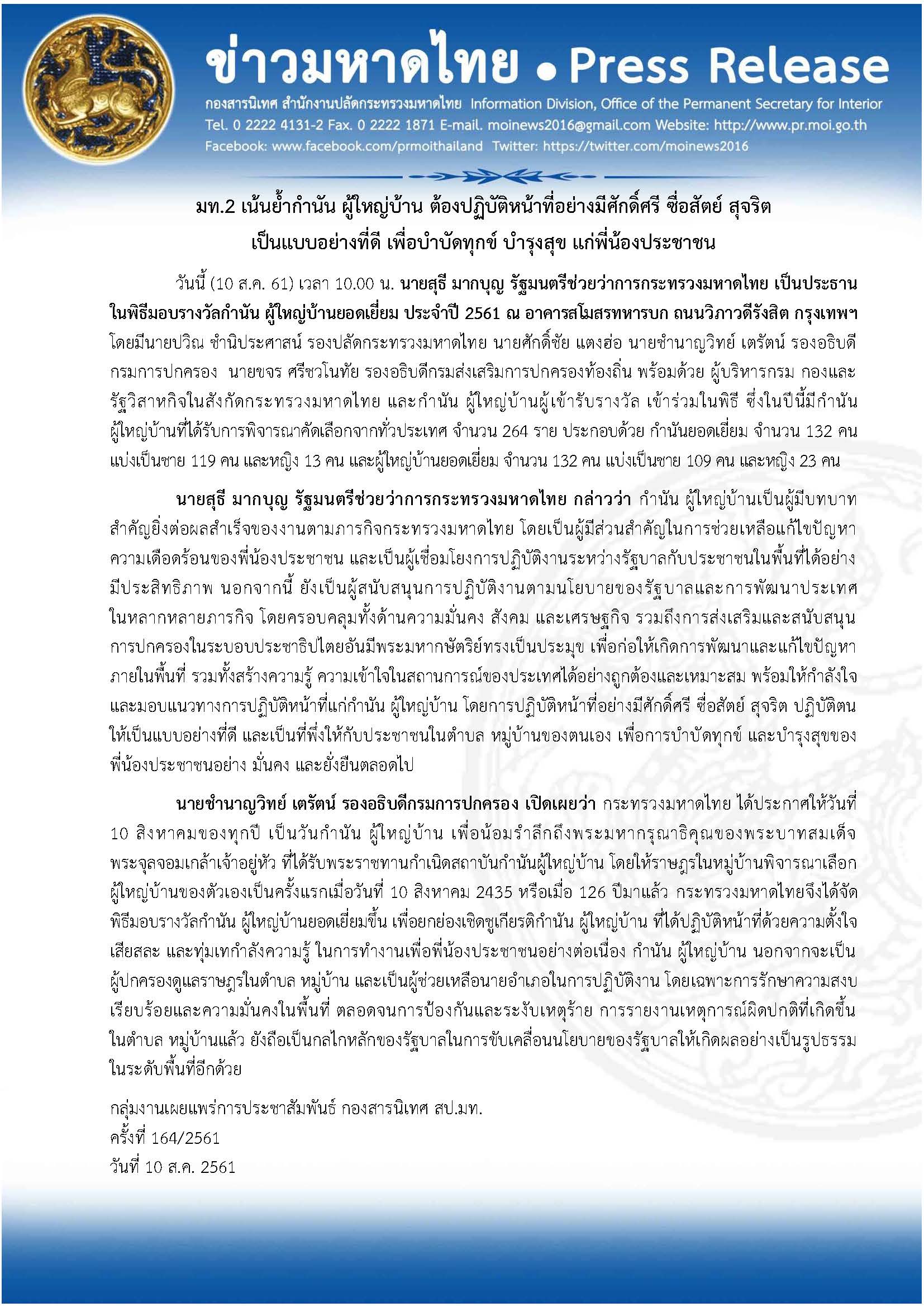 ข่าวมหาดไทย มท.2 เน้นย้ำกำนัน ผู้ใหญ่บ้าน ต้องปฏิบัติหน้าที่อย่างมีศักดิ์ศรี ซื่อสัตย์ สุจริต เป็นแบบอย่างที่ดี เพื่อบำบัดทุกข์ บำรุงสุข แก่พี่น้องประชาชน โดย กองสารนิเทศ สำนักงานปลัดกระทรวงมหาดไทย 10 สิงหาคม 2018 10 สิงหาคม 2018 32 ยอดวิว ก่อนหน้า มท. ผุดไอเดียรวมแอปพลิเคชั่นให้บริการของหน่วยงานไว้ในแอปพลิเคชั่นเดียว ถัดไป ศูนย์ต่อต้านการทุจริต มหาดไทย เดินหน้าเสริมอาวุธเครือข่ายฯ พร้อมยึด ป.ป.ช. เป็นต้นแบบ สานต่อการป้องกันปัญหาการทุจริตในภาครัฐ บทความที่เกี่ยวข้อง “มหาดไทย” ยกระดับเพิ่มประสิทธิภาพการตร... 15 ธันวาคม 2025 “รมช.มท.ก้อย-ศศิธร” แถลงข่าวมหกรรมของข... 15 ธันวาคม 2025 “อรรษิษฐ์ สัมพันธรัตน์” ปลัด มท. ประกา... 15 ธันวาคม 2025 สมเด็จพระกนิษฐาธิราชเจ้า กรมสมเด็จพระเทพรัตนราชสุด... 15 ธันวาคม 2025 มท.4 “ศศิธร” ลงพื้นที่ จ.เชียงใหม่ เปิ... 14 ธันวาคม 2025 “รมช.มท.ศักดิ์ดา” แถลง “ปิดกองบัญชาการ ปภ.ชาติ ส่ว... 14 ธันวาคม 2025 ผู้บัญชาการกองอาสารักษาดินแดน ขอบคุณและชื่นชมความเ... 13 ธันวาคม 2025 “รมช.มหาดไทย ศศิธร” เป็นประธานประชุมรัฐมนตรีอาเซีย... 13 ธันวาคม 2025 คกก.นโยบายลดอุบัติเหตุทางถนนแห่งชาติ เห็นชอบขับเคล... 12 ธันวาคม 2025