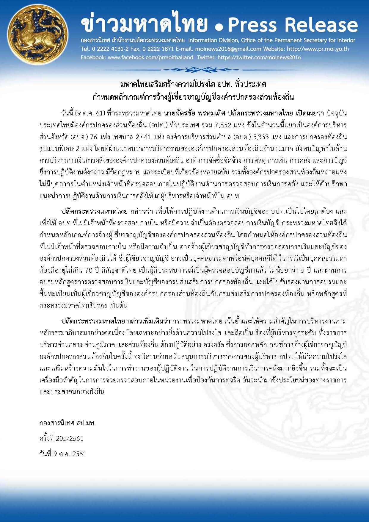 ข่าวมหาดไทย มหาดไทยเสริมสร้างความโปร่งใส อปท. ทั่วประเทศ กำหนดหลักเกณฑ์การจ้างผู้เชี่ยวชาญบัญชีองค์กรปกครองส่วนท้องถิ่น โดย กองสารนิเทศ สำนักงานปลัดกระทรวงมหาดไทย 9 ตุลาคม 2018 9 ตุลาคม 2018 8 ยอดวิว ก่อนหน้า มท.1 เป็นประธานการประชุมคณะกรรมการศูนย์อำนวยการความปลอดภัยทางถนน พิจารณา (ร่าง) แผนบูรณาการป้องกันและลดอุบัติเหตทางถนนช่วงเทศกาลปีใหม่ 62 เพื่อร่วมกันสร้างการสัญจรที่ปลอดภัย ถัดไป ปลัดกระทรวงมหาดไทย รับมอบผ้าห่มกันหนาว จำนวน 200,000 ผืน ตามโครงการ “ไทยเบฟ รวมใจต้านภัยหนาว” ปีที่ 19 บทความที่เกี่ยวข้อง กระทรวงมหาดไทย โค้ชชิ่ง “ต้นกล้าข้าราชการ” รุ่นที่... 17 ธันวาคม 2025 “มหาดไทย” ร่วมขับเคลื่อนเศรษฐกิจระหว่า... 16 ธันวาคม 2025 กระทรวงมหาดไทย เดินหน้าขยายผล “One Plan̶... 16 ธันวาคม 2025 “มหาดไทย” ยกระดับเพิ่มประสิทธิภาพการตร... 15 ธันวาคม 2025 “รมช.มท.ก้อย-ศศิธร” แถลงข่าวมหกรรมของข... 15 ธันวาคม 2025 “อรรษิษฐ์ สัมพันธรัตน์” ปลัด มท. ประกา... 15 ธันวาคม 2025 สมเด็จพระกนิษฐาธิราชเจ้า กรมสมเด็จพระเทพรัตนราชสุด... 15 ธันวาคม 2025 มท.4 “ศศิธร” ลงพื้นที่ จ.เชียงใหม่ เปิ... 14 ธันวาคม 2025 “รมช.มท.ศักดิ์ดา” แถลง “ปิดกองบัญชาการ ปภ.ชาติ ส่ว... 14 ธันวาคม 2025