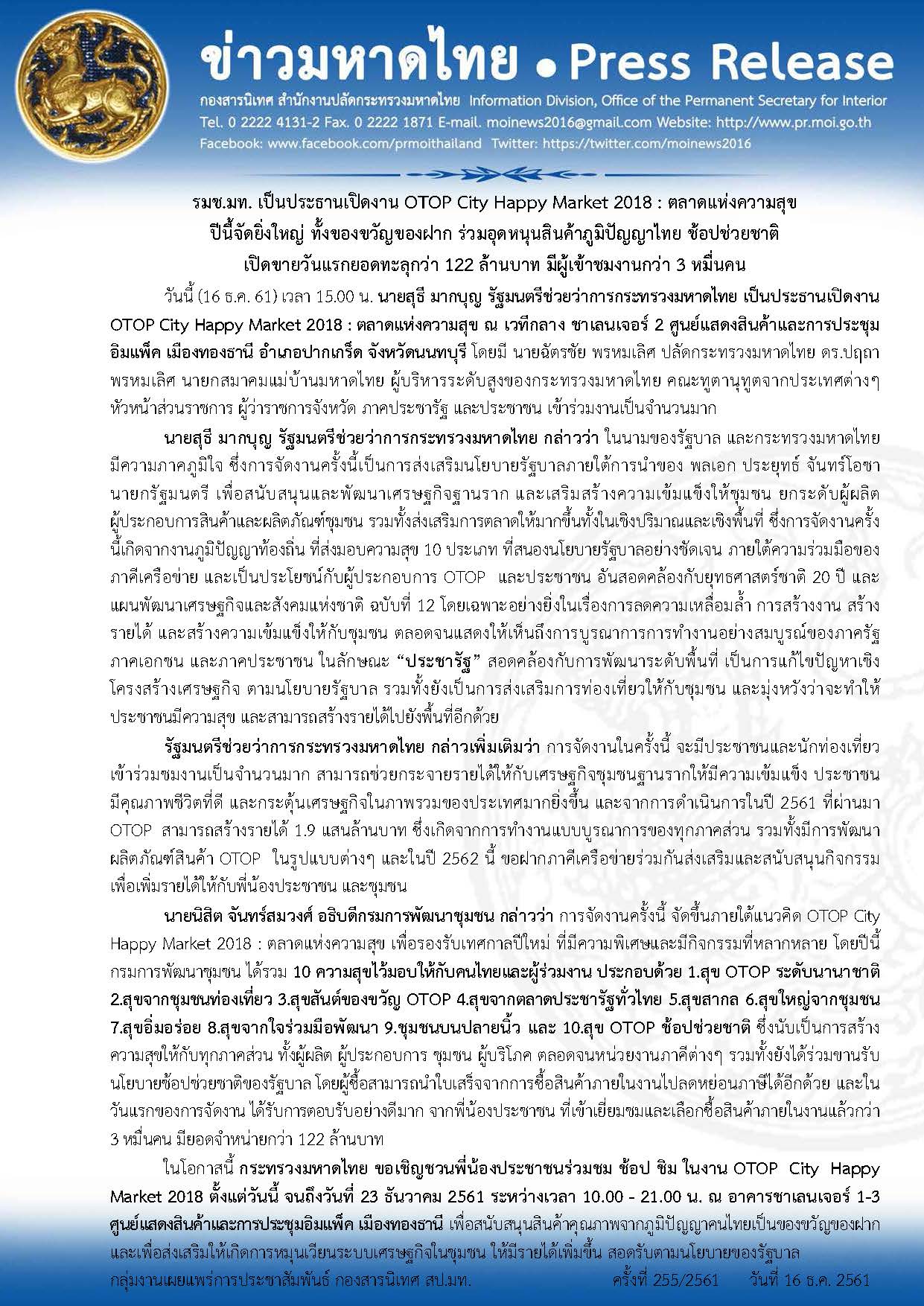 ข่าวมหาดไทย รมช.มท. เป็นประธานเปิดงาน OTOP City Happy Market 2018 : ตลาดแห่งความสุข ปีนี้จัดยิ่งใหญ่ ทั้งของขวัญของฝาก ร่วมอุดหนุนสินค้าภูมิปัญญาไทย ช้อปช่วยชาติ เปิดขายวันแรกยอดทะลุกว่า 122 ล้านบาท มีผู้เข้าชมงานกว่า 3 หมื่นคน โดย กองสารนิเทศ สำนักงานปลัดกระทรวงมหาดไทย 17 ธันวาคม 2018 17 ธันวาคม 2018 22 ยอดวิว ก่อนหน้า มหาดไทย เดินหน้าเสริมทักษะข้าราชการระดับต้น เพิ่มประสิทธิภาพการทำงาน เพื่อก้าวทันการเปลี่ยนแปลง ขานรับนโยบาย “THAILAND 4.0” ถัดไป มหาดไทย จัดสัมมนาเพิ่มประสิทธิภาพการทำงานผู้ตรวจราชการหน่วยงานในสังกัด เน้นถูกต้อง โปร่งใส ตรวจสอบได้ และสร้างความมั่นใจให้กับประชาชน บทความที่เกี่ยวข้อง มท.4 “ศศิธร” ลงพื้นที่ จ.เชียงใหม่ เปิ... 14 ธันวาคม 2025 “รมช.มท.ศักดิ์ดา” แถลง “ปิดกองบัญชาการ ปภ.ชาติ ส่ว... 14 ธันวาคม 2025 ผู้บัญชาการกองอาสารักษาดินแดน ขอบคุณและชื่นชมความเ... 13 ธันวาคม 2025 “รมช.มหาดไทย ศศิธร” เป็นประธานประชุมรัฐมนตรีอาเซีย... 13 ธันวาคม 2025 คกก.นโยบายลดอุบัติเหตุทางถนนแห่งชาติ เห็นชอบขับเคล... 12 ธันวาคม 2025 กระทรวงมหาดไทย บำเพ็ญกุศลปัญญาสมวาร 50 วัน อุทิศถว... 12 ธันวาคม 2025 สมเด็จพระกนิษฐาธิราชเจ้า กรมสมเด็จพระเทพรัตนราชสุด... 12 ธันวาคม 2025 รมช.มหาดไทย “ศศิธร” ให้การต้อนรับคณะรั... 12 ธันวาคม 2025 หอการค้าไทยและสภาหอการค้าแห่งประเทศไทย ยกย่องเชิดช... 12 ธันวาคม 2025