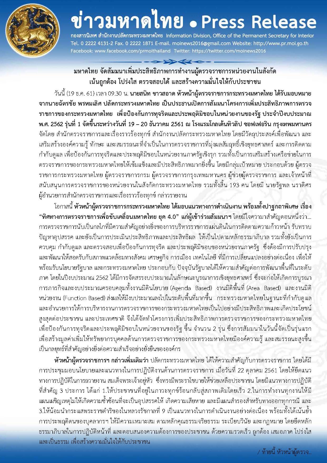 ข่าวมหาดไทย มหาดไทย จัดสัมมนาเพิ่มประสิทธิภาพการทำงานผู้ตรวจราชการหน่วยงานในสังกัด เน้นถูกต้อง โปร่งใส ตรวจสอบได้ และสร้างความมั่นใจให้กับประชาชน โดย กองสารนิเทศ สำนักงานปลัดกระทรวงมหาดไทย 19 ธันวาคม 2018 19 ธันวาคม 2018 6 ยอดวิว ก่อนหน้า รมช.มท. เป็นประธานเปิดงาน OTOP City Happy Market 2018 : ตลาดแห่งความสุข ปีนี้จัดยิ่งใหญ่ ทั้งของขวัญของฝาก ร่วมอุดหนุนสินค้าภูมิปัญญาไทย ช้อปช่วยชาติ เปิดขายวันแรกยอดทะลุกว่า 122 ล้านบาท มีผู้เข้าชมงานกว่า 3 หมื่นคน ถัดไป มท. เร่งขับเคลื่อนกลไกดำเนินความสัมพันธ์เมืองพี่เมืองน้อง (Sister City) ในระดับจังหวัด บทความที่เกี่ยวข้อง มท.4 “ศศิธร” ลงพื้นที่ จ.เชียงใหม่ เปิ... 14 ธันวาคม 2025 “รมช.มท.ศักดิ์ดา” แถลง “ปิดกองบัญชาการ ปภ.ชาติ ส่ว... 14 ธันวาคม 2025 ผู้บัญชาการกองอาสารักษาดินแดน ขอบคุณและชื่นชมความเ... 13 ธันวาคม 2025 “รมช.มหาดไทย ศศิธร” เป็นประธานประชุมรัฐมนตรีอาเซีย... 13 ธันวาคม 2025 คกก.นโยบายลดอุบัติเหตุทางถนนแห่งชาติ เห็นชอบขับเคล... 12 ธันวาคม 2025 กระทรวงมหาดไทย บำเพ็ญกุศลปัญญาสมวาร 50 วัน อุทิศถว... 12 ธันวาคม 2025 สมเด็จพระกนิษฐาธิราชเจ้า กรมสมเด็จพระเทพรัตนราชสุด... 12 ธันวาคม 2025 รมช.มหาดไทย “ศศิธร” ให้การต้อนรับคณะรั... 12 ธันวาคม 2025 หอการค้าไทยและสภาหอการค้าแห่งประเทศไทย ยกย่องเชิดช... 12 ธันวาคม 2025