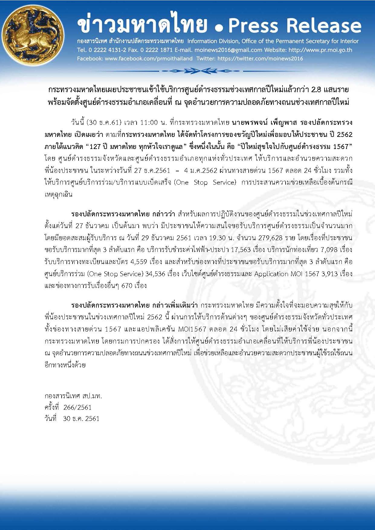 ข่าวมหาดไทย กระทรวงมหาดไทยเผยประชาชนเข้าใช้บริการศูนย์ดำรงธรรมช่วงเทศกาลปีใหม่แล้วกว่า 2.8 แสนราย พร้อมจัดตั้งศูนย์ดำรงธรรมอำเภอเคลื่อนที่ ณ จุดอำนวยการความปลอดภัยทางถนนช่วงเทศกาลปีใหม่ โดย กองสารนิเทศ สำนักงานปลัดกระทรวงมหาดไทย 2 มกราคม 2019 2 มกราคม 2019 16 ยอดวิว ก่อนหน้า กระทรวงมหาดไทย เชิญชวนพี่น้องประชาชนทั่วประเทศ เข้าร่วมกิจกรรม “สวดมนต์ข้ามปี ถวายพระราชกุศล เสริมสิริมงคลทั่วโลก” ส่งท้ายปีเก่า ต้อนรับปีใหม่ 2562 เพื่อความเป็นสิริมงคล เสริมบารมีให้แก่ตนเองและครอบครัว ถัดไป กระทรวงมหาดไทย ร่วมกับ วัดราชบพิธสถิตมหาสีมาราม จัดกิจกรรม “สวดมนต์ข้ามปี ถวายพระราชกุศล เสริมสิริมงคลทั่วโลก” ต้อนรับปีใหม่ พ.ศ. 2562 บทความที่เกี่ยวข้อง “ปลัดมหาดไทย” จับมือ 23 หน่วยงาน ลงนาม... 29 เมษายน 2026 ปลัดมหาดไทย “อรรษิษฐ์ สัมพันธรัตน์” นั... 29 เมษายน 2026 มหาดไทย-กปร. Kick off นำคู่มือขับเคลื่อนโครงการอัน... 29 เมษายน 2026 มท. ร่วมขับเคลื่อน ‘โครงการหมู่บ้านสหกรณ์สัน... 29 เมษายน 2026 ที่ปรึกษา มท.1 “ศักดิ์ดา วิเชียรศิลป์”... 29 เมษายน 2026 กระทรวงมหาดไทย ร่วมหนุนส่งเสริม “New Gen คุณ... 29 เมษายน 2026 “นายกฯ อนุทิน” นำคณะ ถวายมุทิตาสักการะ... 29 เมษายน 2026 รองปลัดมหาดไทยฝ่ายความมั่นคงนั่งหัวโต๊ะถกภารกิจควา... 29 เมษายน 2026 รมช.มท. “พลพีร์” เปิดประชุมสุดยอดผู้นําเมือง... 29 เมษายน 2026