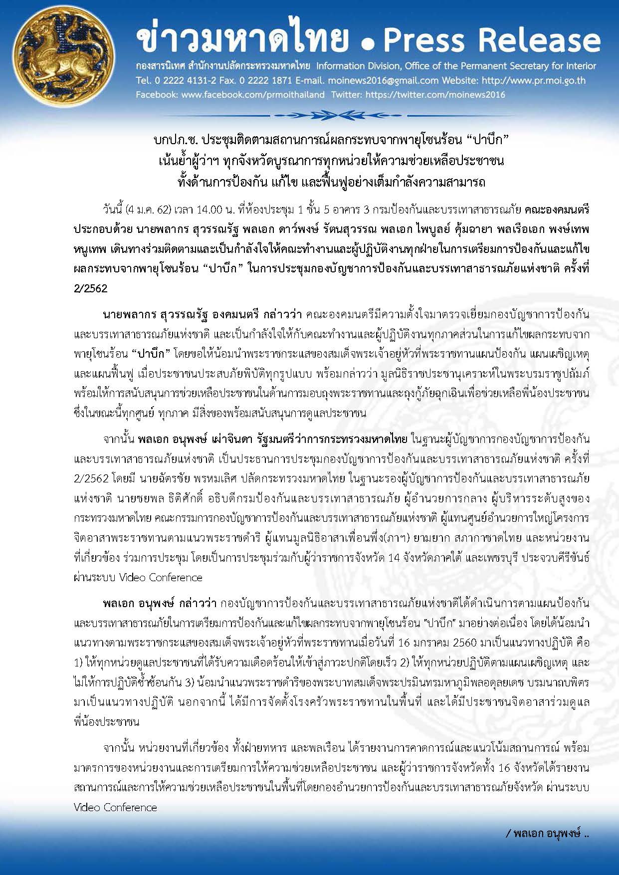 ข่าวมหาดไทย บกปภ.ช. ประชุมติดตามสถานการณ์ผลกระทบจากพายุโซนร้อน “ปาบึก” เน้นย้ำผู้ว่าฯ ทุกจังหวัดบูรณาการทุกหน่วยให้ความช่วยเหลือประชาชน ทั้งด้านการป้องกัน แก้ไข และฟื้นฟูอย่างเต็มกำลังความสามารถ โดย กองสารนิเทศ สำนักงานปลัดกระทรวงมหาดไทย 4 มกราคม 2019 4 มกราคม 2019 9 ยอดวิว ก่อนหน้า มหาดไทย จัดอบรมเพิ่มพูนความรู้ และเสริมทักษะข้าราชการระดับต้น เพิ่มประสิทธิภาพการทำงาน พร้อมเป็นกลไกขับเคลื่อนในระดับพื้นที่ ถัดไป มท. เริ่มต้นแผนรณรงค์ แยกขยะก่อนทิ้งคึกคัก ชวนคนไทยทั้งประเทศเปลี่ยนเมืองไทยไปด้วยกัน บทความที่เกี่ยวข้อง “ปลัดมหาดไทย” จับมือ 23 หน่วยงาน ลงนาม... 29 เมษายน 2026 ปลัดมหาดไทย “อรรษิษฐ์ สัมพันธรัตน์” นั... 29 เมษายน 2026 มหาดไทย-กปร. Kick off นำคู่มือขับเคลื่อนโครงการอัน... 29 เมษายน 2026 มท. ร่วมขับเคลื่อน ‘โครงการหมู่บ้านสหกรณ์สัน... 29 เมษายน 2026 ที่ปรึกษา มท.1 “ศักดิ์ดา วิเชียรศิลป์”... 29 เมษายน 2026 กระทรวงมหาดไทย ร่วมหนุนส่งเสริม “New Gen คุณ... 29 เมษายน 2026 “นายกฯ อนุทิน” นำคณะ ถวายมุทิตาสักการะ... 29 เมษายน 2026 รองปลัดมหาดไทยฝ่ายความมั่นคงนั่งหัวโต๊ะถกภารกิจควา... 29 เมษายน 2026 รมช.มท. “พลพีร์” เปิดประชุมสุดยอดผู้นําเมือง... 29 เมษายน 2026