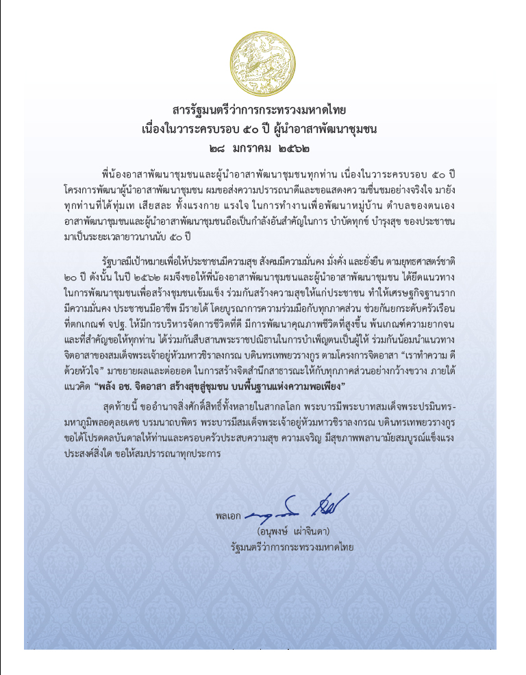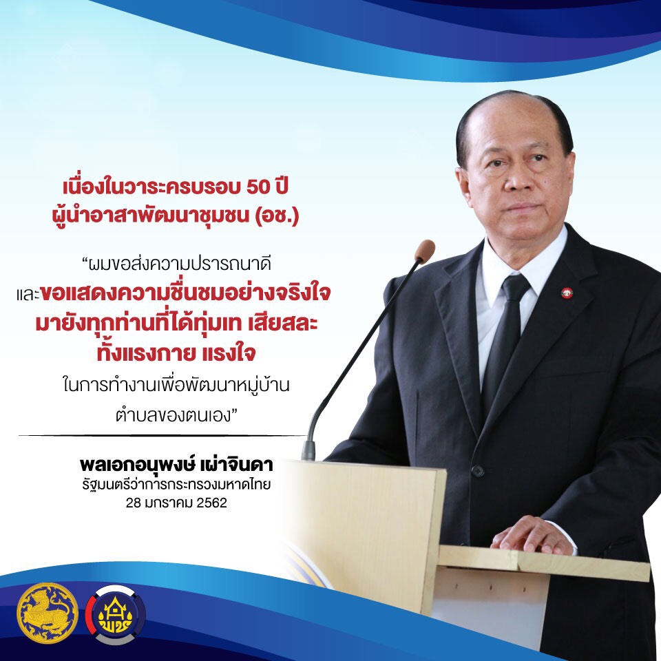 ชุดคำพูด/Infographic (รมว.มท./รมช.มท.) รมว.มท. ส่งสารเนื่องในวารครบรอบ 50 ปี “ผู้นำอาสาพัฒนาชุมชน” 28 มกราคม 2562 โดย กองสารนิเทศ สำนักงานปลัดกระทรวงมหาดไทย 29 มกราคม 2019 29 มกราคม 2019 22 ยอดวิว ก่อนหน้า รองปลัดกระทรวงมหาดไทย เป็นประธานเปิดการศึกษาอบรมหลักสูตร บ.มท. รุ่นที่ 32 ย้ำต้องหมั่นศึกษาเรียนรู้งานในหน้าที่ และเป็นกลไกสำคัญขับเคลื่อนงาน เพื่อประโยชน์ส่วนรวมเป็นสำคัญ ถัดไป มท. เดินหน้าแนวทางป้องกันและแก้ไขปัญหายาเสพติดเชิงรุก สั่งการ 9 จังหวัดนำร่อง ใช้ “กาฬสินธุ์โมเดล” เป็นต้นแบบดำเนินงาน บทความที่เกี่ยวข้อง ศก.พอเพียง 15 กุมภาพันธ์ 2016 ภัยแล้ง 15 กุมภาพันธ์ 2016 ประจำสัปดาห์ วันศุกร์ที่ 12 ก.พ. 59 15 กุมภาพันธ์ 2016 ประจำสัปดาห์ วันศุกร์ที่ 12 ก.พ. 59 15 กุมภาพันธ์ 2016 ประจำสัปดาห์ วันศุกร์ที่ 12 ก.พ. 59 15 กุมภาพันธ์ 2016