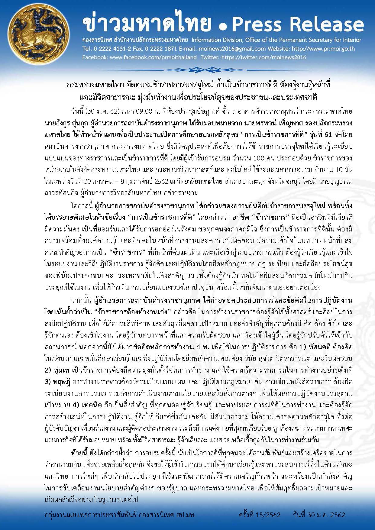 ข่าวมหาดไทย กระทรวงมหาดไทย จัดอบรมข้าราชการบรรจุใหม่ ย้ำเป็นข้าราชการที่ดี ต้องรู้งานรู้หน้าที่ และมีจิตสาธารณะ มุ่งมั่นทำงานเพื่อประโยชน์สุขของประชาชนและประเทศชาติ โดย กองสารนิเทศ สำนักงานปลัดกระทรวงมหาดไทย 31 มกราคม 2019 31 มกราคม 2019 9 ยอดวิว ก่อนหน้า มท. เดินหน้าแนวทางป้องกันและแก้ไขปัญหายาเสพติดเชิงรุก สั่งการ 9 จังหวัดนำร่อง ใช้ “กาฬสินธุ์โมเดล” เป็นต้นแบบดำเนินงาน ถัดไป รัฐมนตรีว่าการกระทรวงมหาดไทย ประชุม VCS หารือผู้ว่าฯ 6 จังหวัด เตรียมมาตรการบรรเทาผลกระทบจากฝุ่นละออง PM 2.5 บทความที่เกี่ยวข้อง “มหาดไทย” ยกระดับเพิ่มประสิทธิภาพการตร... 15 ธันวาคม 2025 “รมช.มท.ก้อย-ศศิธร” แถลงข่าวมหกรรมของข... 15 ธันวาคม 2025 “อรรษิษฐ์ สัมพันธรัตน์” ปลัด มท. ประกา... 15 ธันวาคม 2025 สมเด็จพระกนิษฐาธิราชเจ้า กรมสมเด็จพระเทพรัตนราชสุด... 15 ธันวาคม 2025 มท.4 “ศศิธร” ลงพื้นที่ จ.เชียงใหม่ เปิ... 14 ธันวาคม 2025 “รมช.มท.ศักดิ์ดา” แถลง “ปิดกองบัญชาการ ปภ.ชาติ ส่ว... 14 ธันวาคม 2025 ผู้บัญชาการกองอาสารักษาดินแดน ขอบคุณและชื่นชมความเ... 13 ธันวาคม 2025 “รมช.มหาดไทย ศศิธร” เป็นประธานประชุมรัฐมนตรีอาเซีย... 13 ธันวาคม 2025 คกก.นโยบายลดอุบัติเหตุทางถนนแห่งชาติ เห็นชอบขับเคล... 12 ธันวาคม 2025