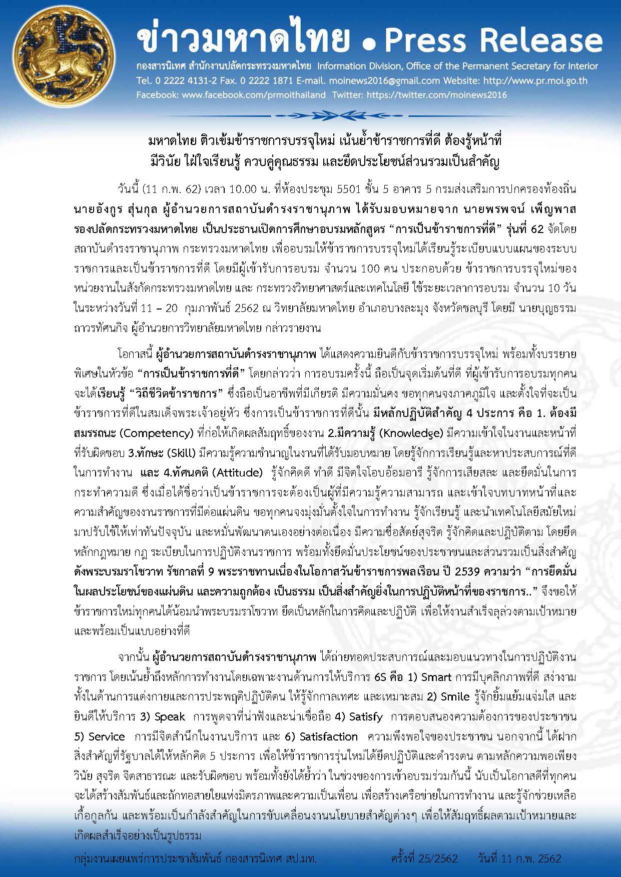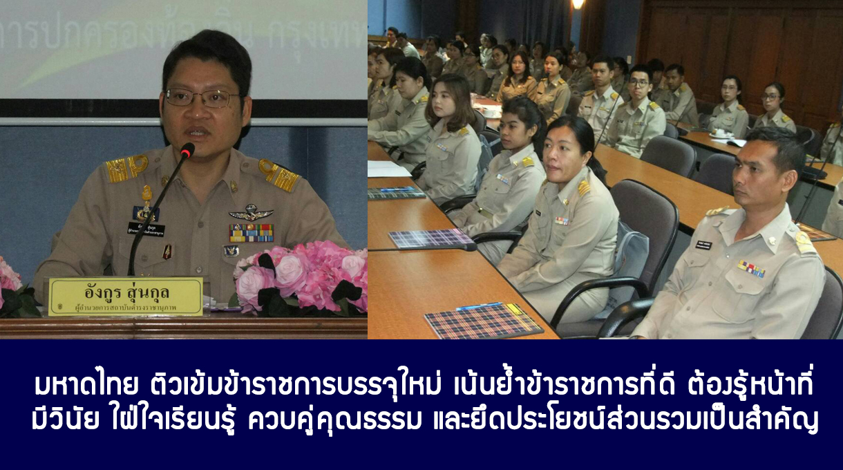 ข่าวมหาดไทย มหาดไทย ติวเข้มข้าราชการบรรจุใหม่ เน้นย้ำข้าราชการที่ดี ต้องรู้หน้าที่ มีวินัย ใฝ่ใจเรียนรู้ ควบคู่คุณธรรม และยึดประโยชน์ส่วนรวมเป็นสำคัญ โดย กองสารนิเทศ สำนักงานปลัดกระทรวงมหาดไทย 11 กุมภาพันธ์ 2019 11 กุมภาพันธ์ 2019 6 ยอดวิว ก่อนหน้า มท. หารือร่วม พน. ยุทธศาสตร์ชาติและแผนด้านพลังงาน ถัดไป มท. ร่วมกับ 22 หน่วยงาน ลงนามบันทึกข้อตกลง “ความร่วมมือเสริมสร้างการรับรู้สู่ชุมชน” เสริมสร้างการรับรู้ให้กับประชาชน เพื่อการพัฒนาที่ยั่งยืน บทความที่เกี่ยวข้อง ผู้บัญชาการกองอาสารักษาดินแดน ขอบคุณและชื่นชมความเ... 13 ธันวาคม 2025 “รมช.มหาดไทย ศศิธร” เป็นประธานประชุมรัฐมนตรีอาเซีย... 13 ธันวาคม 2025 คกก.นโยบายลดอุบัติเหตุทางถนนแห่งชาติ เห็นชอบขับเคล... 12 ธันวาคม 2025 กระทรวงมหาดไทย บำเพ็ญกุศลปัญญาสมวาร 50 วัน อุทิศถว... 12 ธันวาคม 2025 สมเด็จพระกนิษฐาธิราชเจ้า กรมสมเด็จพระเทพรัตนราชสุด... 12 ธันวาคม 2025 รมช.มหาดไทย “ศศิธร” ให้การต้อนรับคณะรั... 12 ธันวาคม 2025 หอการค้าไทยและสภาหอการค้าแห่งประเทศไทย ยกย่องเชิดช... 12 ธันวาคม 2025 องคมนตรี เป็นประธานในพิธีบำเพ็ญกุศลอุทิศถวายแด่ พร... 11 ธันวาคม 2025 มท.2 “ทรงศักดิ์ ทองศรี” ลงพื้นที่จังหว... 11 ธันวาคม 2025