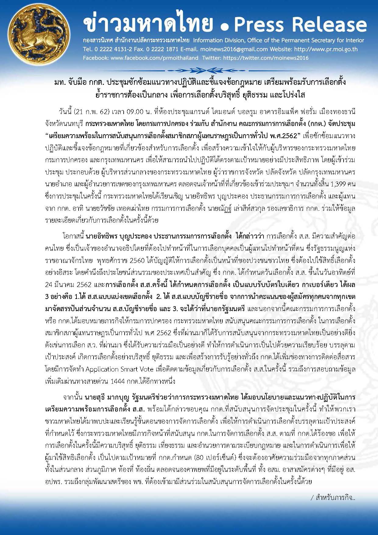 ข่าวมหาดไทย มท. จับมือ กกต. ประชุมซักซ้อมแนวทางปฏิบัติและชี้แจงข้อกฎหมาย เตรียมพร้อมรับการเลือกตั้ง ย้ำราชการต้องเป็นกลาง เพื่อการเลือกตั้งบริสุทธิ์ ยุติธรรม และโปร่งใส โดย กองสารนิเทศ สำนักงานปลัดกระทรวงมหาดไทย 21 กุมภาพันธ์ 2019 21 กุมภาพันธ์ 2019 4 ยอดวิว ก่อนหน้า กระทรวงมหาดไทยติวเข้มเจ้าหน้าที่ศูนย์ดำรงธรรม เน้นย้ำ “ต้องคิดแบบราชการ พัฒนางานบริการเพื่อเพิ่มความสุขให้ประชาชน” ถัดไป มท.2 เน้นย้ำ กปภ. มุ่งพัฒนาองค์ความรู้ด้านกิจการน้ำประปา เพื่อนำไปต่อยอดให้ อปท. ชี้ต้องยึดหลักธรรมาภิบาล ความรวดเร็ว ถูกต้อง เสมอภาค โปร่งใส ในการทำงาน บทความที่เกี่ยวข้อง “มหาดไทย” ยกระดับเพิ่มประสิทธิภาพการตร... 15 ธันวาคม 2025 “รมช.มท.ก้อย-ศศิธร” แถลงข่าวมหกรรมของข... 15 ธันวาคม 2025 “อรรษิษฐ์ สัมพันธรัตน์” ปลัด มท. ประกา... 15 ธันวาคม 2025 สมเด็จพระกนิษฐาธิราชเจ้า กรมสมเด็จพระเทพรัตนราชสุด... 15 ธันวาคม 2025 มท.4 “ศศิธร” ลงพื้นที่ จ.เชียงใหม่ เปิ... 14 ธันวาคม 2025 “รมช.มท.ศักดิ์ดา” แถลง “ปิดกองบัญชาการ ปภ.ชาติ ส่ว... 14 ธันวาคม 2025 ผู้บัญชาการกองอาสารักษาดินแดน ขอบคุณและชื่นชมความเ... 13 ธันวาคม 2025 “รมช.มหาดไทย ศศิธร” เป็นประธานประชุมรัฐมนตรีอาเซีย... 13 ธันวาคม 2025 คกก.นโยบายลดอุบัติเหตุทางถนนแห่งชาติ เห็นชอบขับเคล... 12 ธันวาคม 2025