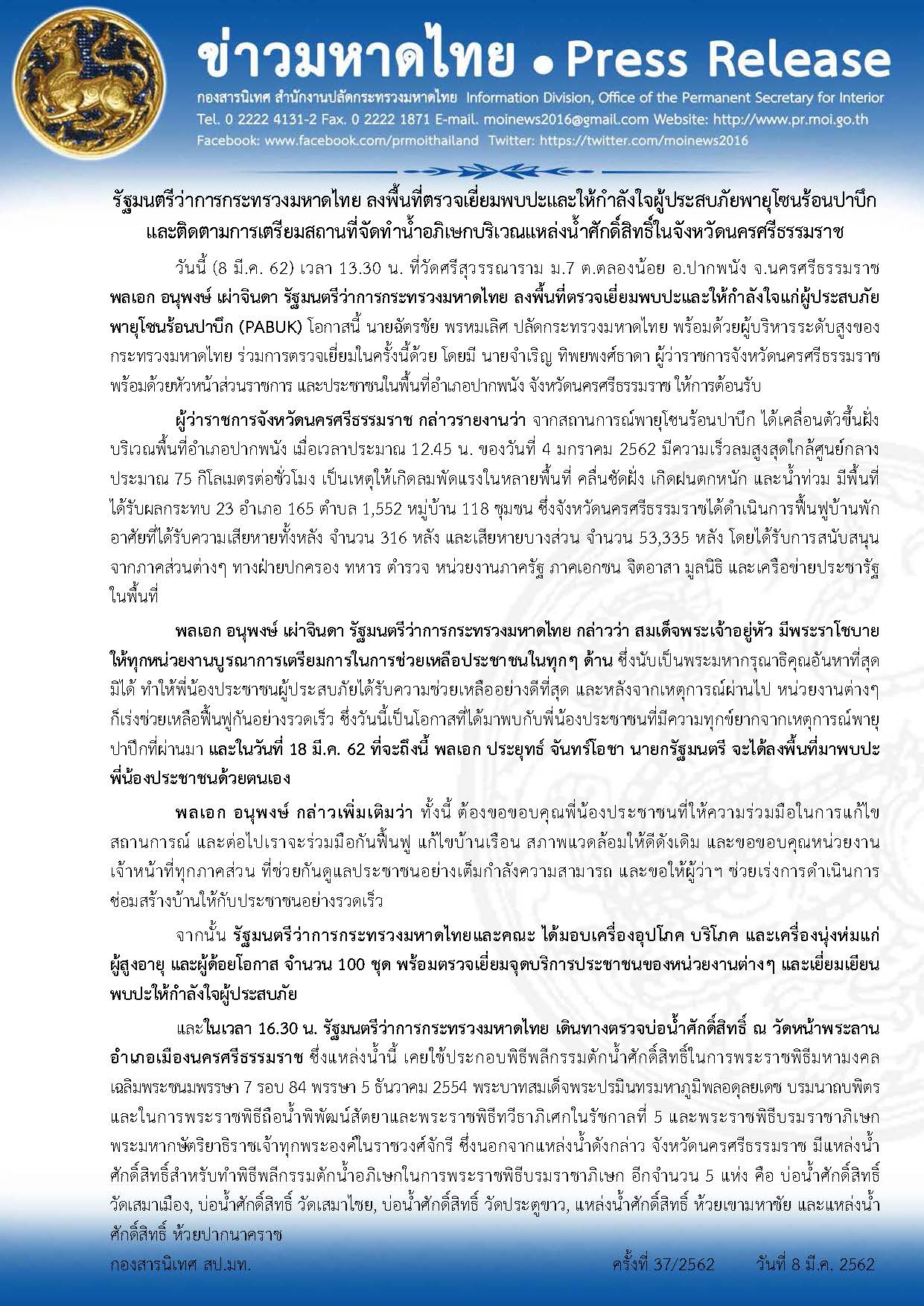 ข่าวมหาดไทย รัฐมนตรีว่าการกระทรวงมหาดไทย ลงพื้นที่ตรวจเยี่ยมพบปะและให้กำลังใจผู้ประสบภัยพายุโซนร้อนปาบึก และติดตามการเตรียมสถานที่จัดทำน้ำอภิเษกบริเวณแหล่งน้ำศักดิ์สิทธิ์ในจังหวัดนครศรีธรรมราช โดย กองสารนิเทศ สำนักงานปลัดกระทรวงมหาดไทย 13 มีนาคม 2019 13 มีนาคม 2019 5 ยอดวิว ก่อนหน้า รัฐมนตรีว่าการกระทรวงมหาดไทย ลงพื้นที่ติดตามการเตรียมการจัดทำน้ำอภิเษก และการดำเนินงาน ภารกิจสำคัญของกระทรวงมหาดไทยและนโยบายของรัฐบาลร่วมกับผู้ว่าราชการจังหวัด 14 จังหวัดภาคใต้ ถัดไป มหาดไทยเผยรายชื่อ 108 แหล่งน้ำศักดิ์สิทธิ์ทั่วประเทศ สำหรับประกอบพิธีพลีกรรมตักน้ำ เพื่อจัดทำน้ำอภิเษกในการพระราชพิธีบรมราชาภิเษก บทความที่เกี่ยวข้อง กระทรวงมหาดไทย โค้ชชิ่ง “ต้นกล้าข้าราชการ” รุ่นที่... 17 ธันวาคม 2025 “มหาดไทย” ร่วมขับเคลื่อนเศรษฐกิจระหว่า... 16 ธันวาคม 2025 กระทรวงมหาดไทย เดินหน้าขยายผล “One Plan̶... 16 ธันวาคม 2025 “มหาดไทย” ยกระดับเพิ่มประสิทธิภาพการตร... 15 ธันวาคม 2025 “รมช.มท.ก้อย-ศศิธร” แถลงข่าวมหกรรมของข... 15 ธันวาคม 2025 “อรรษิษฐ์ สัมพันธรัตน์” ปลัด มท. ประกา... 15 ธันวาคม 2025 สมเด็จพระกนิษฐาธิราชเจ้า กรมสมเด็จพระเทพรัตนราชสุด... 15 ธันวาคม 2025 มท.4 “ศศิธร” ลงพื้นที่ จ.เชียงใหม่ เปิ... 14 ธันวาคม 2025 “รมช.มท.ศักดิ์ดา” แถลง “ปิดกองบัญชาการ ปภ.ชาติ ส่ว... 14 ธันวาคม 2025